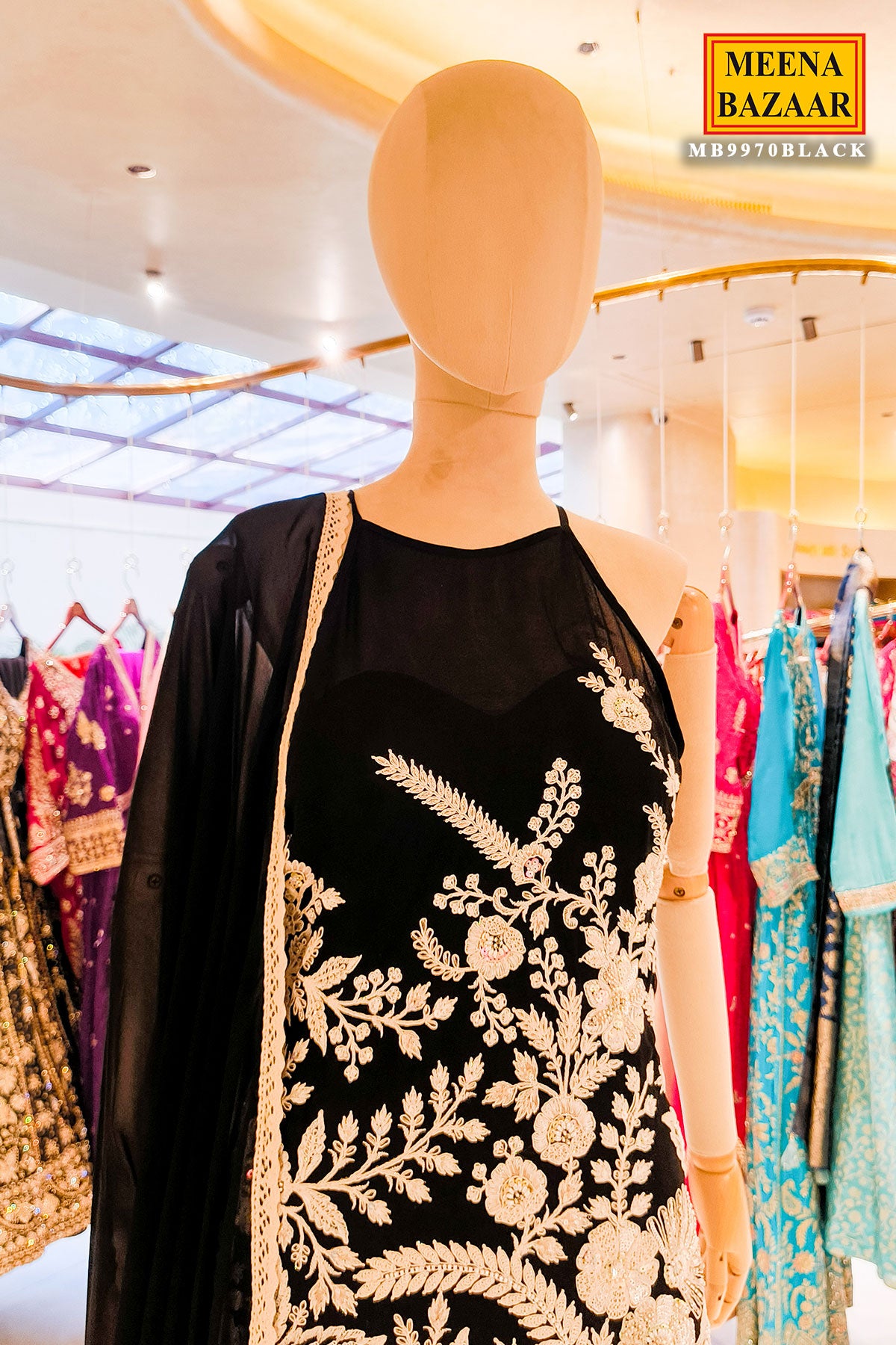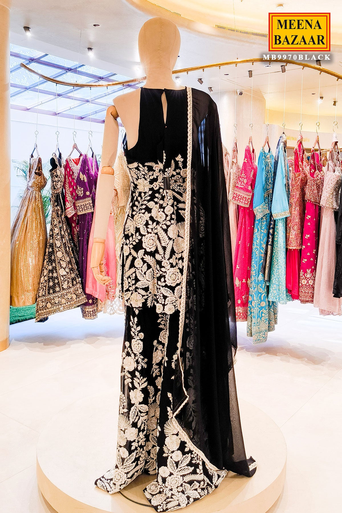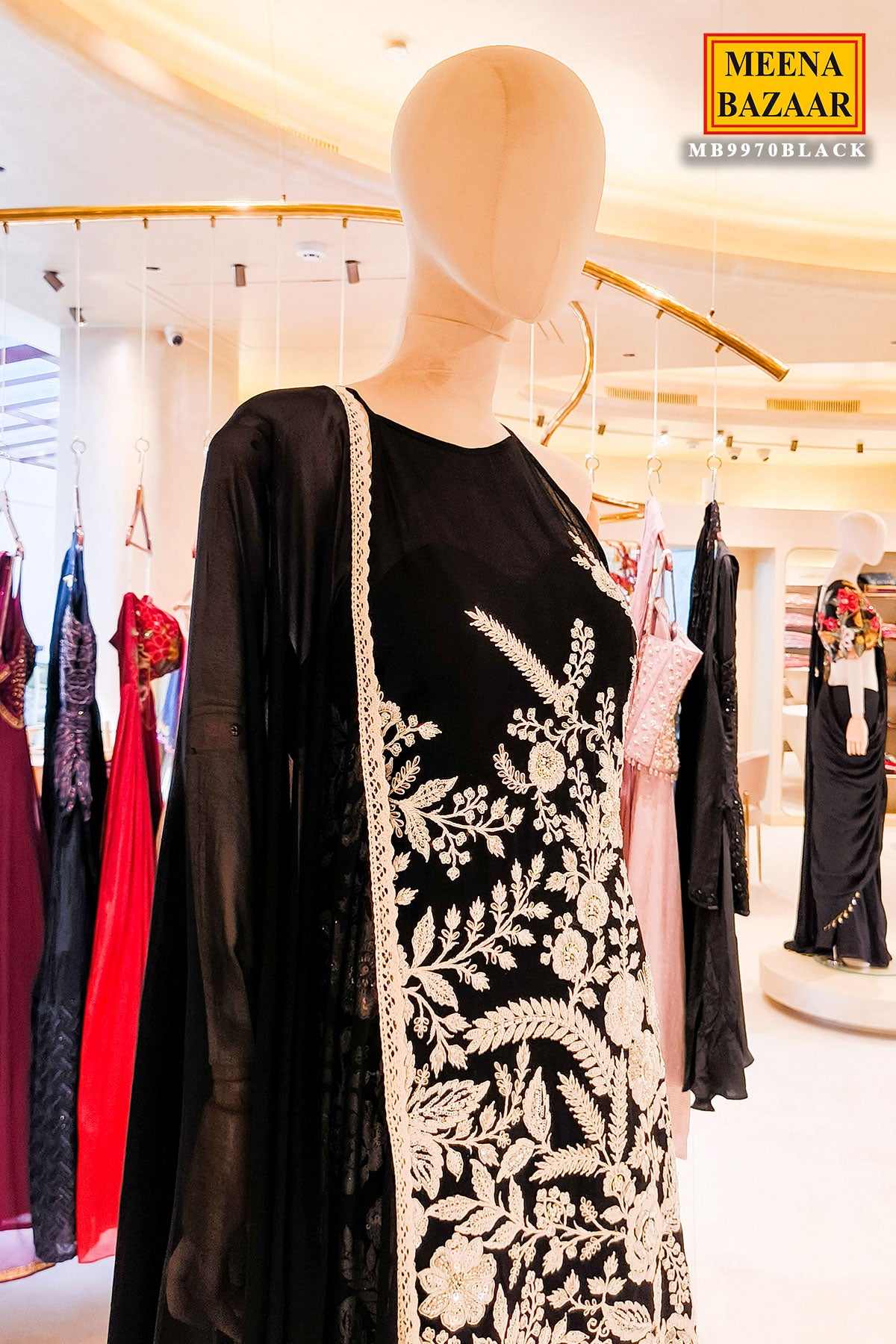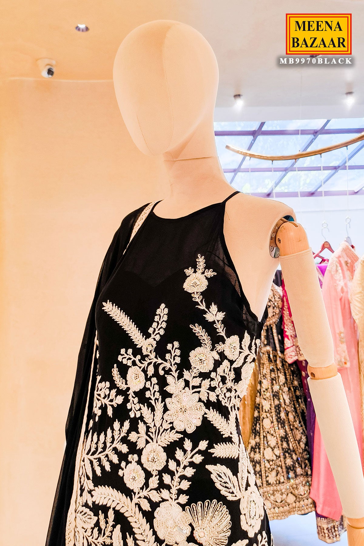 This striking black embroidered ensemble is designed to embody regal elegance and contemporary sophistication. The outfit features intricate ivory floral and botanical embroidery that creates a stunning contrast against the deep black base. The detailed work extends across the bodice and wide leg palazzo , while the sheer black dupatta with a delicate border adds movement and refinement. The graceful silhouette and ornate embellishment make it an ideal choice for wedding festivities, formal soirées, or special evening occasions where timeless glamour and statement style are desired.
