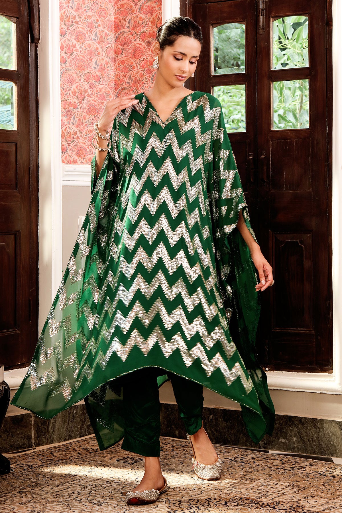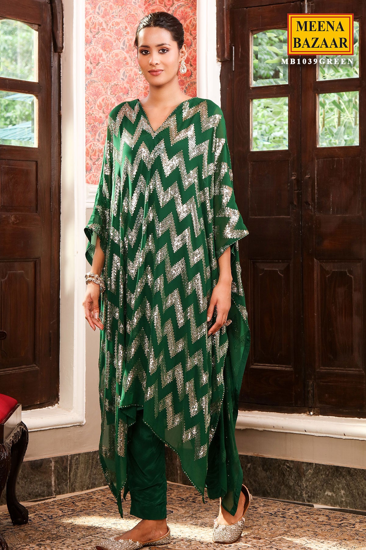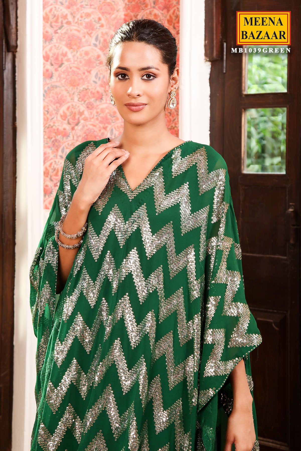 Dark Green Georgette Sequins Embroidered Kaftan-Pant Set