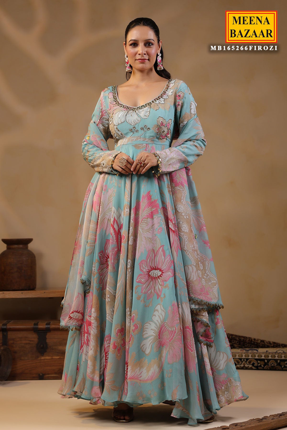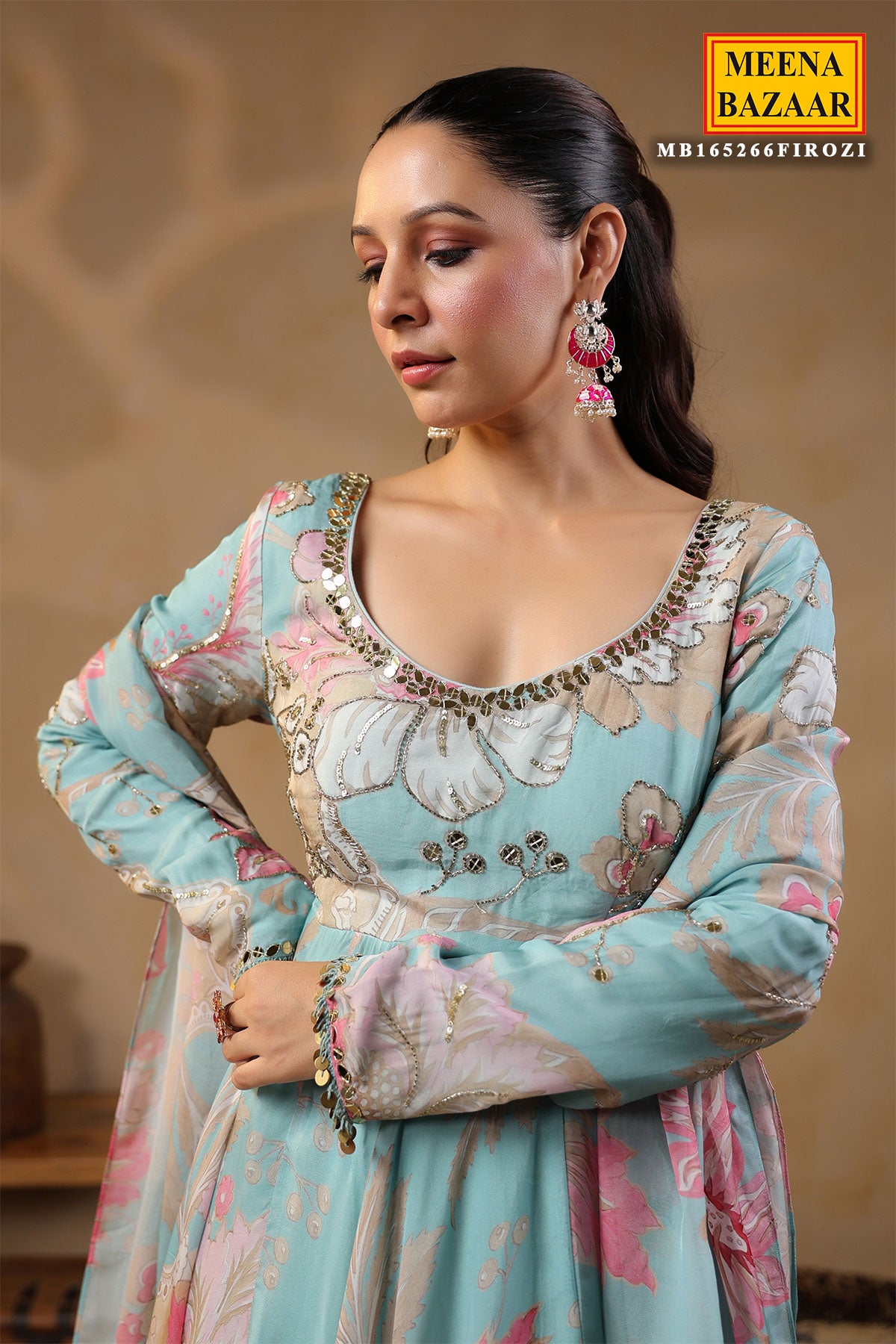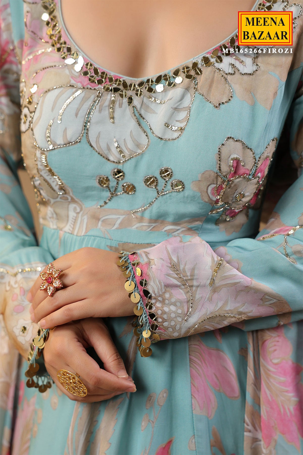 Chic. Ethereal. Unforgettable. This Firozi Organza Gown blends tradition with a modern edge. Featuring a delicate floral print and detailed with hand-embroidered cut-dana, mirror work, and sequins, this gown is designed to make a statement. Crafted from luxurious organza, it offers a lightweight yet durable feel, ideal for festive occasions. The coordinating dupatta adds a refined finishing touch, making this ensemble perfect for weddings, receptions, and cultural celebrations. Style Tip: Consider styling it with a pair of strappy flats and dangler earrings for a relaxed weekend look. Note: Color may slightly be different from the actual item due to photographic lighting sources or the monitor's settings.