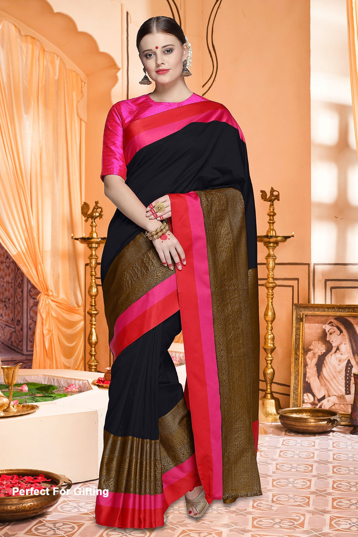 For a contemporary ethnic wear look, pick this Black Silk Zari Woven Saree. It is designed with solid, contrasting red and magenta borders. Zari weaving is done at the bottom of the gher, above the borders. This saree comes with an unstitched blouse material attached with it. Embrace this classic beauty to festivities, party functions, gatherings with family and friends and get complimented for your choice. Play around with how you want to get your blouse stitched and make a statement with this gorgeous drape for the festive and wedding season!