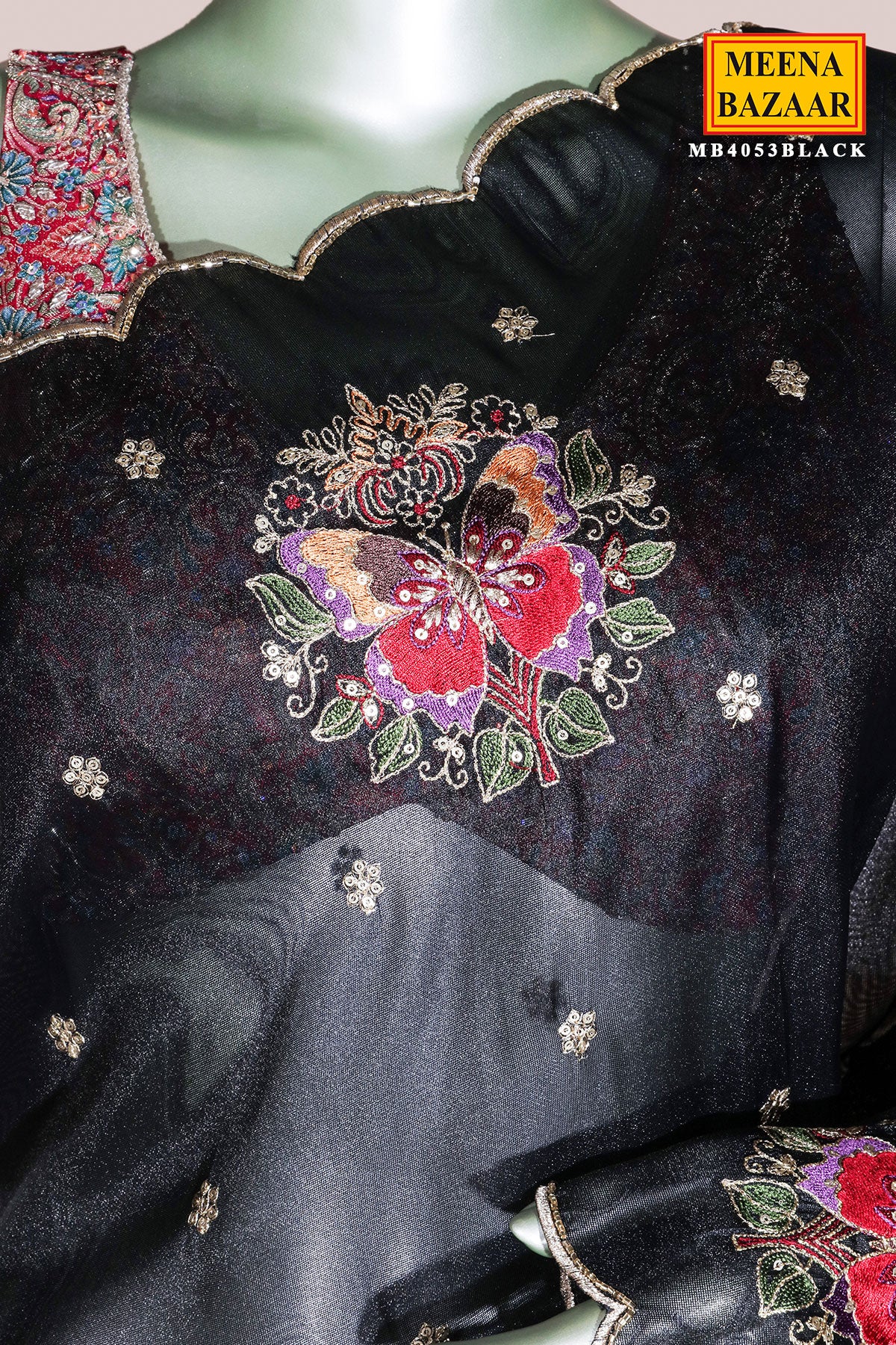This is a stunning Black Shimmer Embroidered Saree, designed to add glamour and sophistication to your evening look. Crafted from premium shimmer fabric, this saree features delicate embroidery that enhances its luxurious appeal while maintaining a refined finish. The classic black colour adds timeless elegance, making it an ideal choice for cocktail parties, festive celebrations, receptions, and special occasions. Lightweight with a graceful drape, this designer shimmer saree offers both comfort and style. It comes with a matching unstitched blouse fabric, allowing you to customise the blouse as per your preference. Pair it with statement jewellery and heels to create a bold, glamorous ethnic ensemble.