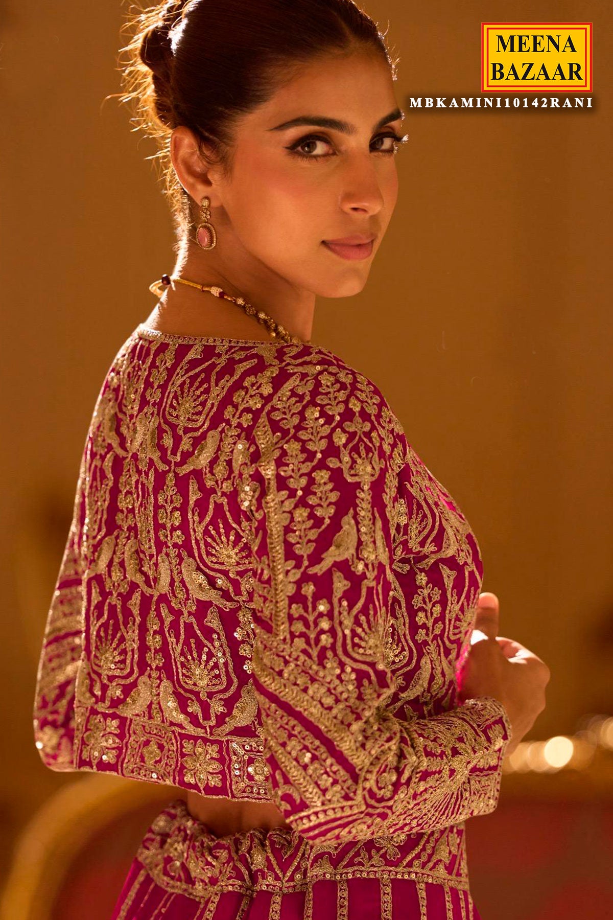 This is exquisite Rani Premium Real Georgette Lehenga Set from Meena Bazaar. Designed for luxurious wedding and festive celebrations, this ensemble features a heavily embroidered short shrug, intricately crafted on both the front and back with traditional motifs and fine detailing. The set includes a beautifully coordinated blouse and a full-flare georgette lehenga enhanced with cancan, giving it a regal volume and graceful movement. The premium real georgette fabric offers a rich fall and an elegant drape, adding to its sophisticated appeal.