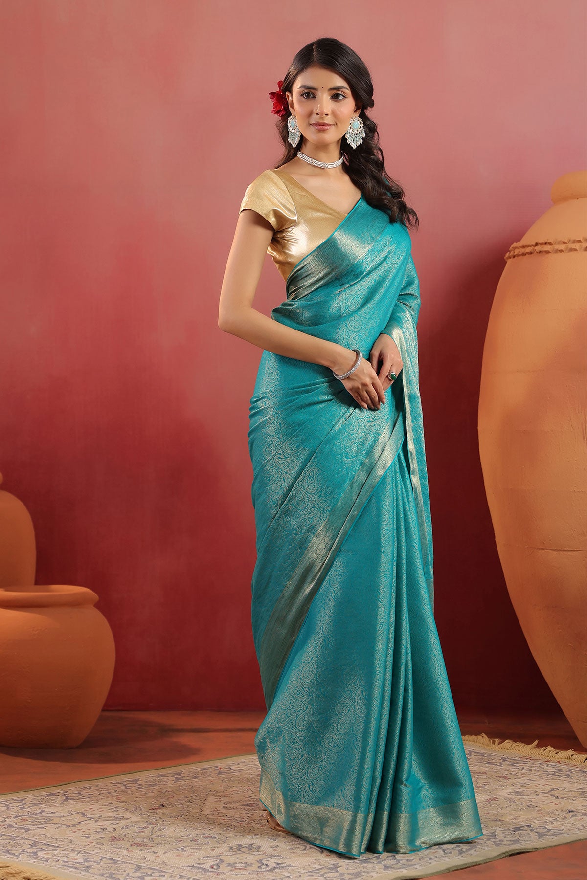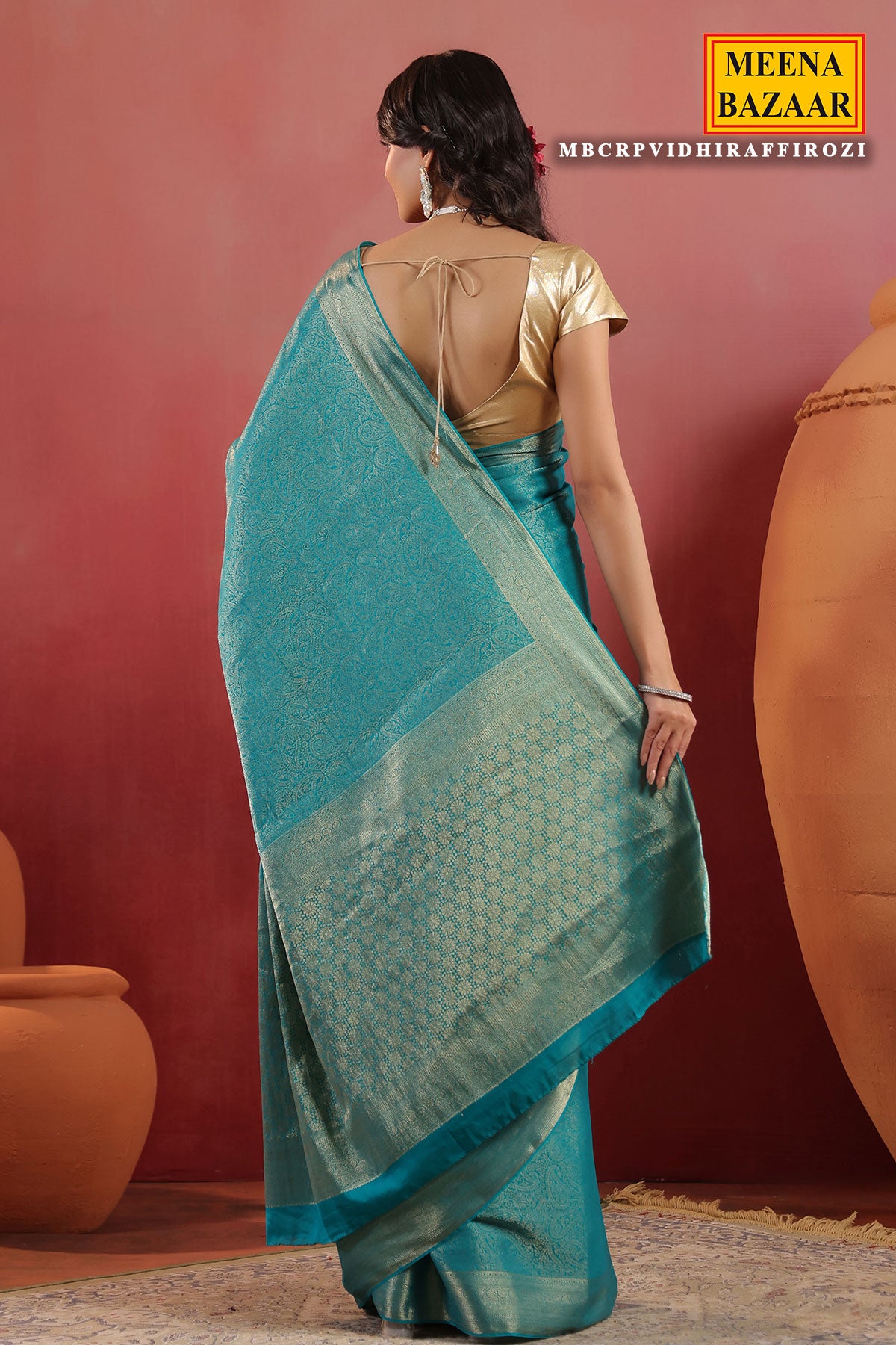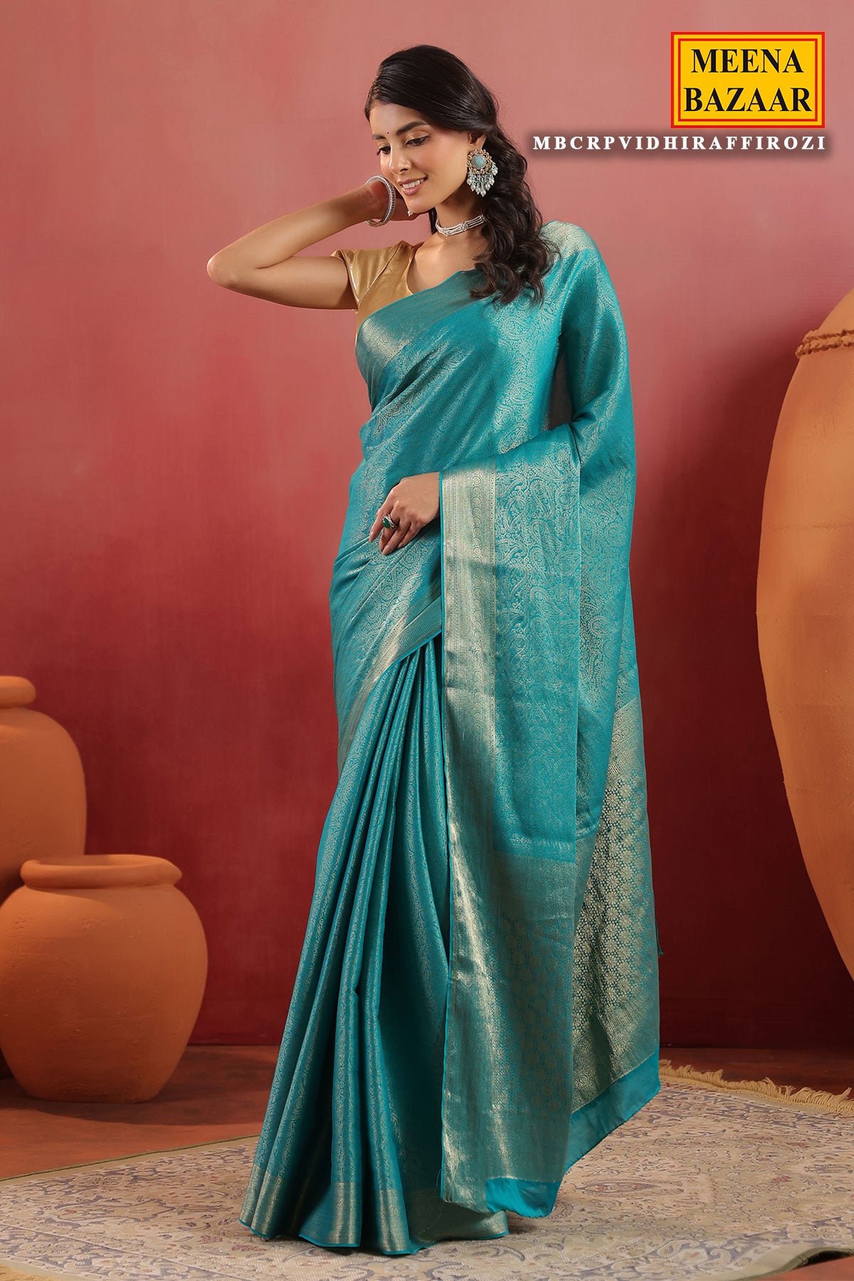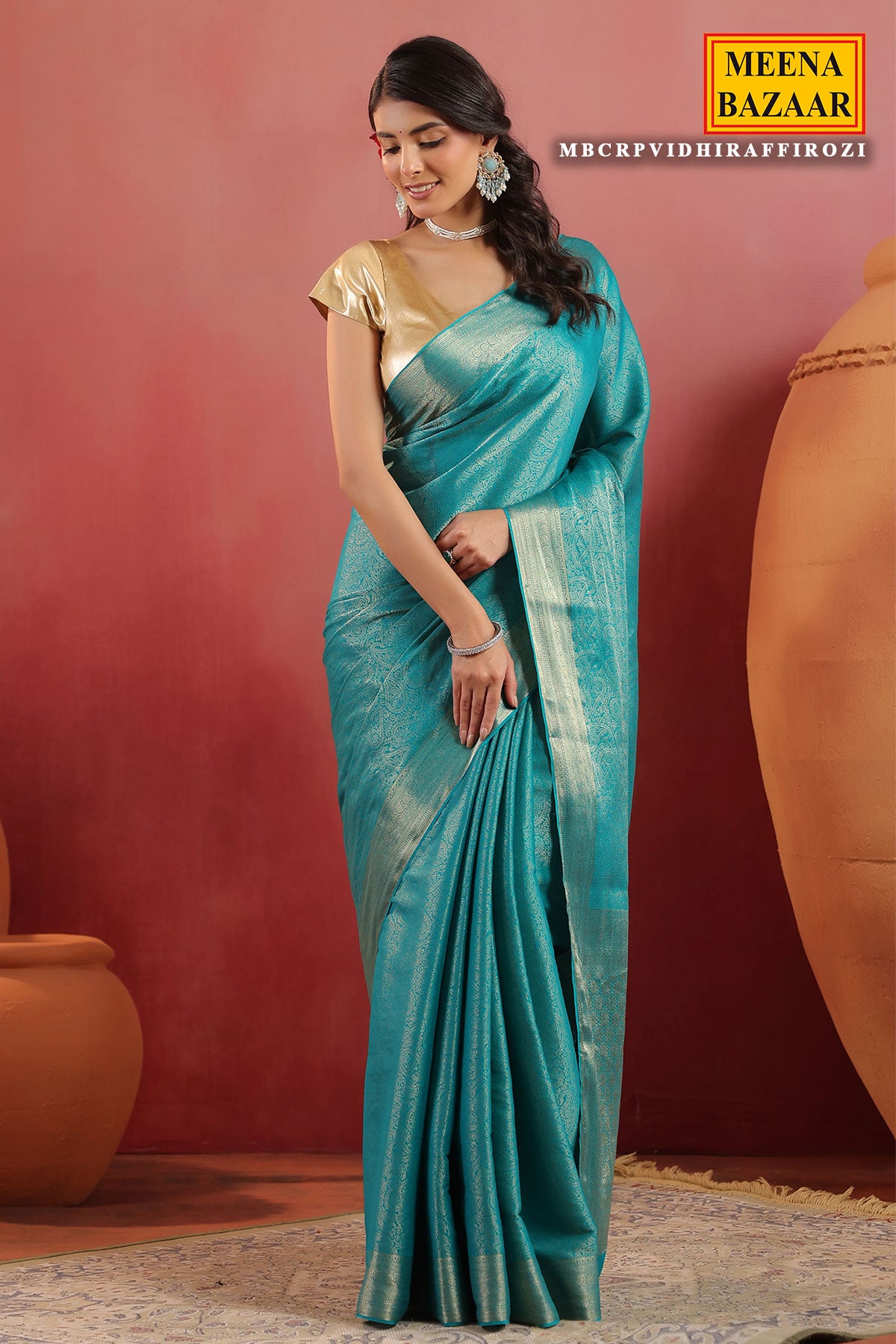 This is an elegant Firozi Silk Weaving Saree from Meena Bazaar, crafted with rich woven detailing that enhances its traditional appeal. The soothing firozi shade adds a refreshing and graceful touch, making it an ideal choice for festive celebrations, weddings, cultural occasions, and special events. Made from premium silk fabric, the saree offers a soft texture and a beautiful drape, ensuring both comfort and style. The intricate weaving highlights timeless craftsmanship, making it perfect for women who admire classic yet stylish ethnic fashion. Pair it with gold or kundan jewellery to complete a stunning festive look.