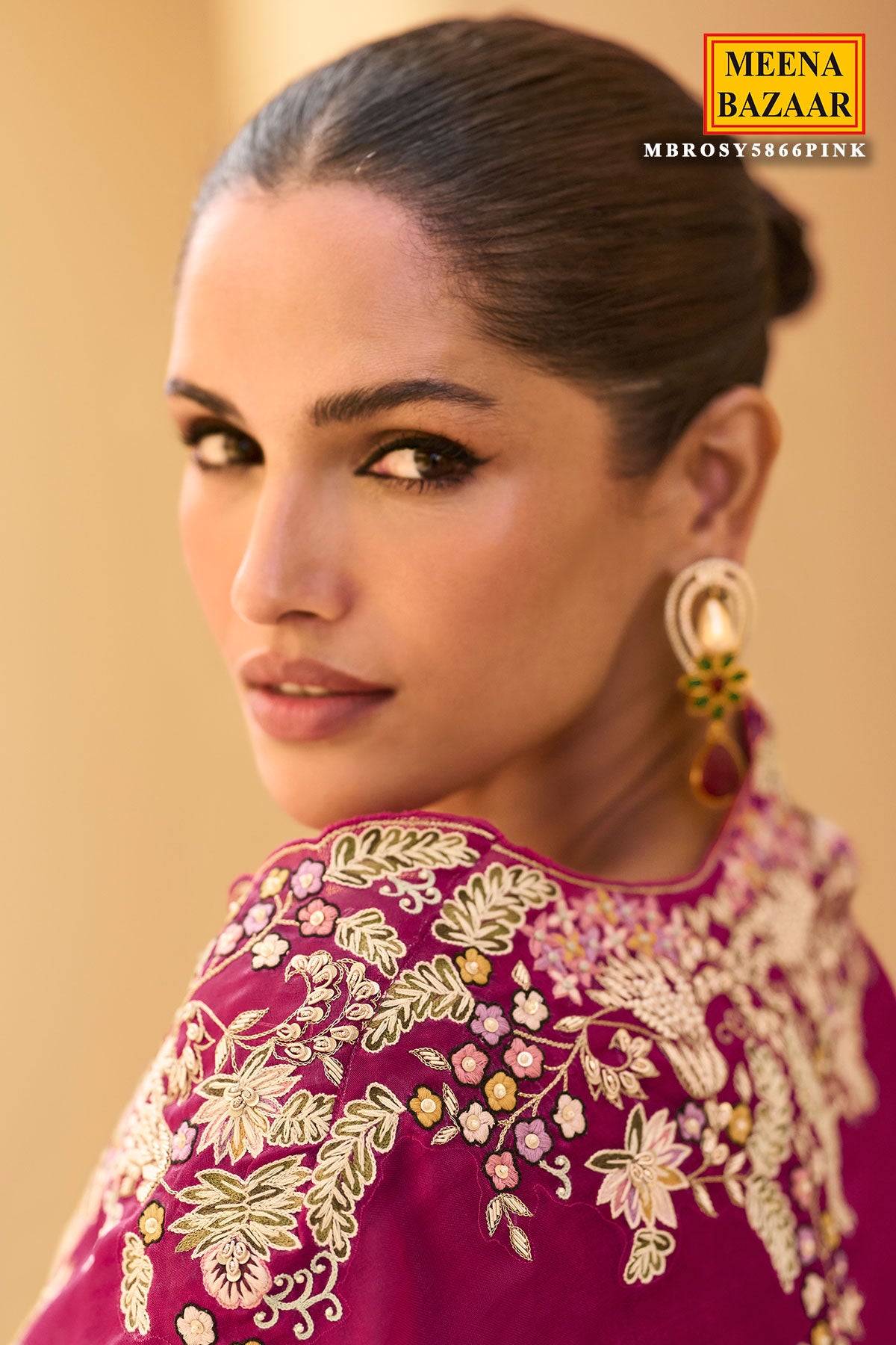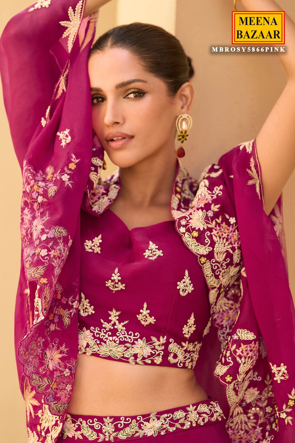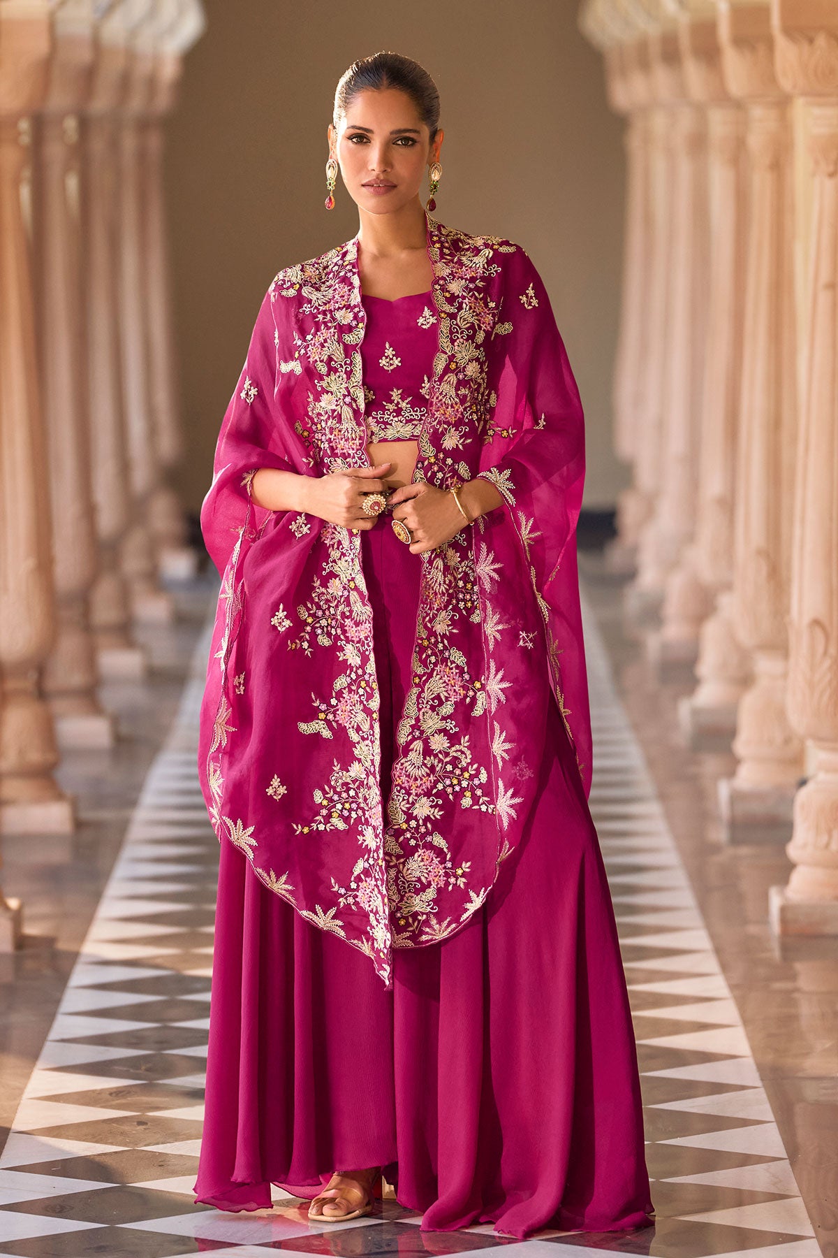 This exquisite Rani Pink Embroidered Cape Style Suit from Meena Bazaar. Designed for the modern woman who admires traditional artistry, this ensemble features a rich and vibrant rani pink shade that exudes elegance and festive charm. The highlight of this outfit is the beautifully crafted embroidered cape, adding a graceful and contemporary twist to a classic silhouette. The cape showcases intricate floral thread embroidery across the neckline, shoulders, and border, creating a stunning visual balance of refinement and festive detailing. Crafted with premium fabrics, the cape is made in Organza, offering a sheer luxurious look, while the suit is tailored in Georgette, providing comfort, movement, and an effortless drape. The flared bottom completes the look with flowy finesse perfect for sangeet nights, cocktail parties, festive gatherings, and wedding events.