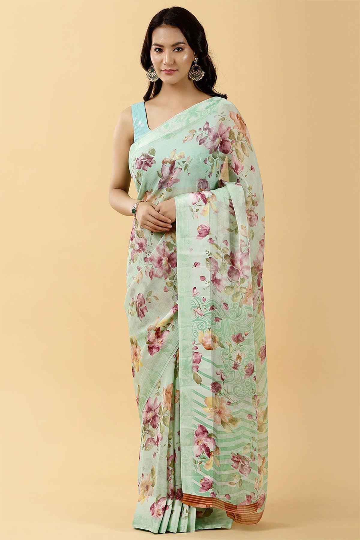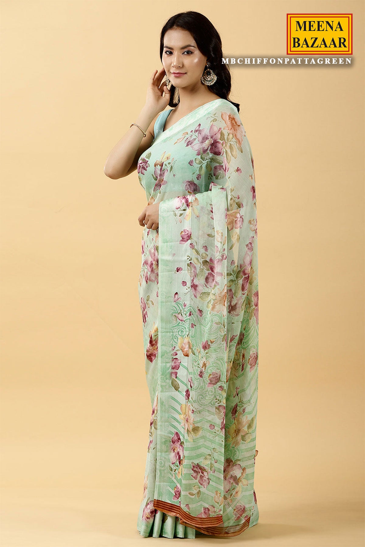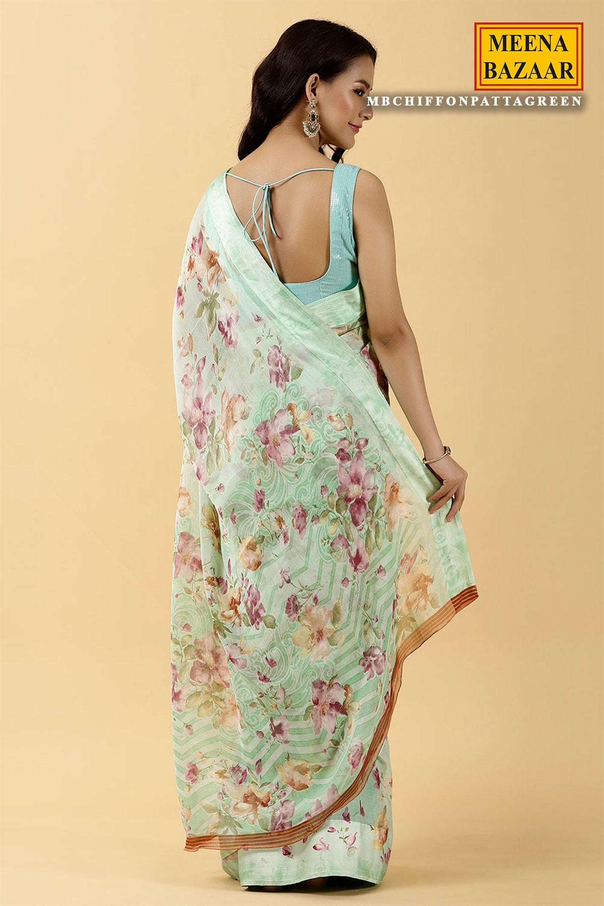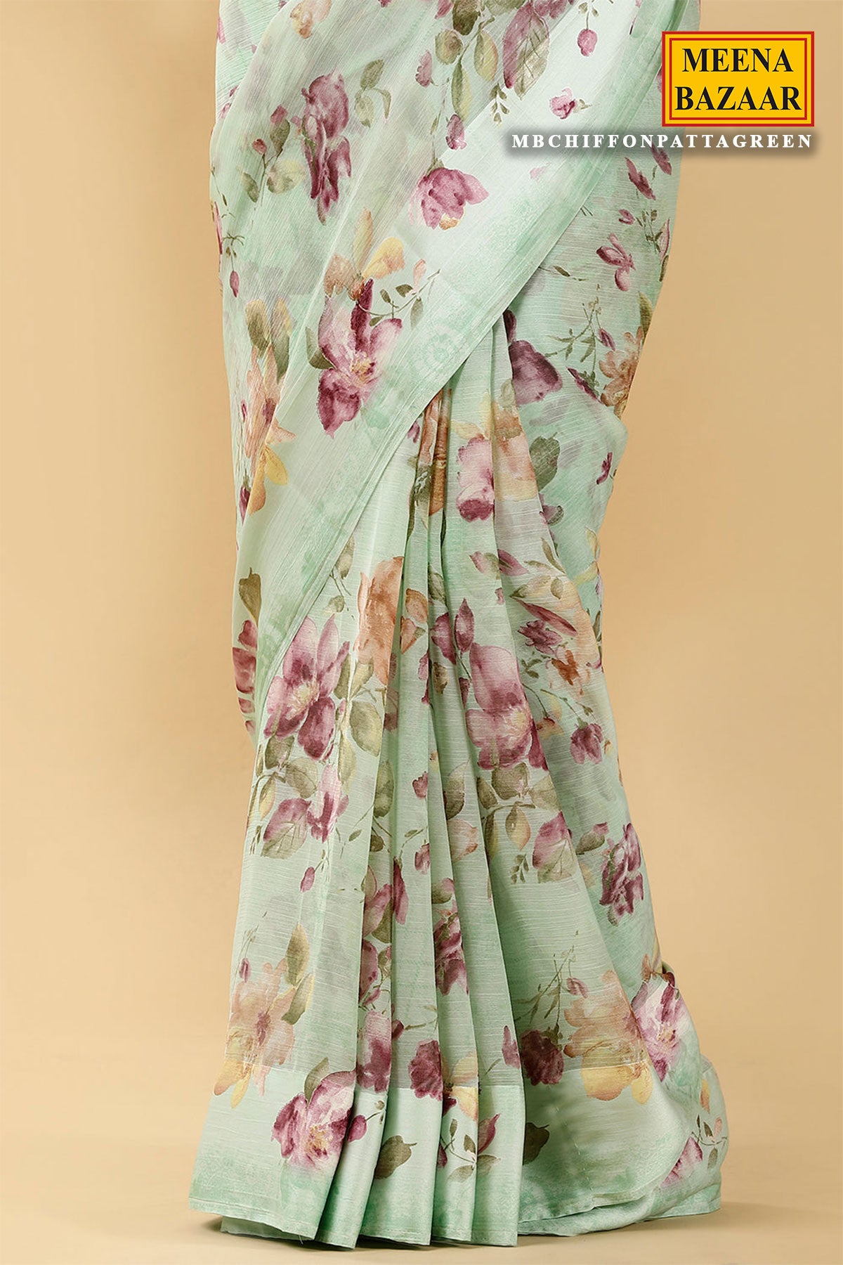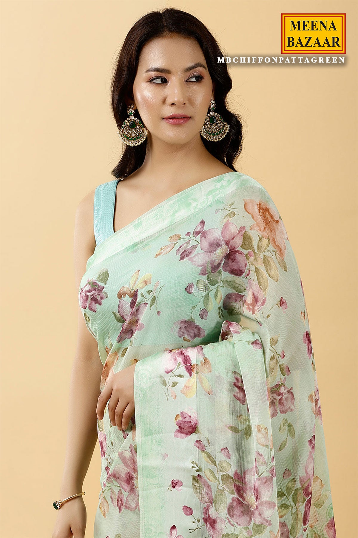 A celebration of elegance and nature's beauty, Meena Bazaar brings to you this Green Floral Printed Chiffon Saree. The lightweight chiffon fabric drapes gracefully, making you feel like a vision of femininity. The vibrant floral print adds a touch of whimsy and charm, infusing every step with a burst of color. Whether you're attending an intimate family function or a celebration out with friends, this saree is the epitome of grace. Stay assured that this Floral Printed Chiffon Saree is sure to turn heads and make you the center of attention. Play around with how you want to get your blouse stitched and make a statement with this gorgeous drape for the upcoming party season.