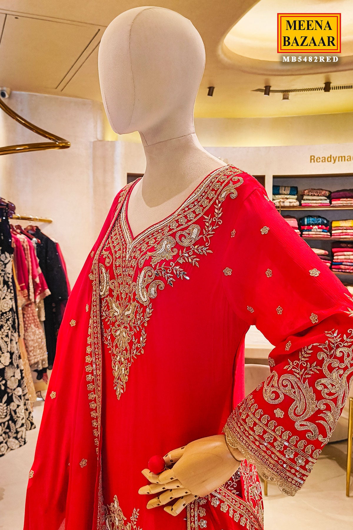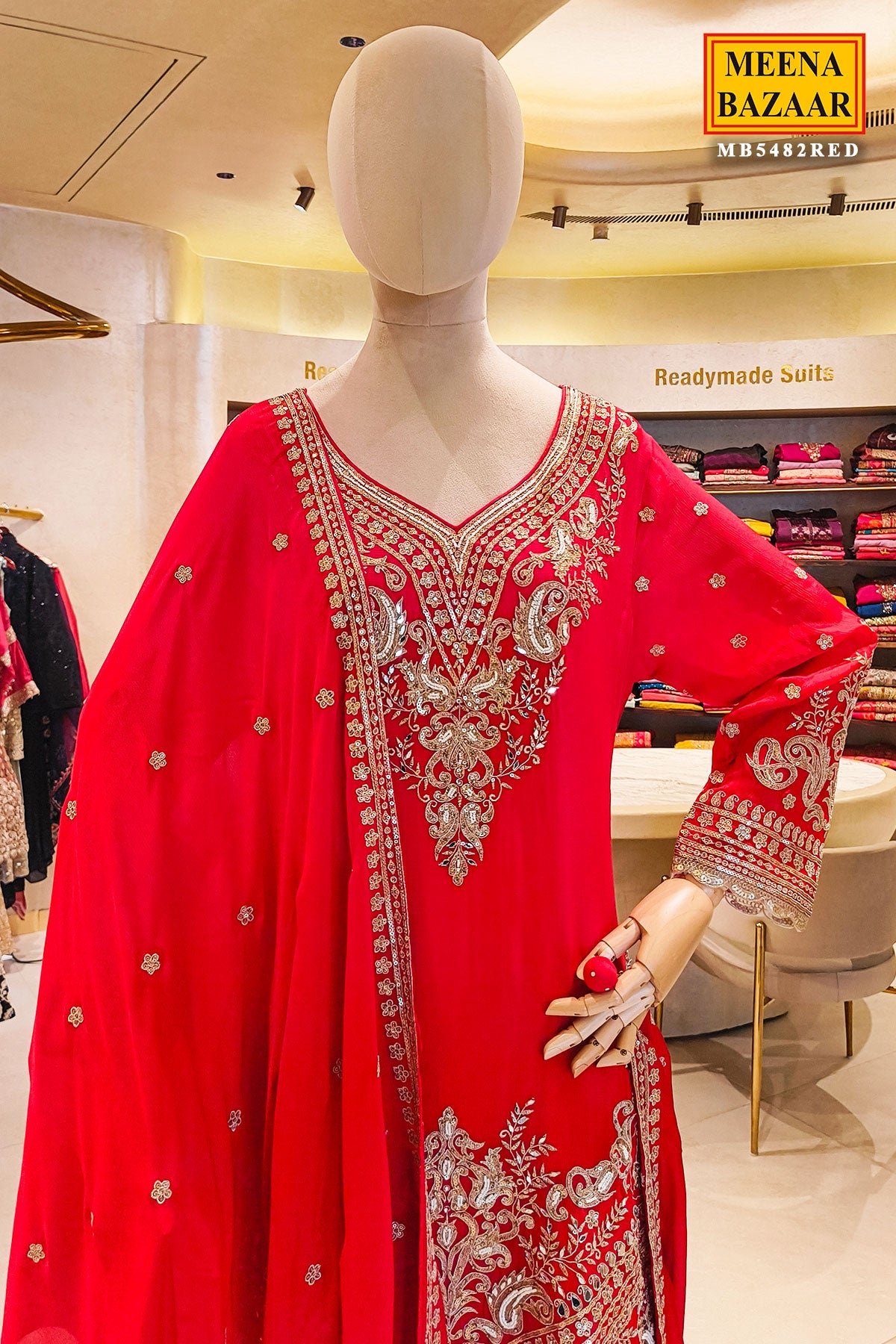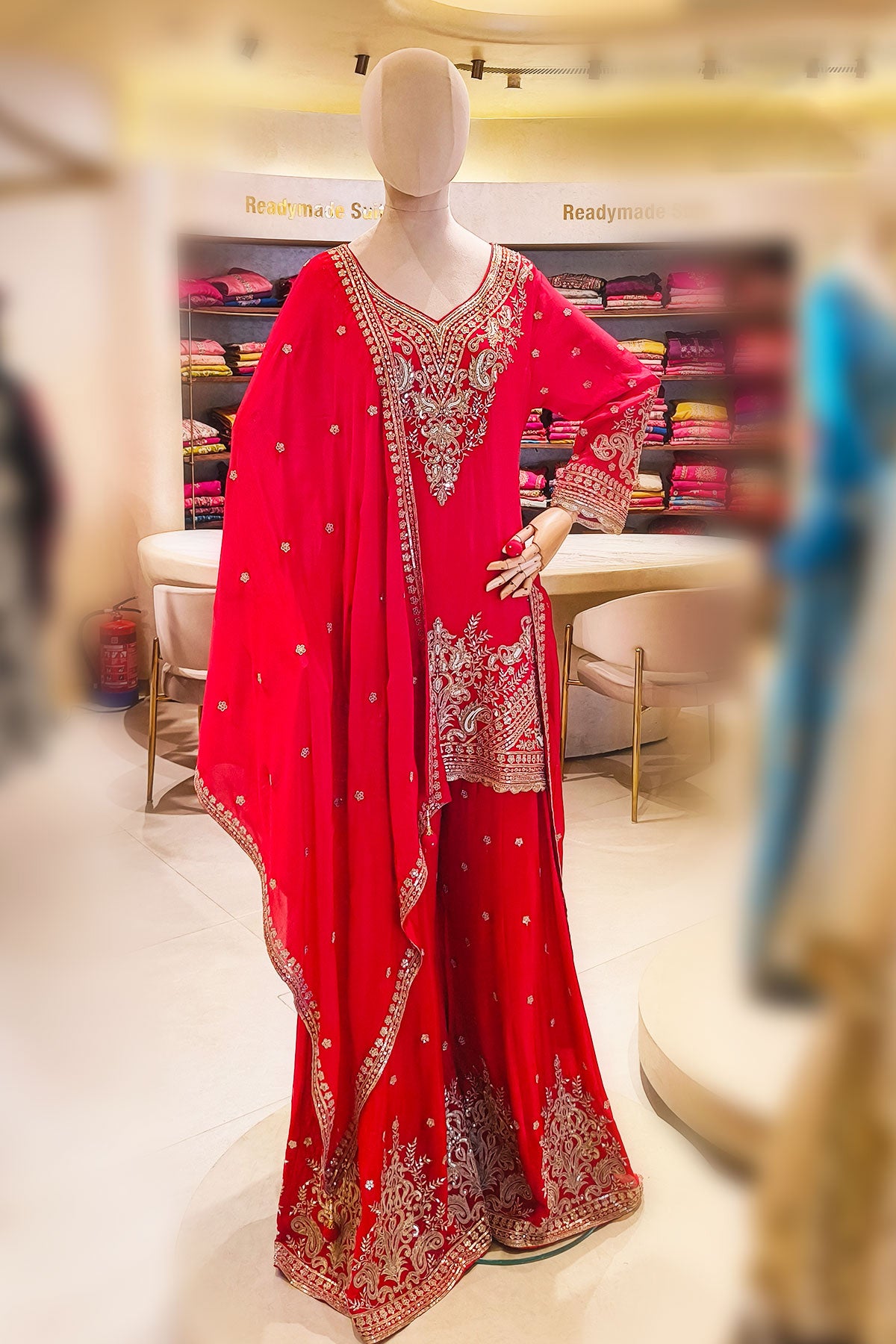 Make an elegant impression with this beautifully crafted red 3-piece set that blends timeless tradition with modern flair. The short kurti features intricate zari work along the neckline, sleeves, and hem, adding a touch of refined opulence. Paired with a flared palazzo for graceful movement and all-day comfort, the ensemble is perfectly balanced with delicate detailing throughout. The matching dupatta, highlighted with subtle zari accents, completes the look with understated sophistication. Ideal for festive gatherings, weddings, and celebratory occasions, this ensemble brings effortless charm to your ethnic collection.