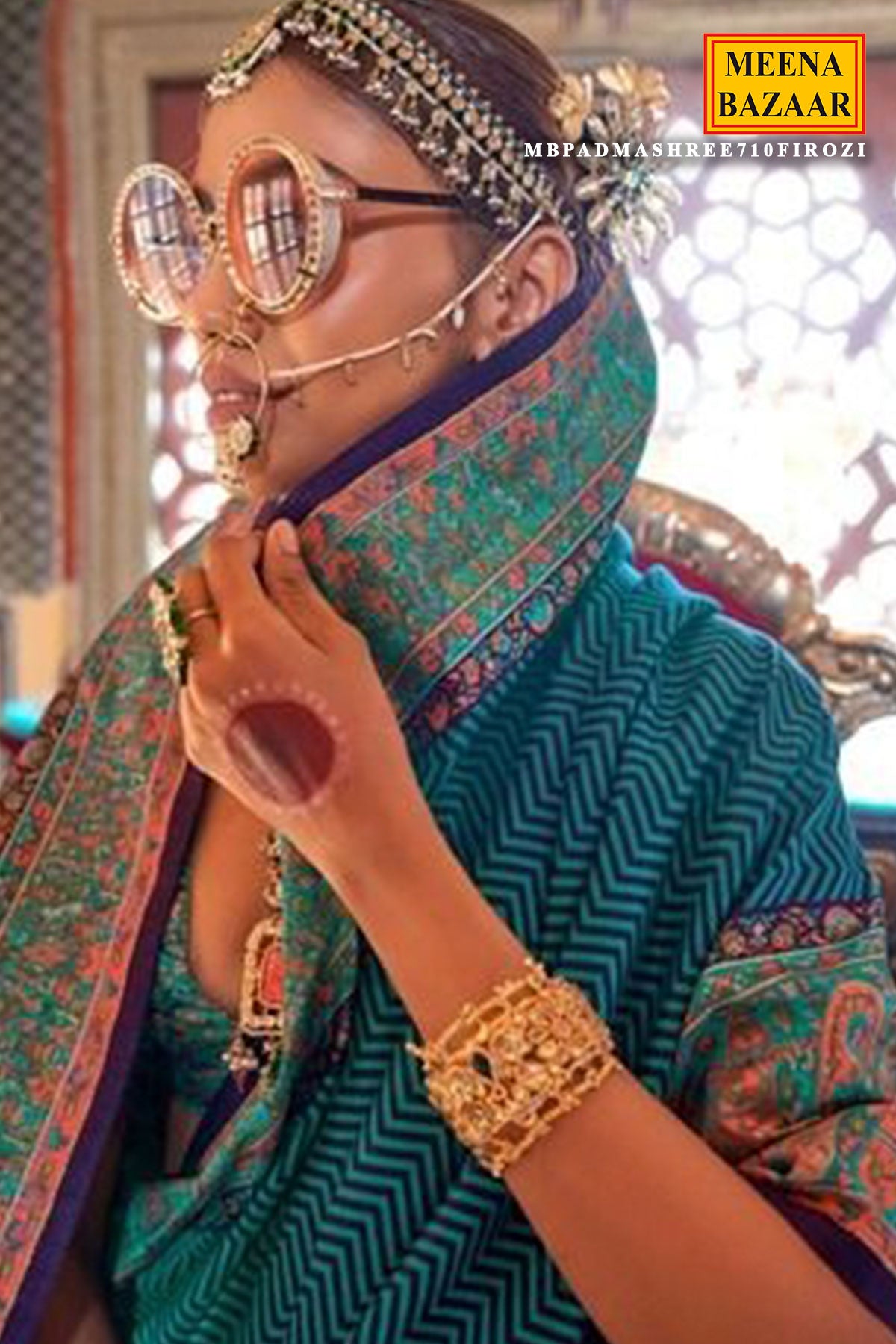Firozi Intricate Floral Embroidery Embellished Pashmina Silk Saree