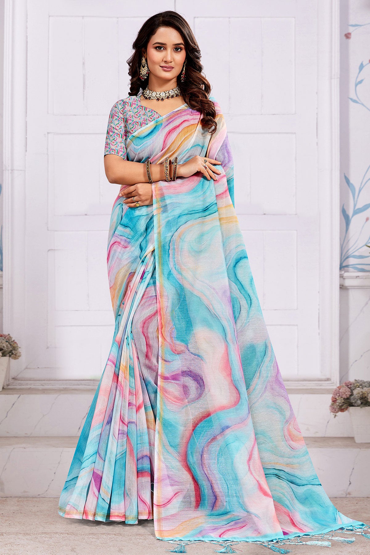 Grace your wardrobe with this beautiful Firozi saree crafted from lightweight Organza fabric. The saree features an elegant printed design that adds a modern yet graceful touch to the overall look. Its soft texture and airy feel make it comfortable to drape while maintaining a sophisticated appearance.