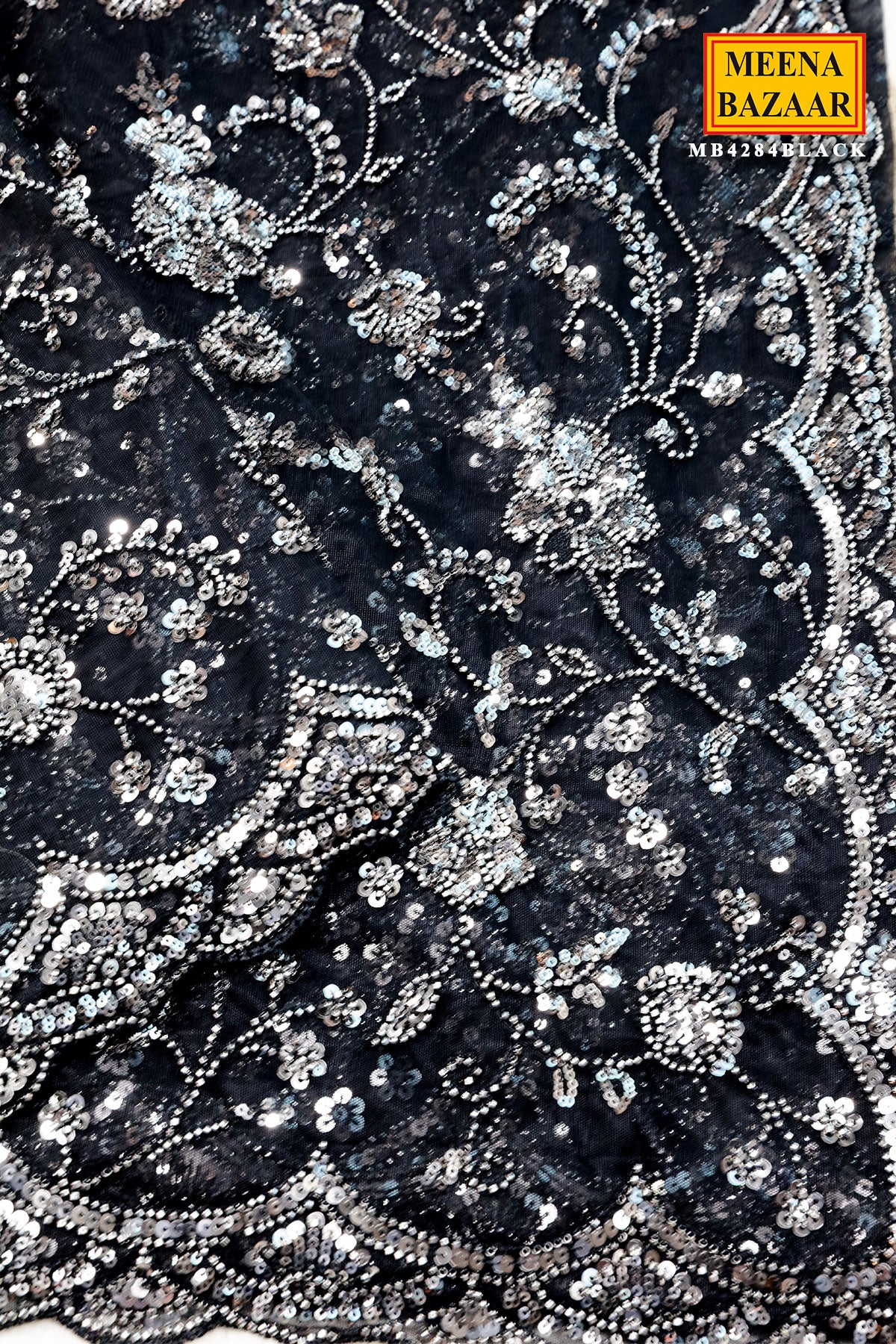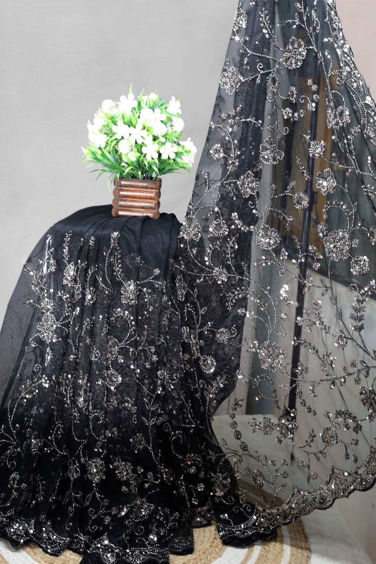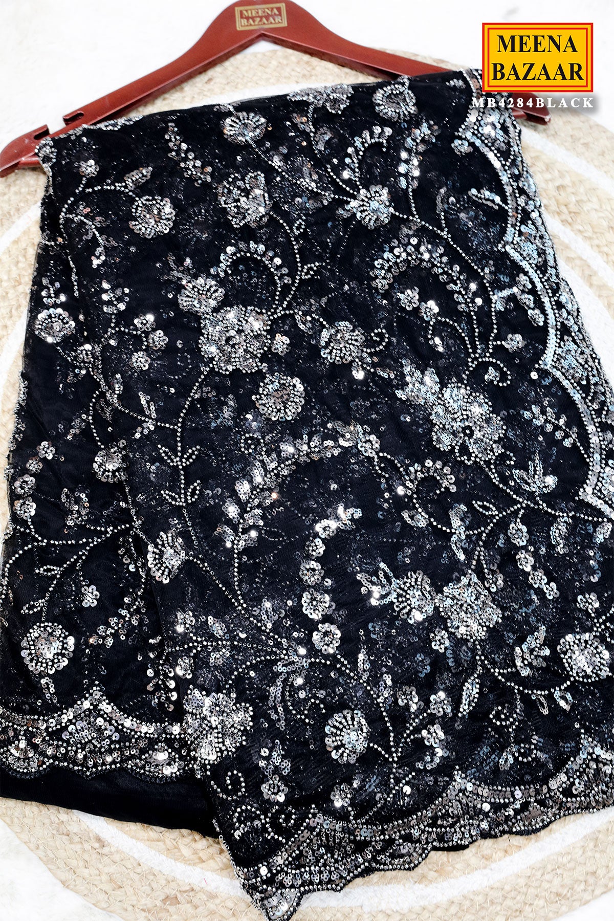 This is a stunning Black Net Embroidered Saree from Meena Bazaar. Crafted from premium lightweight net fabric, this saree features exquisite embroidery work that adds a rich and refined touch. The intricate detailing enhances its luxurious look, making it perfect for evening events, weddings, parties, and festive celebrations. Designed to offer a perfect balance of glamour and sophistication, the flowy drape ensures a graceful silhouette. It comes with a matching unstitched blouse piece so you can customize your style effortlessly.