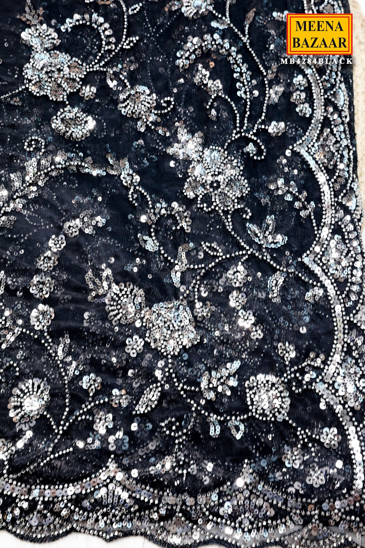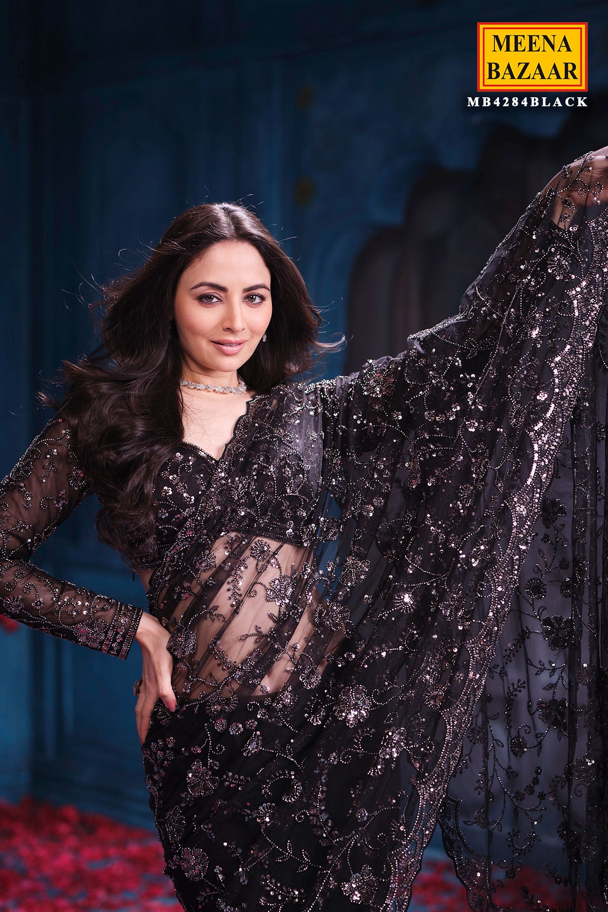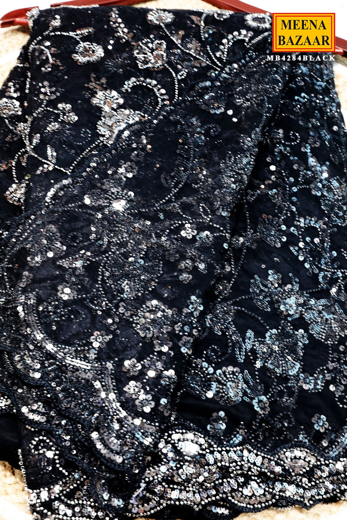This is a stunning Black Net Embroidered Saree from Meena Bazaar. Crafted from premium lightweight net fabric, this saree features exquisite embroidery work that adds a rich and refined touch. The intricate detailing enhances its luxurious look, making it perfect for evening events, weddings, parties, and festive celebrations. Designed to offer a perfect balance of glamour and sophistication, the flowy drape ensures a graceful silhouette. It comes with a matching unstitched blouse piece so you can customize your style effortlessly.