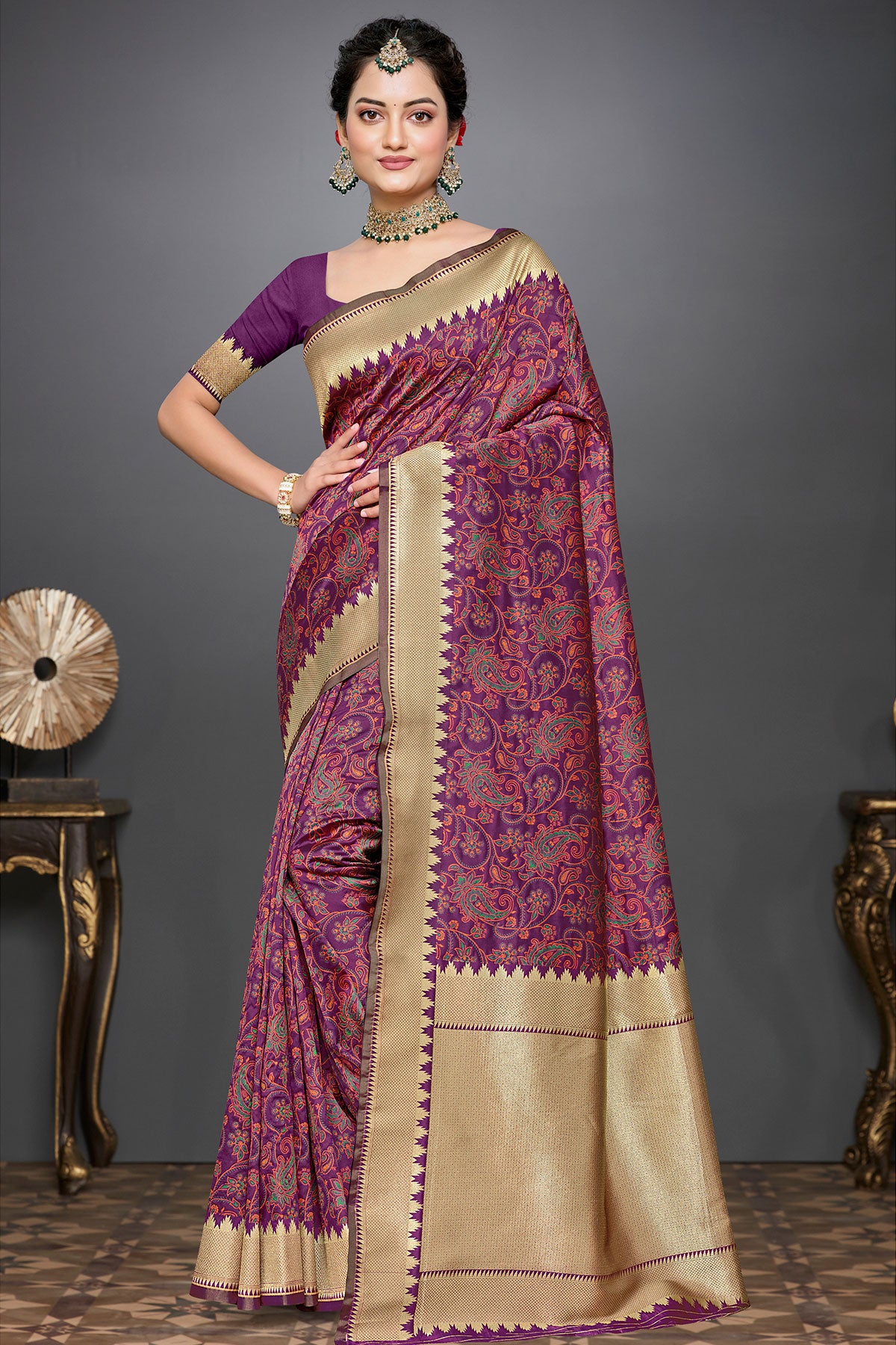 Golden Grace: The Timeless Weaving of Wine Silk Saree