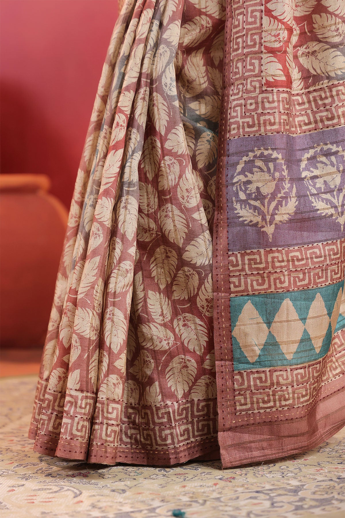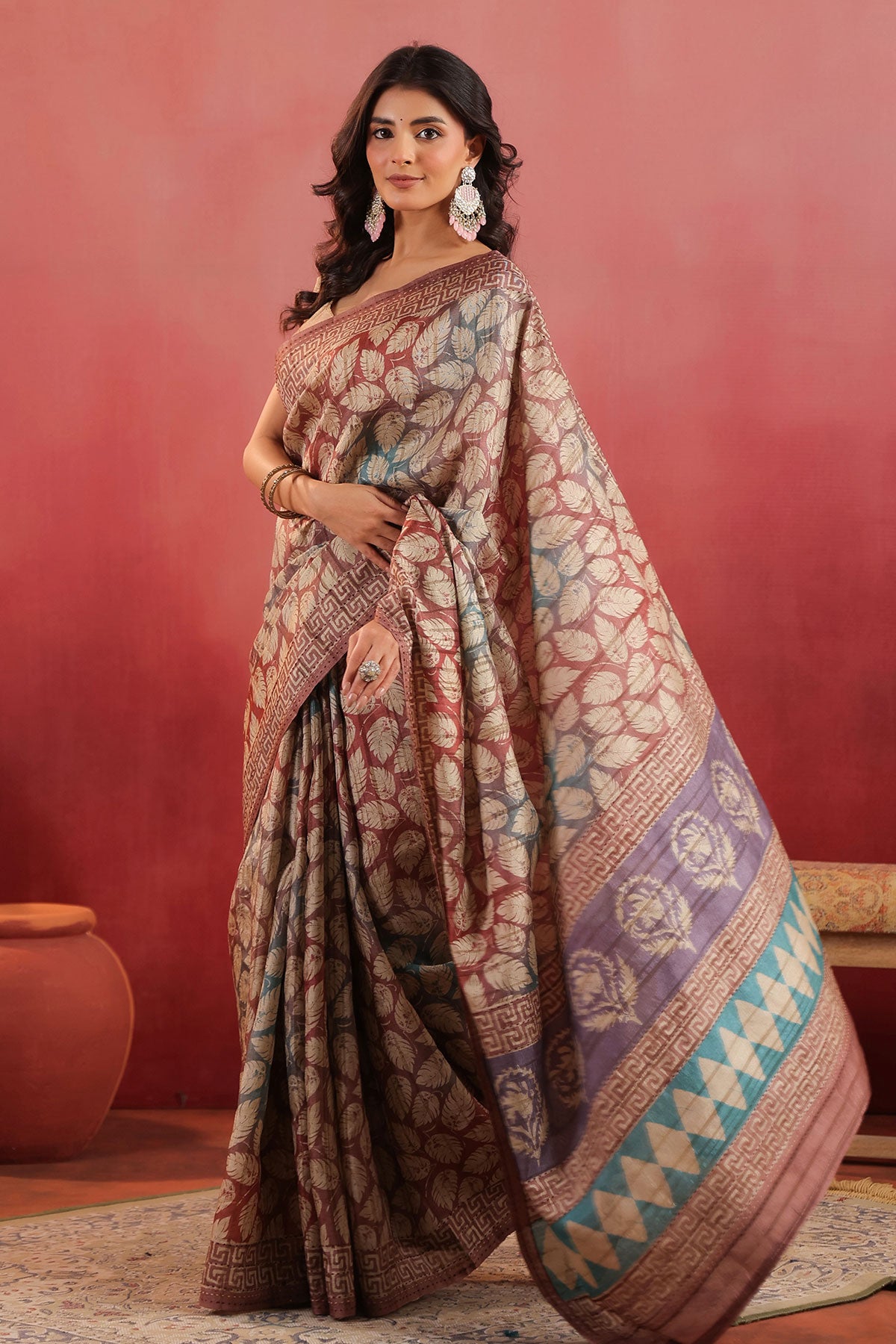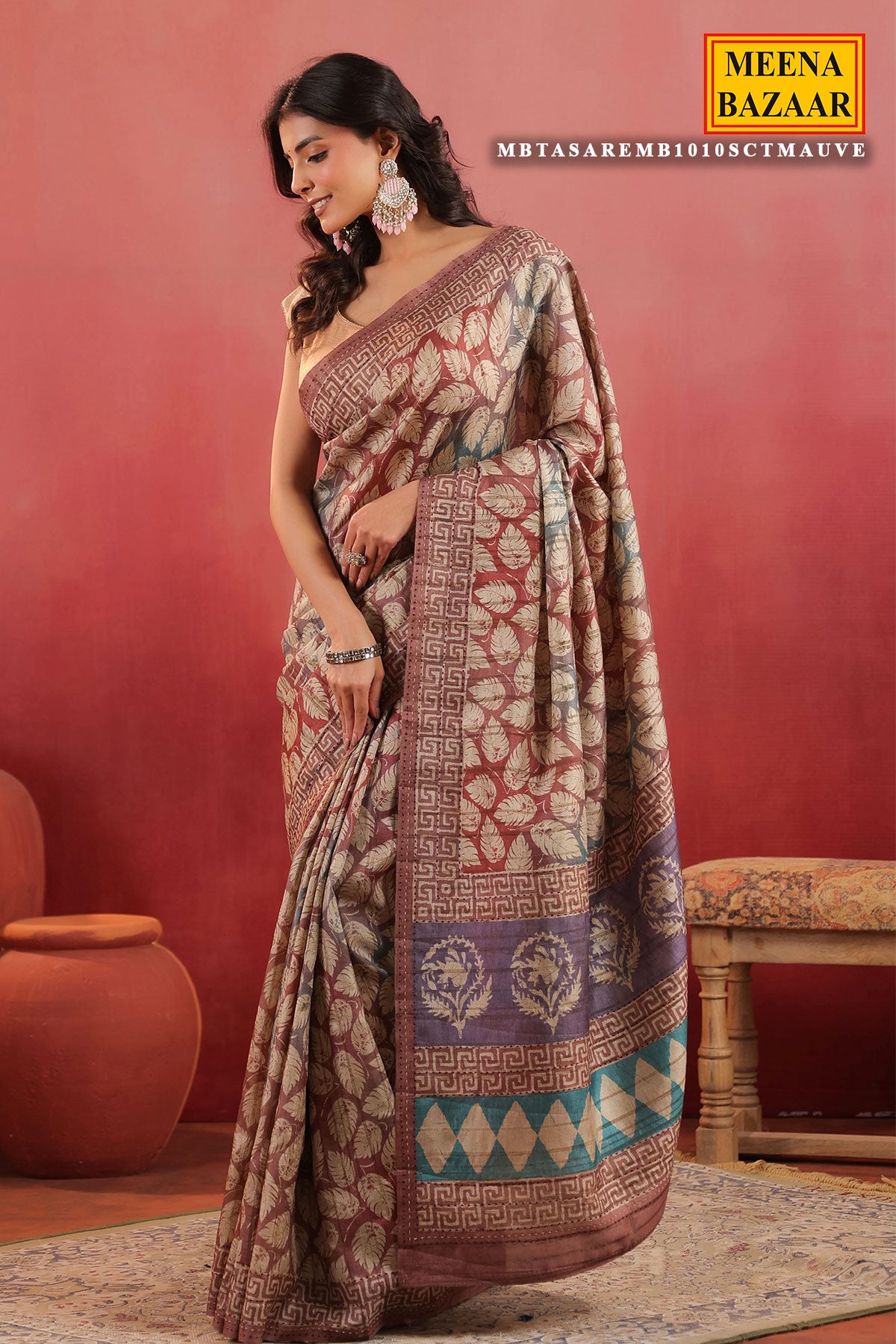 This is mauve cotton printed saree from Meena Bazaar. Crafted from soft, breathable cotton fabric, this lightweight saree for women features beautiful block-style leaf prints and a geometric border design, giving it a perfect blend of traditional and modern appeal. Ideal for daily wear, festive functions, office wear, or casual gatherings, this cotton saree with printed design ensures comfort without compromising on style. The subtle earthy tones and intricate motifs make it a versatile addition to your ethnic wardrobe. Style it with minimal jewelry for a graceful and effortless look.