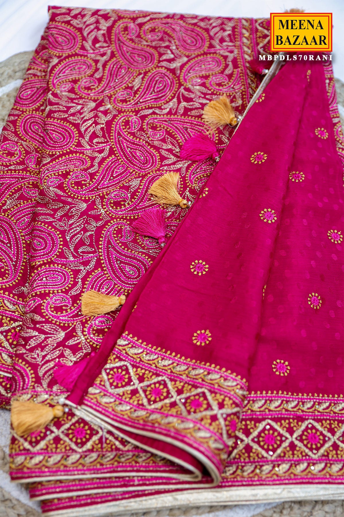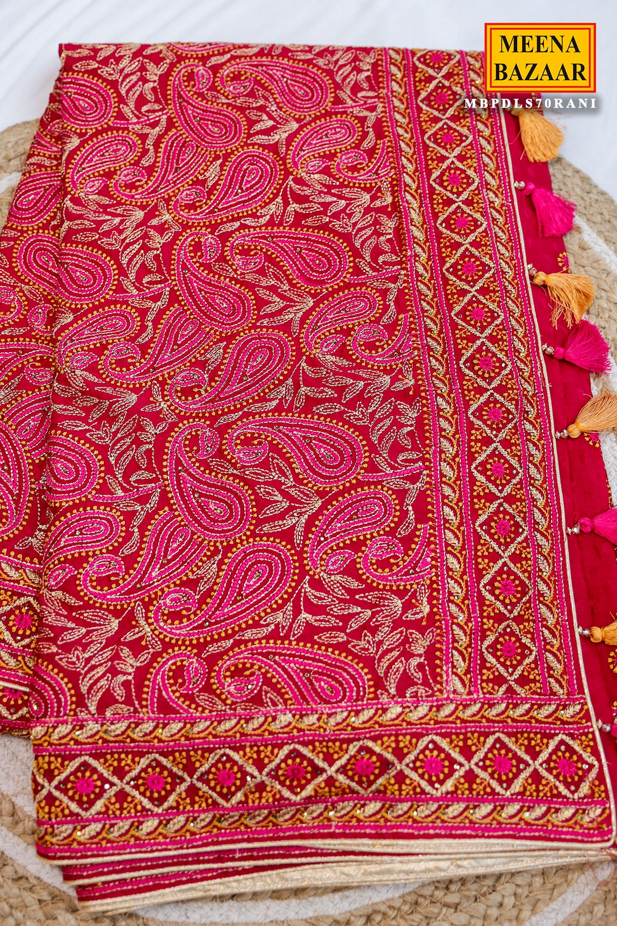 Festive georgette saree set in a rani-pink pallet, featuring an array of laid-over embroidery layered with zari and thread work depicting geometric and paisley tale. Customise the blouse as per your signature style. Transcend the grace and poise in this tasselled ensemble with contemporary jewels, sleek hair-do and contrasting pair of flats or heels as per your choice and comfort, for your upcoming festivities and soirees.