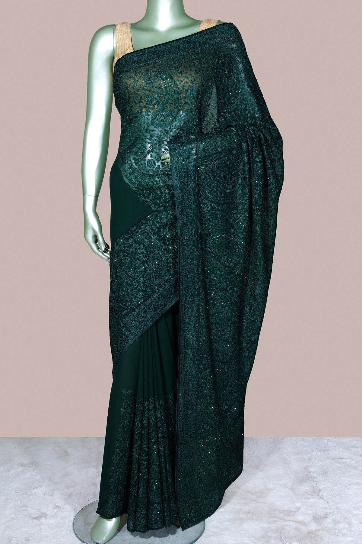 Bottle Green Embroidered Georgette Saree Elegant Party & Festive Wear
