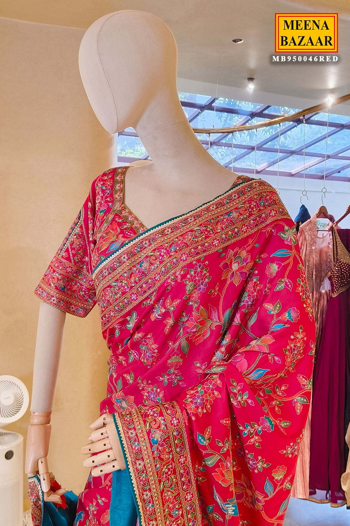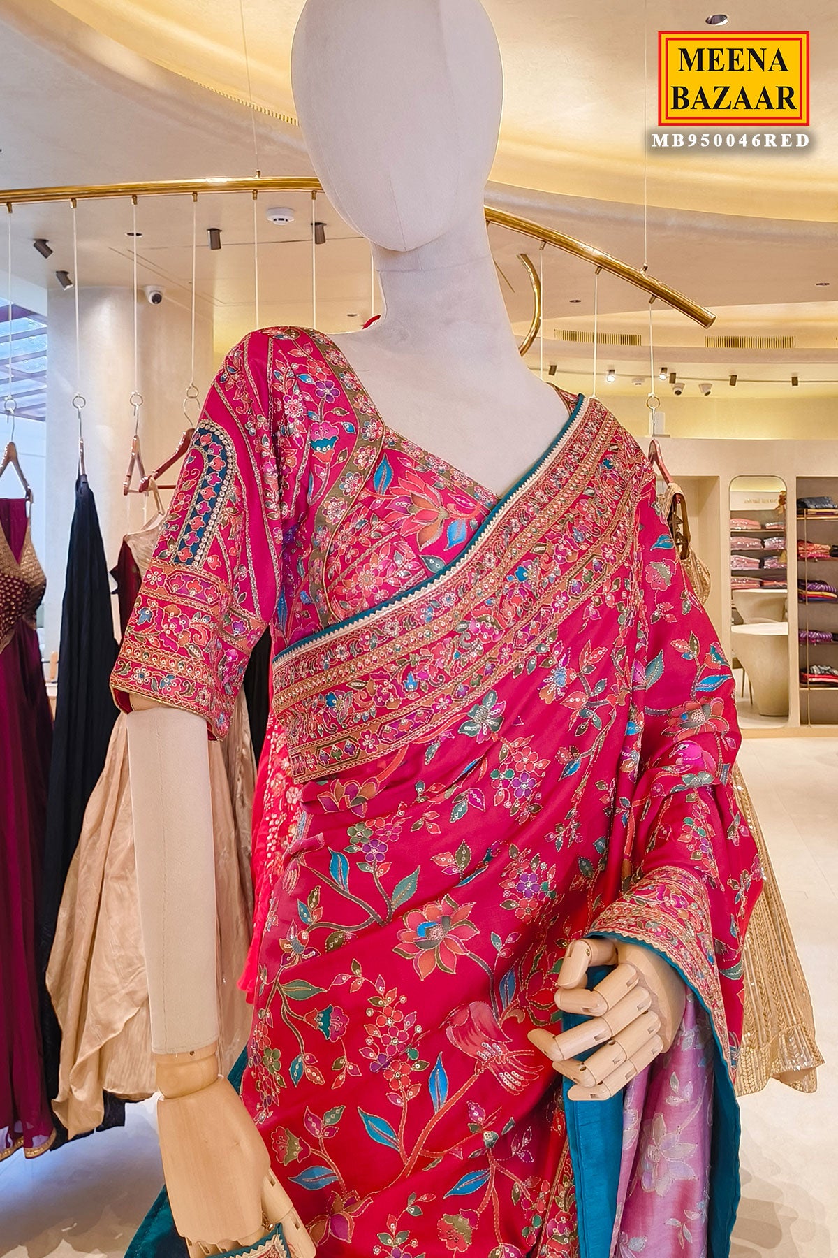 This striking red saree is a celebration of vibrant colour and intricate detailing. Adorned with delicate floral motifs in contrasting hues, the saree exudes timeless elegance with a contemporary edge. The richly embellished border, detailed with fine embroidery and subtle accents, adds depth and definition, framing the drape beautifully.
