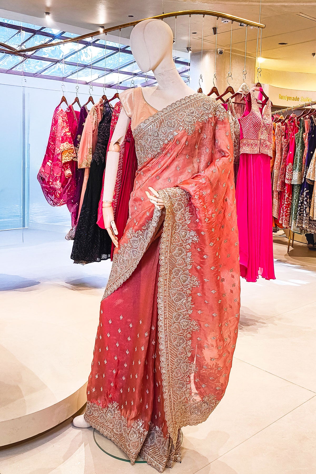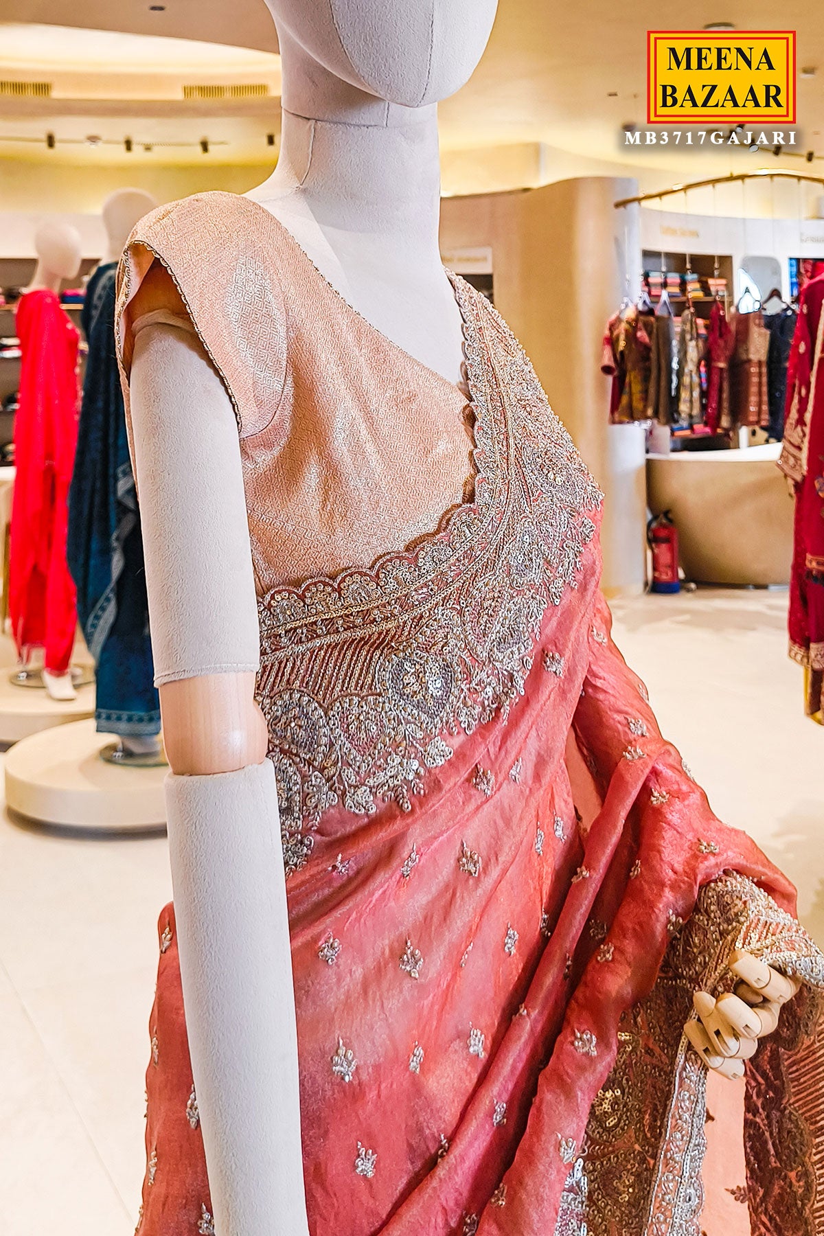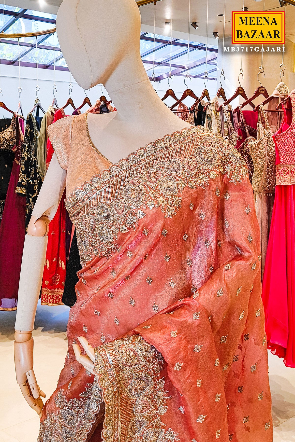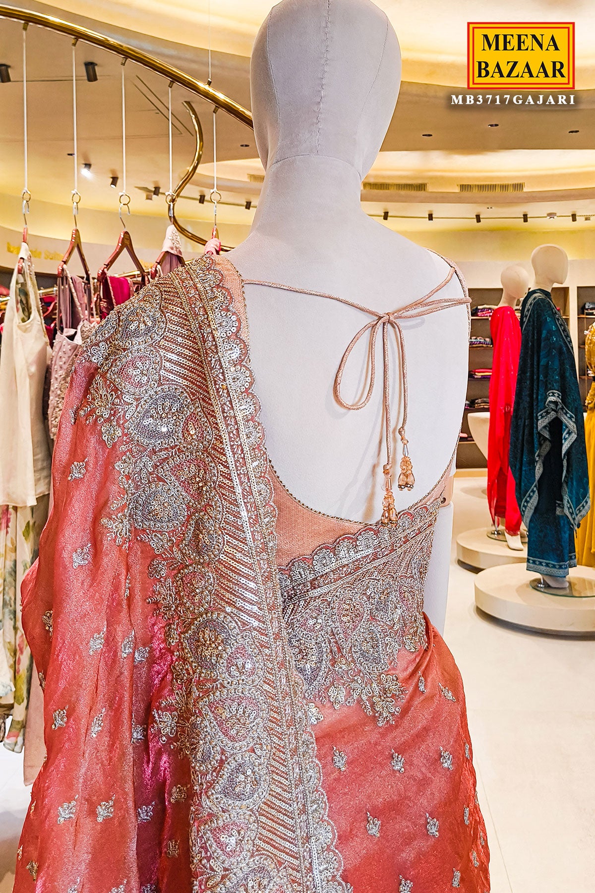 This Gajari tissue shimmer saree is beautifully enhanced with intricate embroidery work, creating a perfect balance of delicacy and grandeur. The lightweight tissue fabric lends a soft sheen and graceful drape, while the finely crafted designer embroidery adds depth, texture, and artisanal charm. Finished with an elegant border and detailing, this Gajari wedding saree and festive saree is an ideal choice for evening celebrations, parties, and special occasions where understated luxury stands out. Perfect for traditional Indian wear lovers seeking a blend of sophistication and elegance.