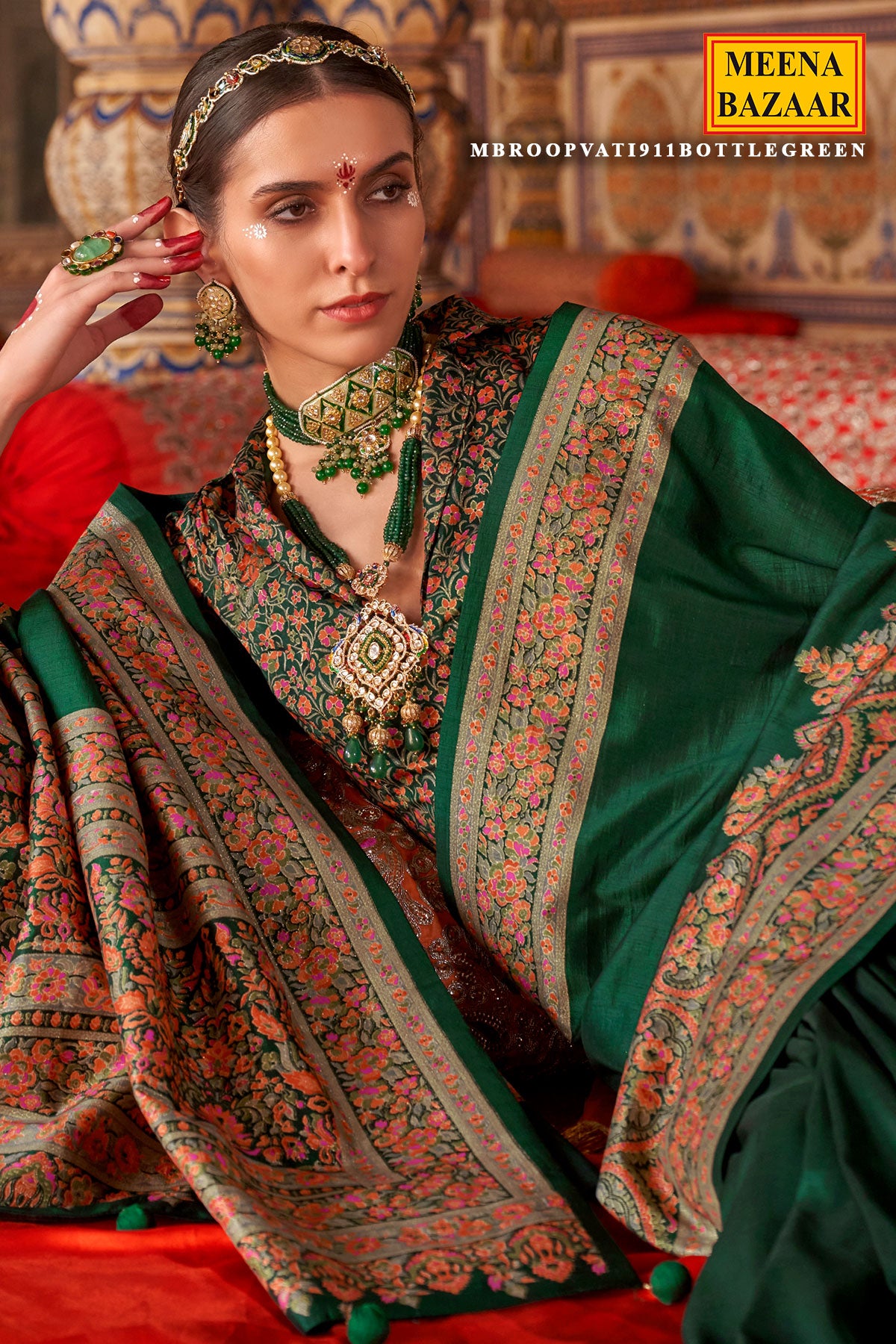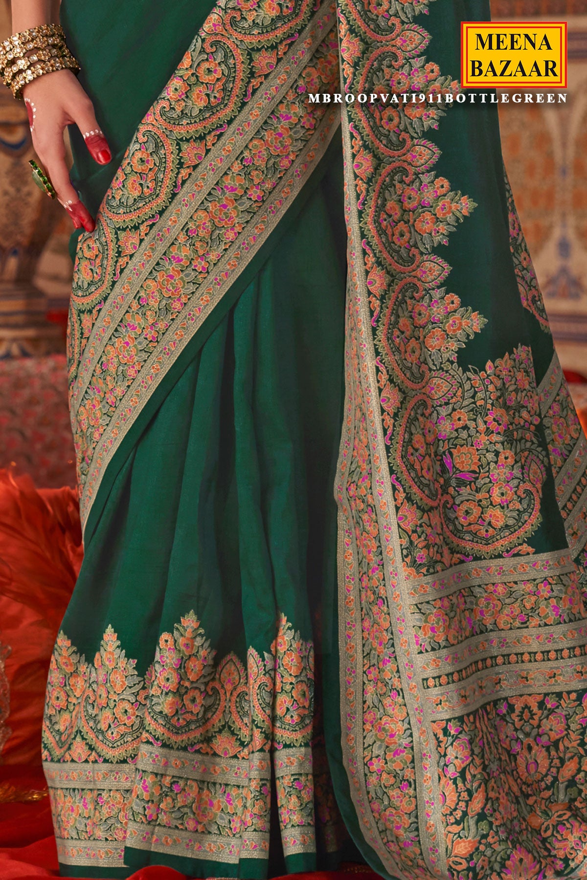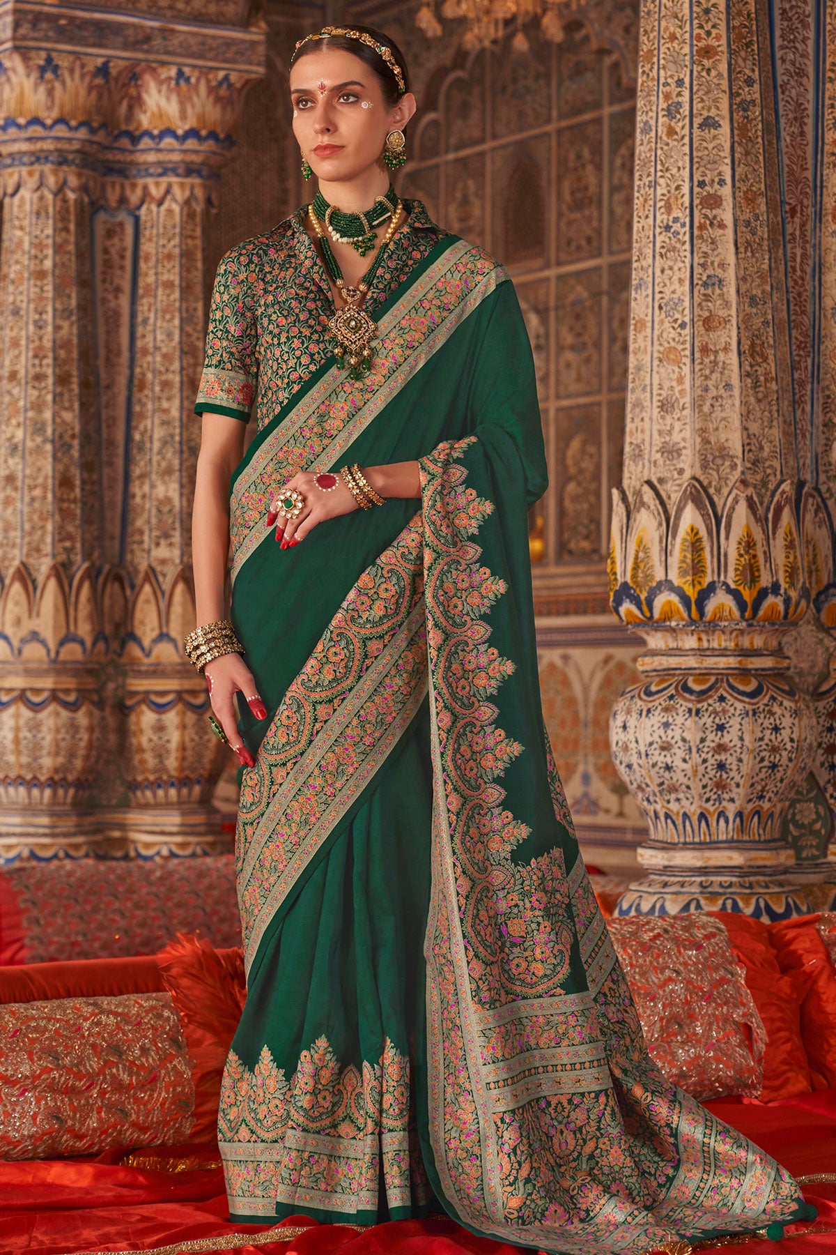 Experience the grandeur of tradition with this bottle green Kanchipuram silk saree, a perfect blend of rich color and exquisite craftsmanship. Handwoven with pure mulberry silk, this saree features a deep, captivating bottle green shade that symbolizes prosperity and elegance.