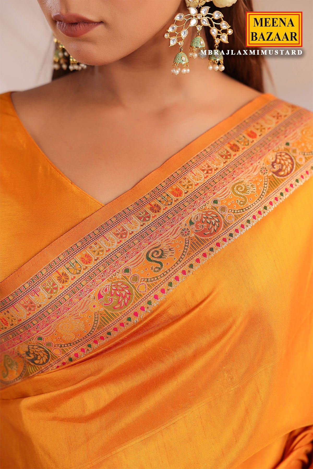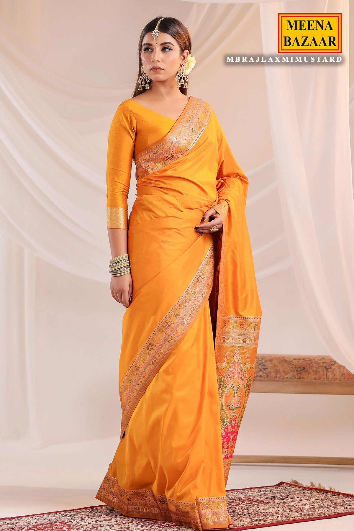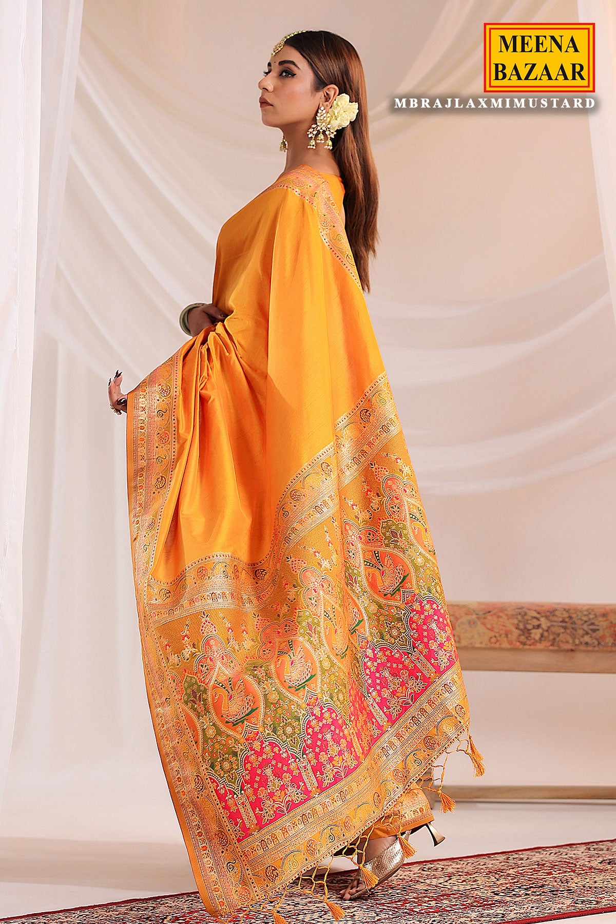 Enhance your ethnic wardrobe with this exquisite Mustard Silk Weaving Saree from MeenaBazaar.com. Crafted from luxurious silk fabric, this saree features detailed weaving work that reflects traditional Indian artistry. The rich mustard hue adds a royal and graceful touch, making it perfect for weddings, festive occasions, and cultural celebrations. Soft and elegant, the silk drapes beautifully, offering timeless sophistication with comfort. Pair it with traditional jewelry and matching heels for a complete ethnic look.