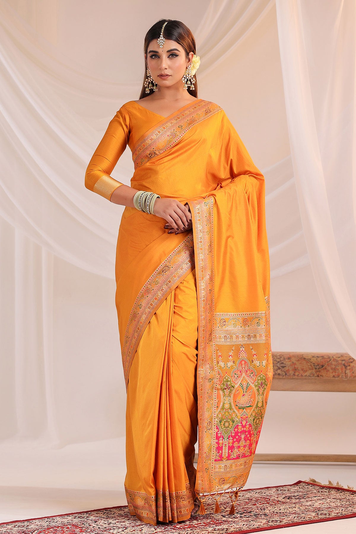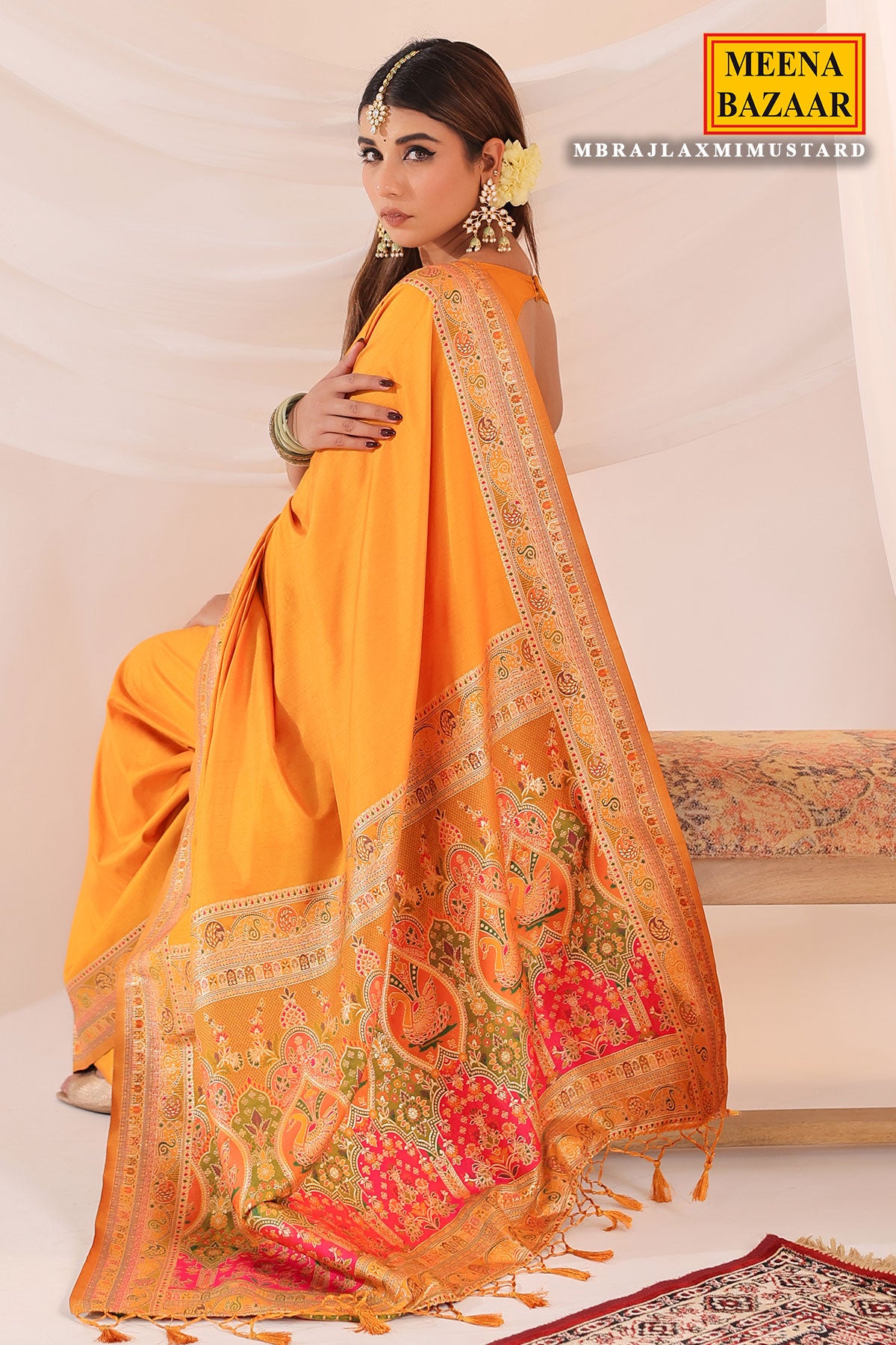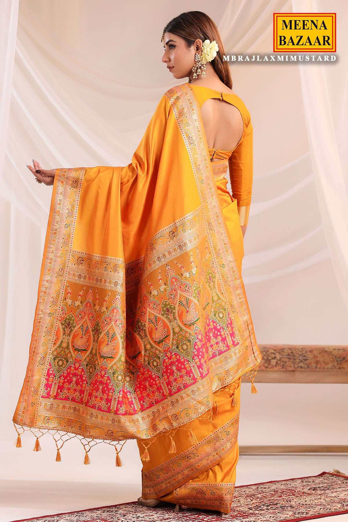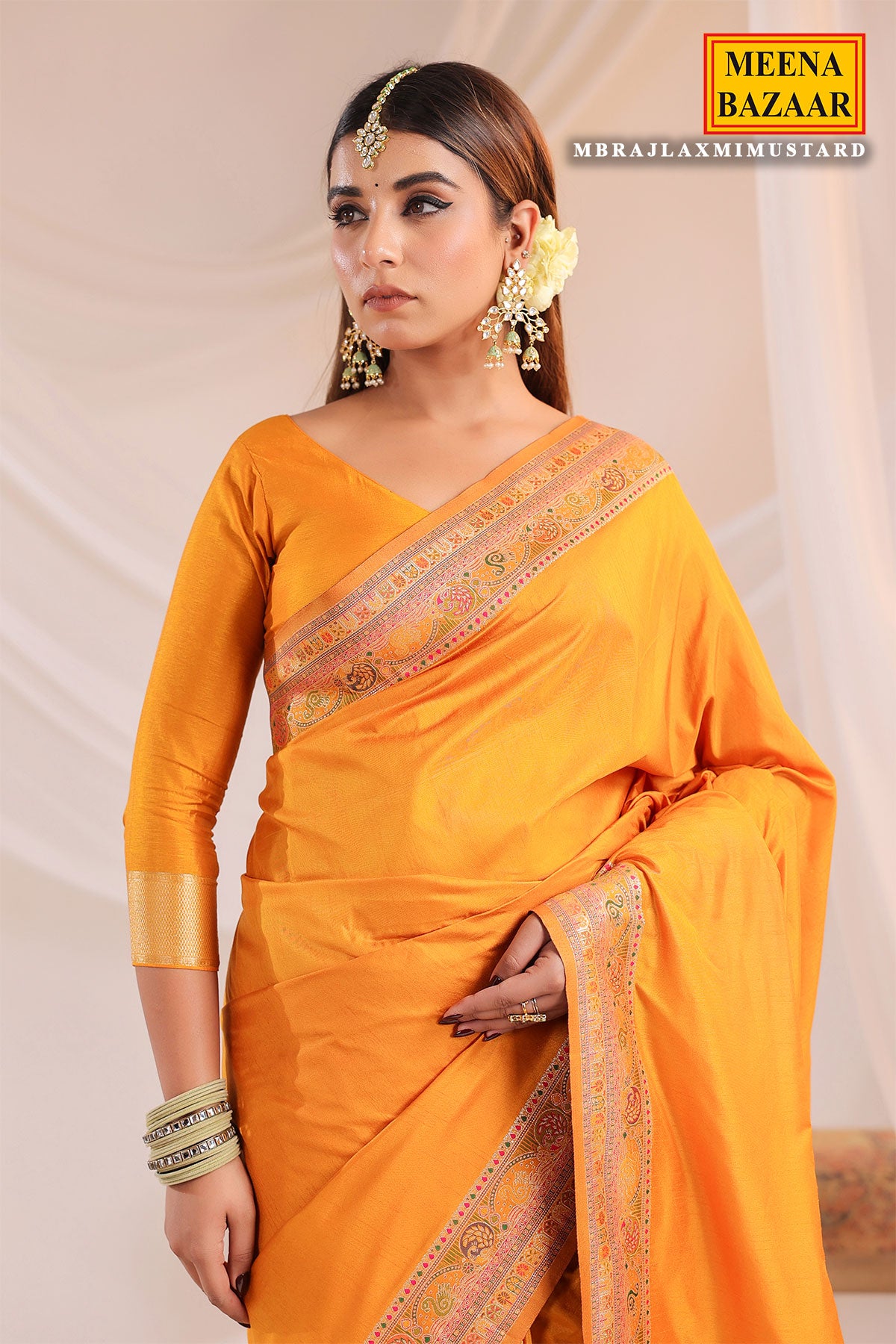Enhance your ethnic wardrobe with this exquisite Mustard Silk Weaving Saree from MeenaBazaar.com. Crafted from luxurious silk fabric, this saree features detailed weaving work that reflects traditional Indian artistry. The rich mustard hue adds a royal and graceful touch, making it perfect for weddings, festive occasions, and cultural celebrations. Soft and elegant, the silk drapes beautifully, offering timeless sophistication with comfort. Pair it with traditional jewelry and matching heels for a complete ethnic look.