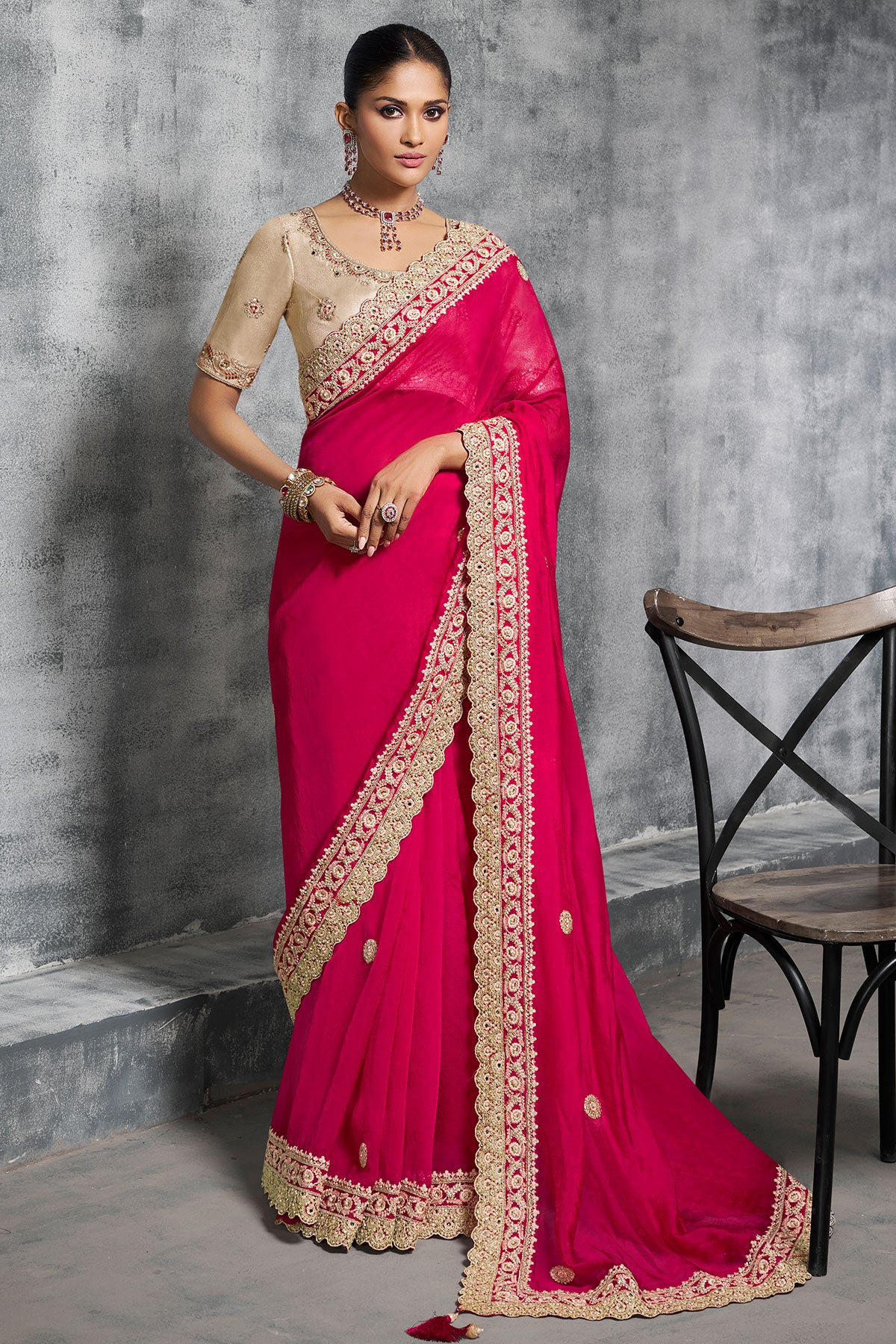 Make a graceful style statement with this stunning crepe saree in a vibrant rani shade. Crafted from premium crepe fabric, it offers a soft, fluid drape and all-day comfort. The saree is beautifully enhanced with delicate embroidered work, adding a touch of sophistication and charm. Perfect for festive occasions, weddings, and special celebrations, this saree blends modern elegance with timeless appeal.