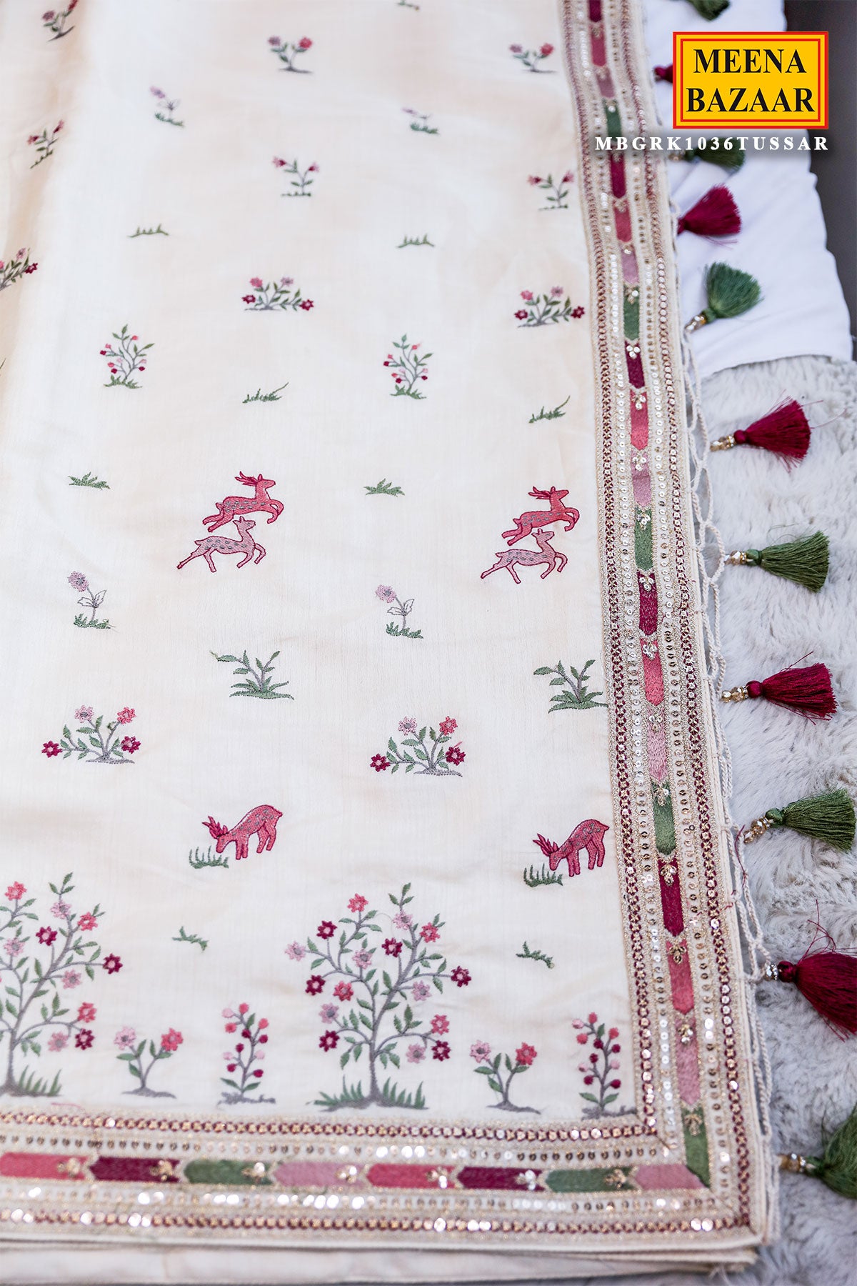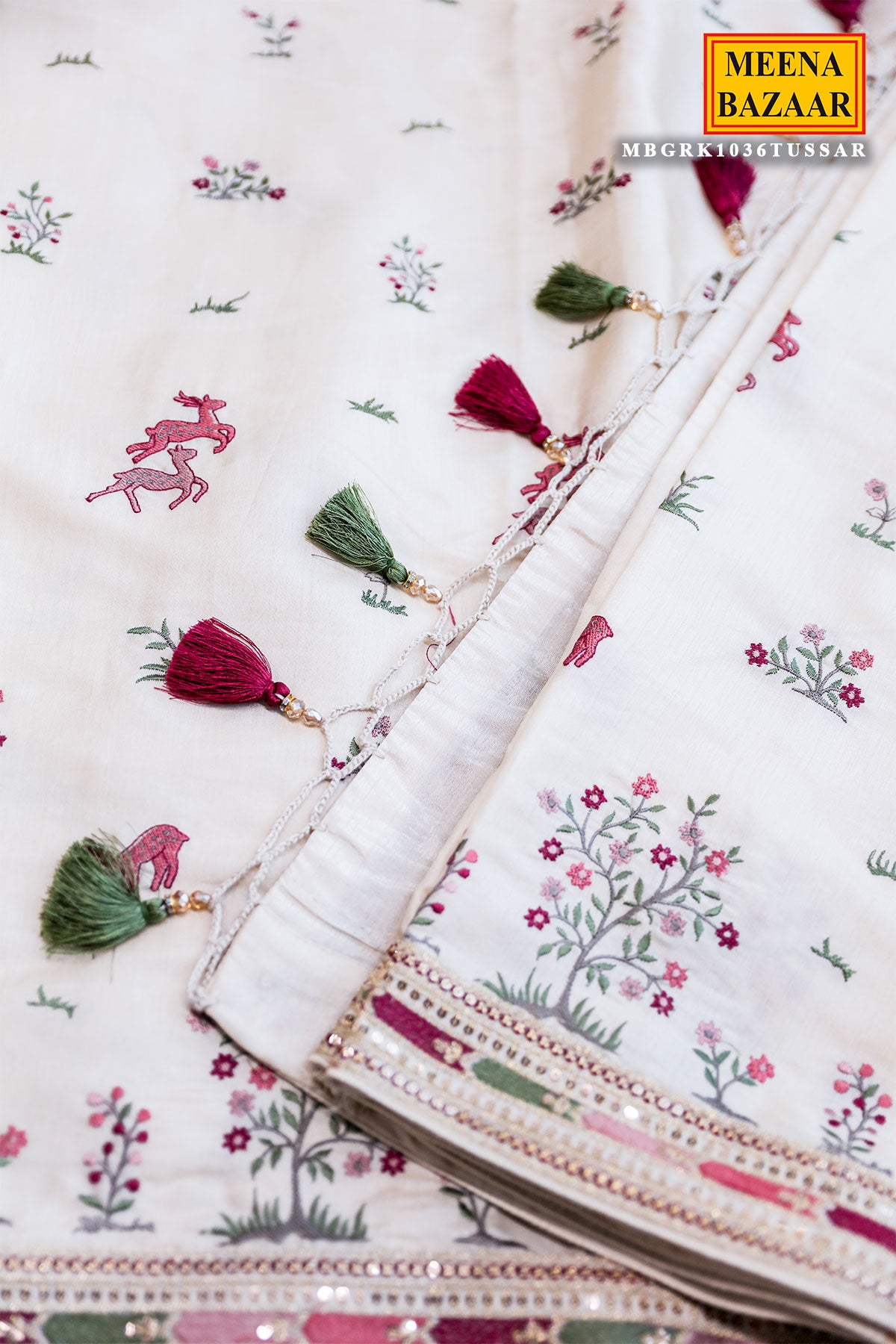 Step into refined elegance with this Tussar Silk Thread & Resham Embroidered Saree from Meena Bazaar. Crafted from rich tussar fabric, known for its natural texture and subtle sheen, this saree beautifully blends tradition with sophistication. The intricate thread and resham embroidery adds depth and artistry, making it a timeless choice for festive occasions, weddings, and cultural celebrations.