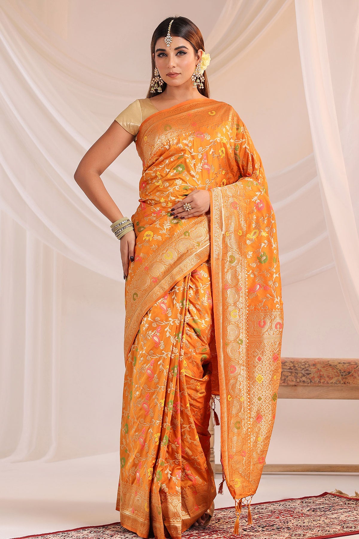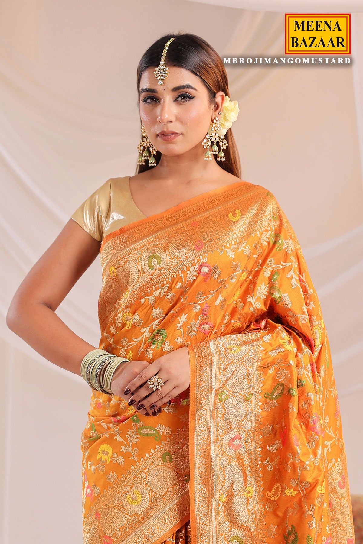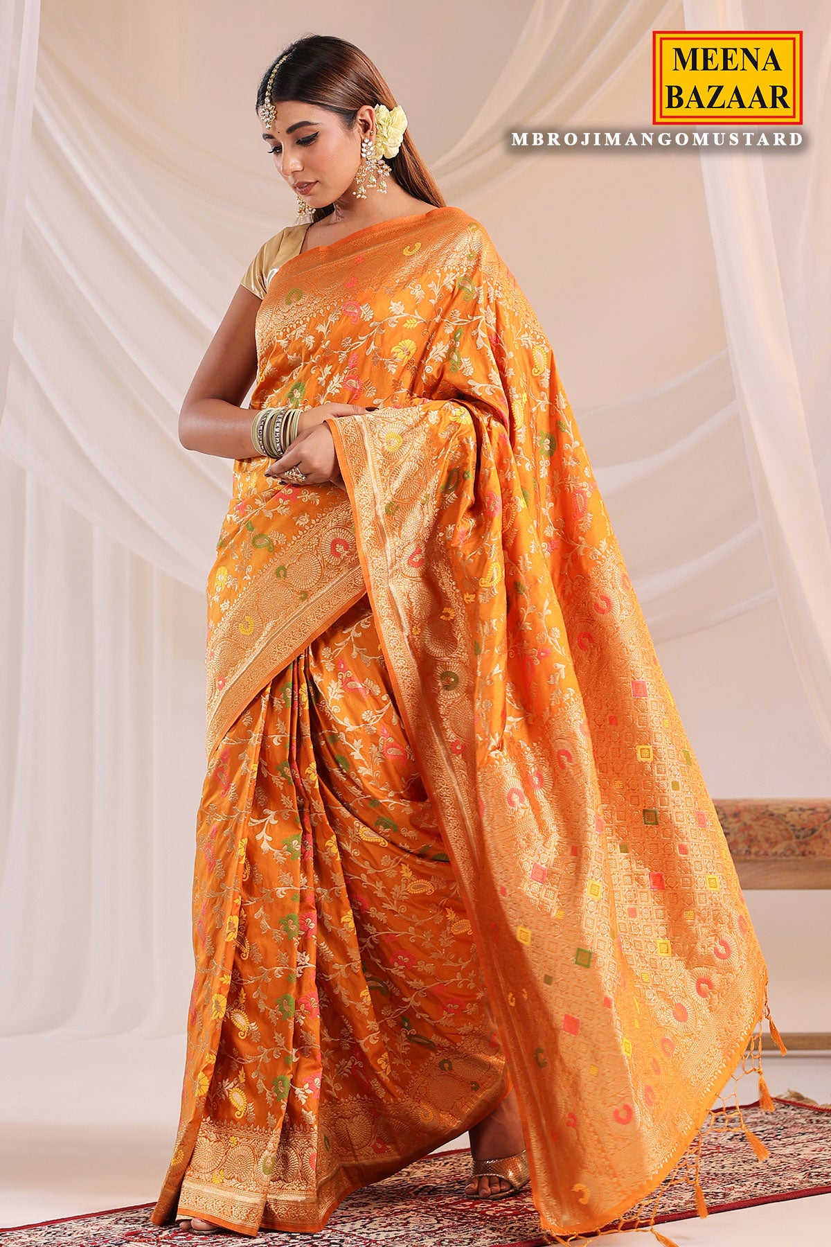 This is a Mustard Silk Weaving Saree from Meena Bazaar. Crafted from premium silk fabric, this saree features intricate weaving work that enhances its rich texture and traditional appeal. The soft yet vibrant Mustard shade adds a touch of femininity and charm, making it a perfect choice for weddings, festive celebrations, poojas, family functions, and special occasions. Designed to drape beautifully, this silk weaving saree offers both comfort and luxury. It comes with a matching unstitched blouse fabric, giving you the freedom to customise your blouse style as per your preference. Pair it with traditional jewellery and heels to complete a classic and sophisticated ethnic look.