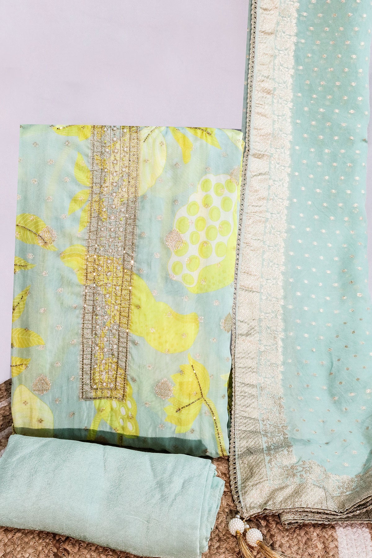 Elevate your ethnic wardrobe with this stunning Firozi Tissue Embroidered Unstitched Suit, crafted to bring together subtle shine and timeless grace. The lightweight tissue fabric drapes beautifully, offering a luxurious sheen that enhances its festive appeal.