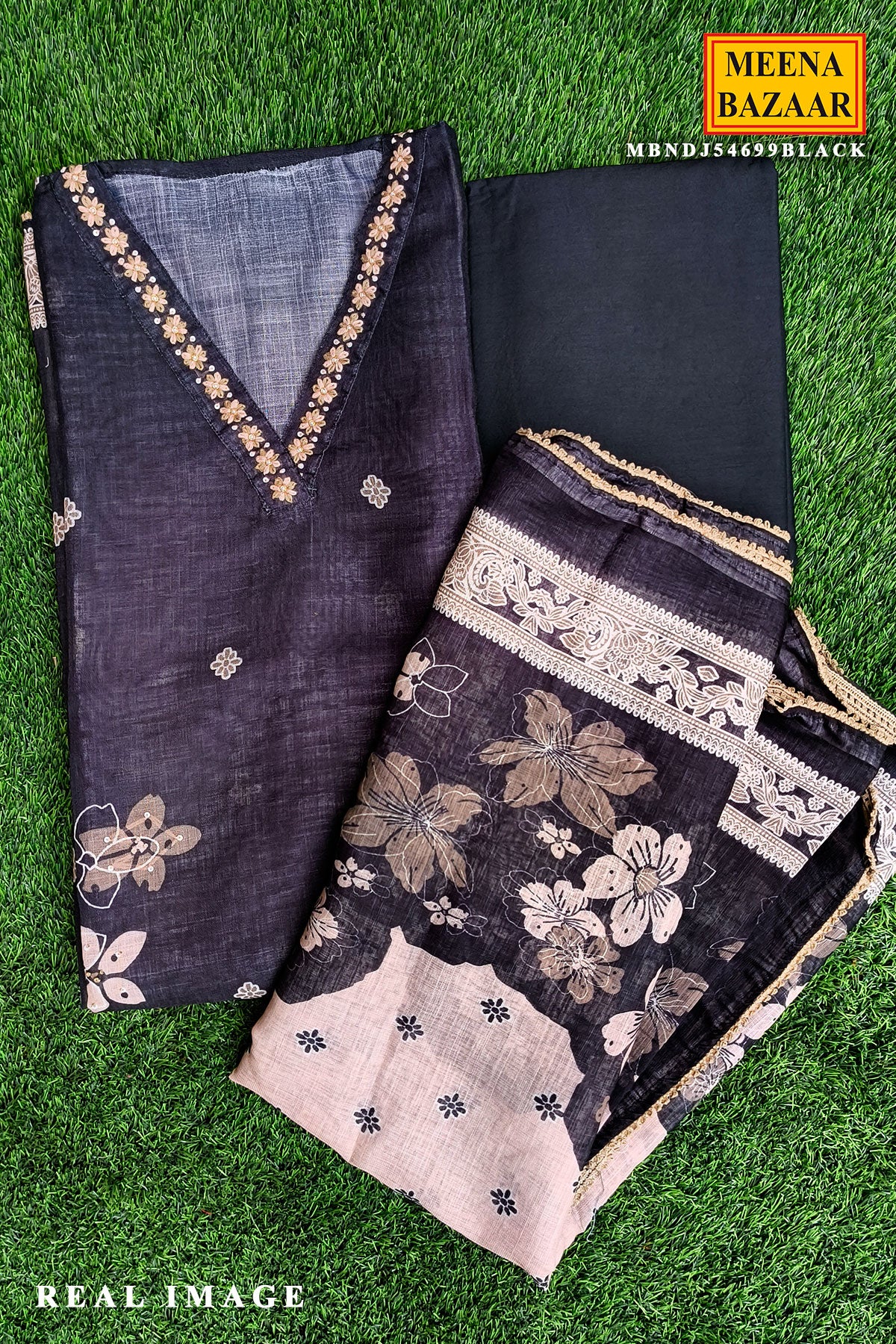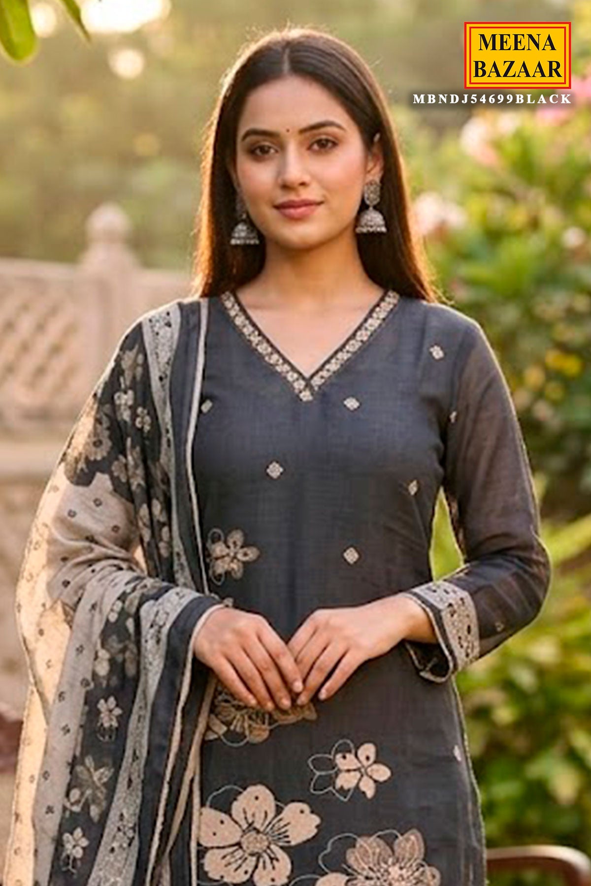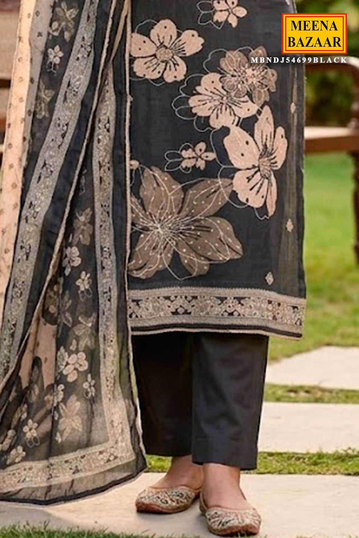 It is paired with coordinated solid trousers in matching black, offering a clean and balanced look that complements the detailed kurta. The ensemble is beautifully completed with a sheer printed dupatta, featuring soft floral patterns and elegant borders that enhance the overall sophistication while adding lightness and flow. Ideal for casual gatherings, workwear, and subtle festive occasions, this suit set is a perfect blend of modern grace and traditional appeal.