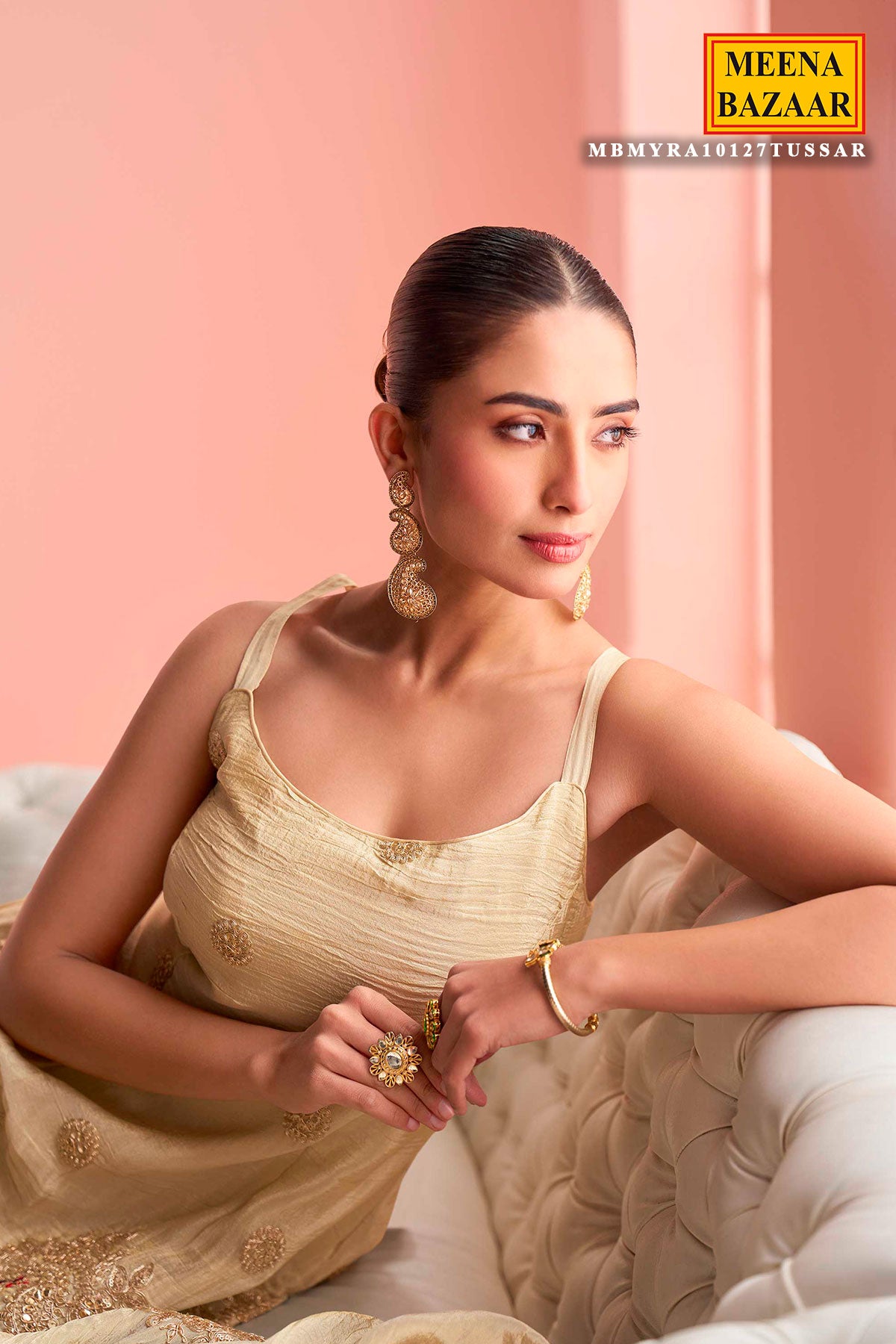 This is Crushed Tussar Silk Sharara Set from MeenaBazaar.com, designed to make your festive moments truly special. The sleeveless silk shirt is adorned with delicate aari and gota embroidery, exuding timeless grace. It comes with extra fabric for sleeves to allow customization as per your style preference.The sharara pants feature intricate heavy work, adding a regal touch to the ensemble. Completing the look is a crushed tussar silk dupatta beautifully detailed with embroidered motifs and curved edges, enhancing the overall sophistication.