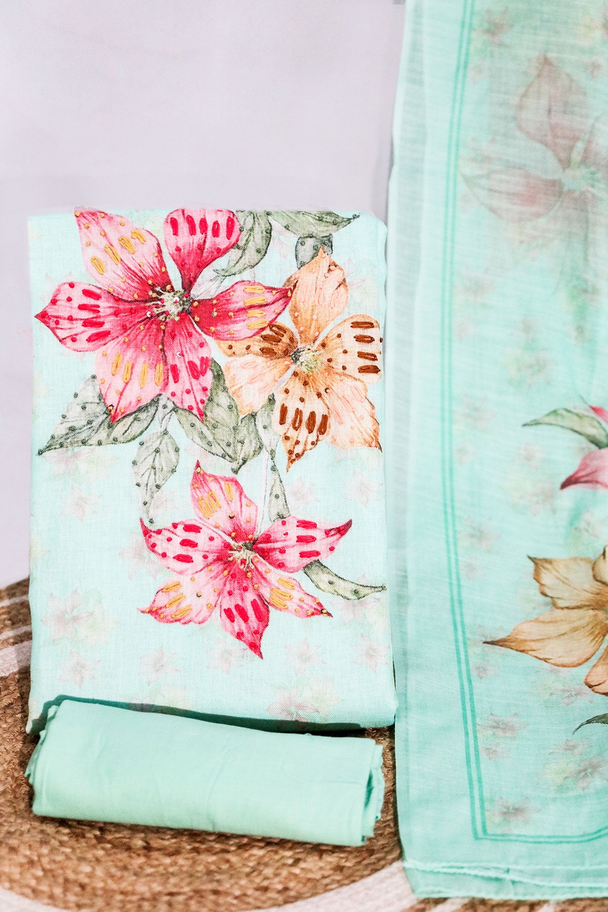 Charming Firozi suit featuring bold floral prints enhanced with delicate thread work for a graceful touch. Paired with a plain bottom and a matching printed dupatta, this set is perfect for casual outings, summer gatherings, or elegant daywear. Note: Color may slightly be different from the actual item due to photographic lighting sources or the monitor's settings.