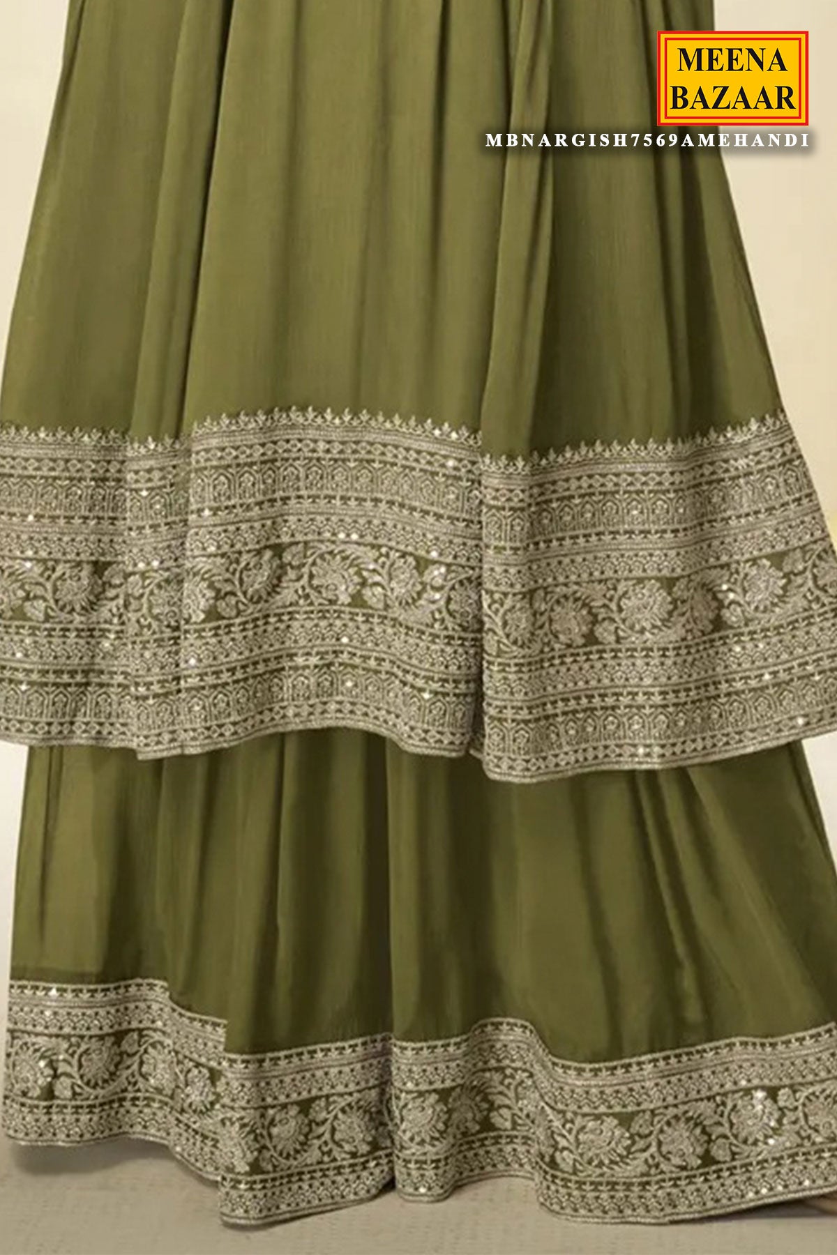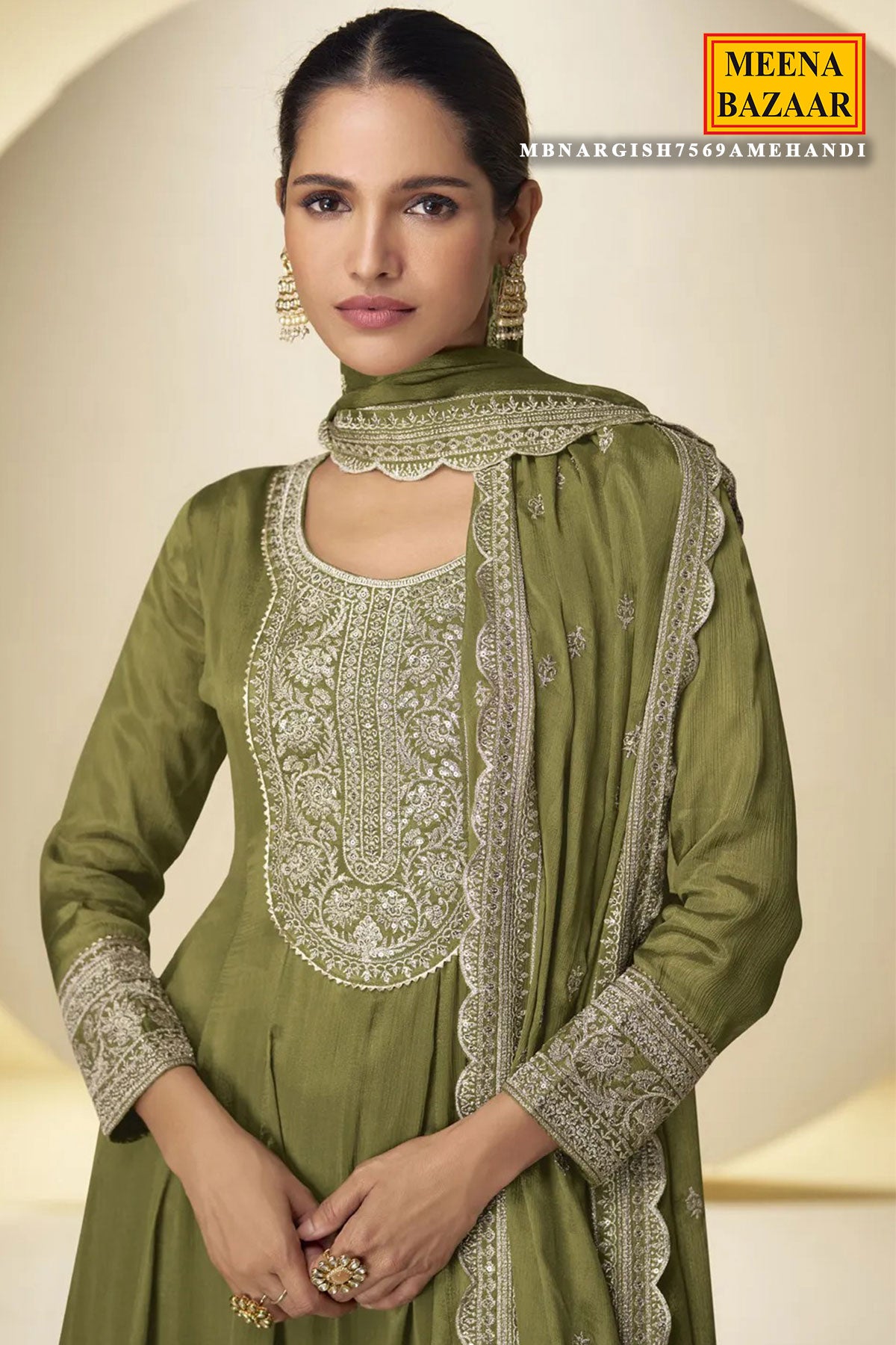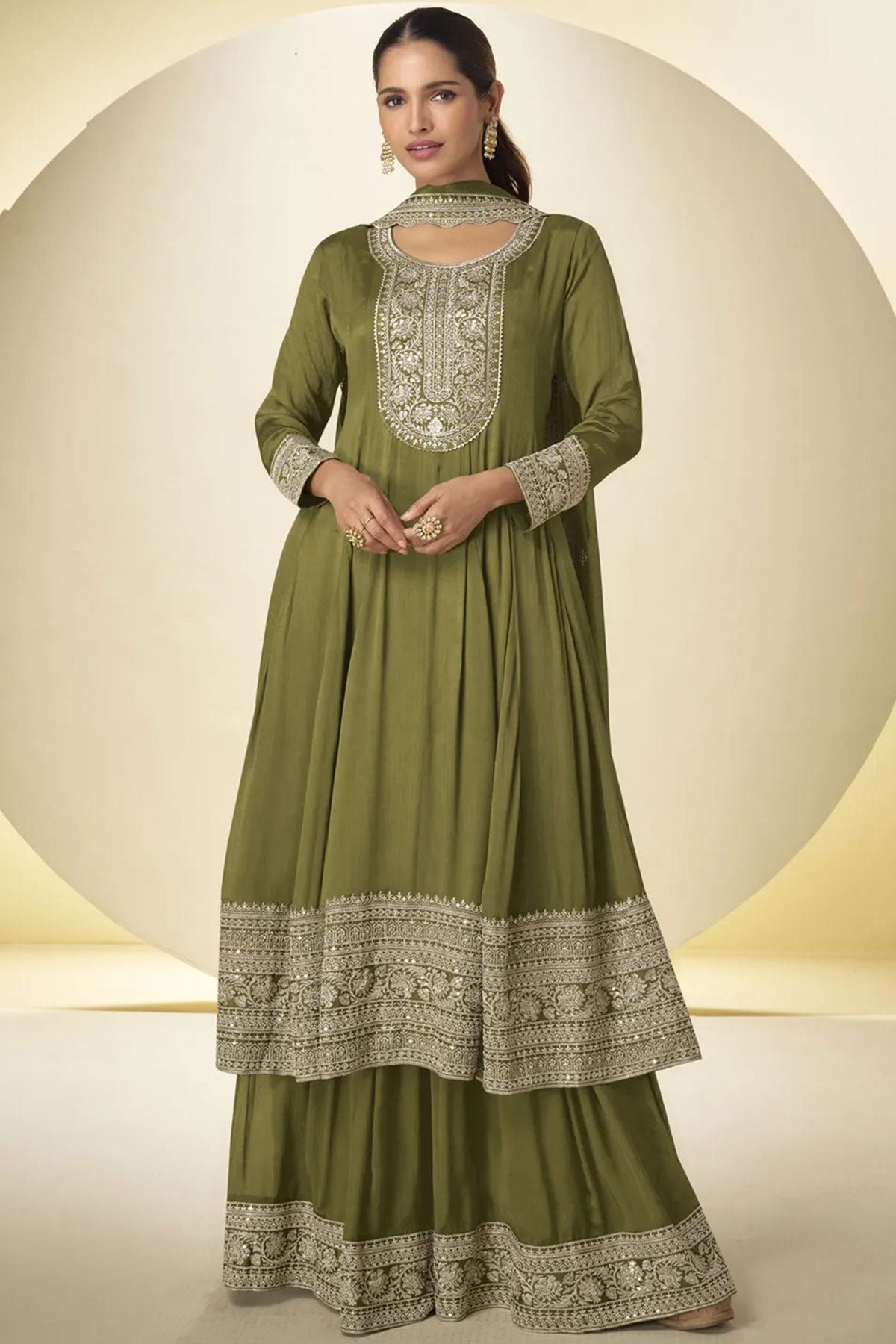Elevate your festive wardrobe with this luxurious Mehandi Ready-Made Suit, crafted in premium Chinon fabric that offers a soft, flowy, and graceful drape. The rich Mehandi hue brings a timeless ethnic charm, making it perfect for festive occasions, family gatherings, and celebrations.