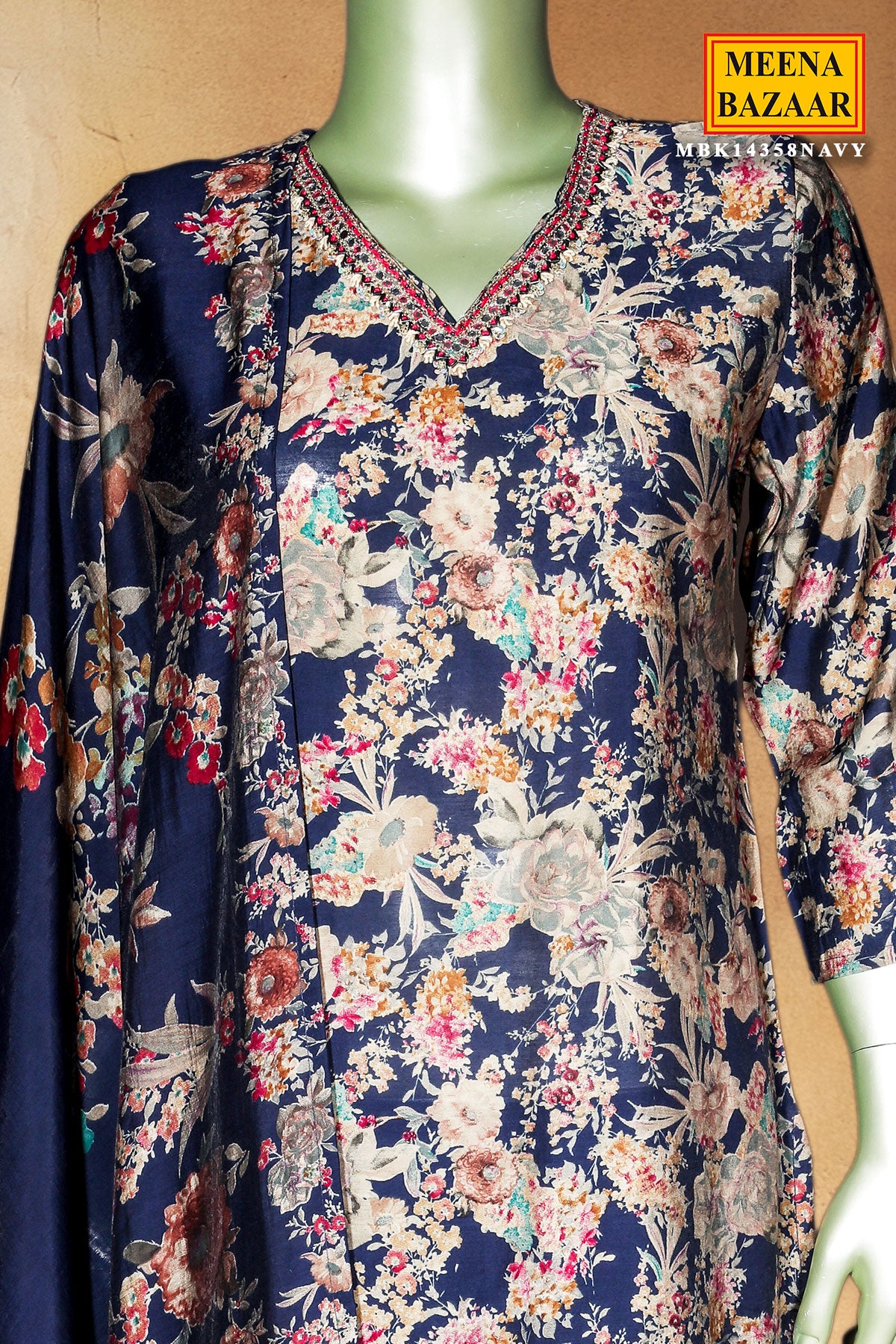 Navy Maslin Ready Made Suit with Elegant Neck Embroidery