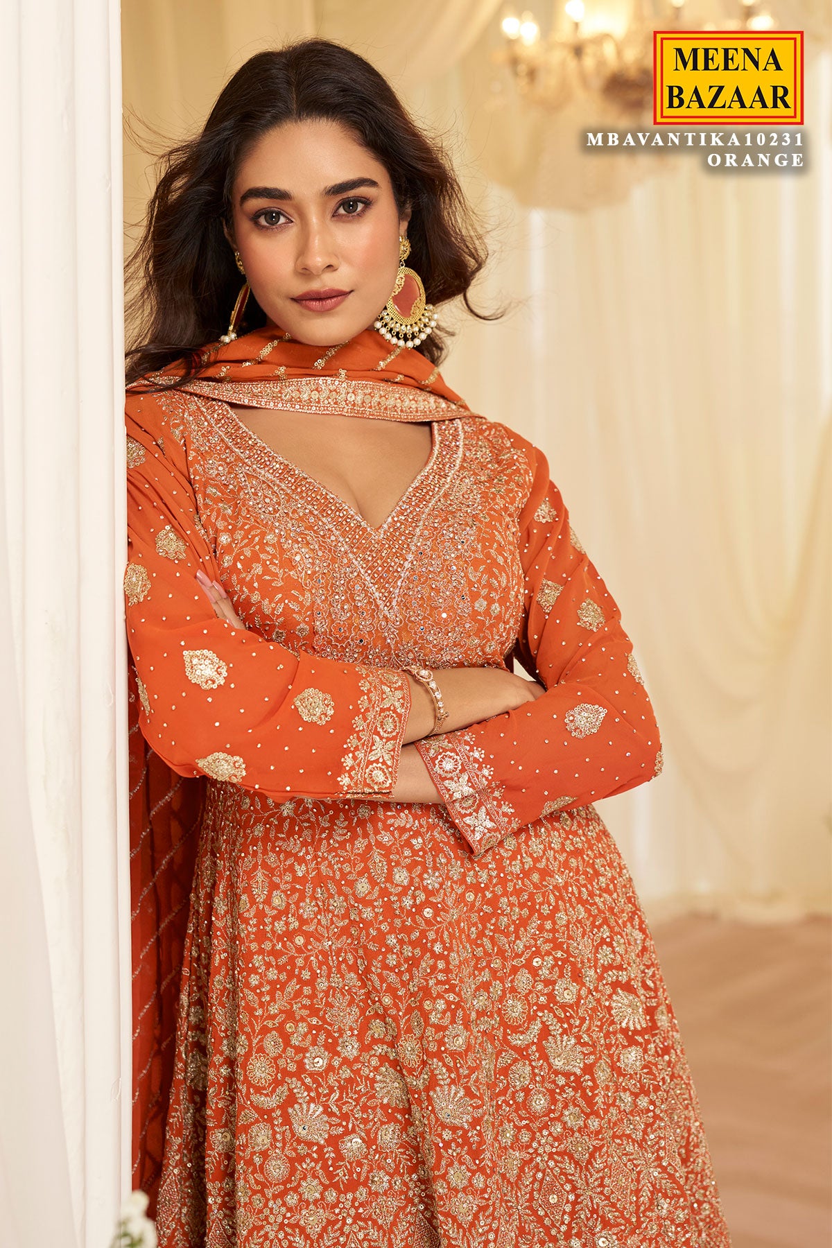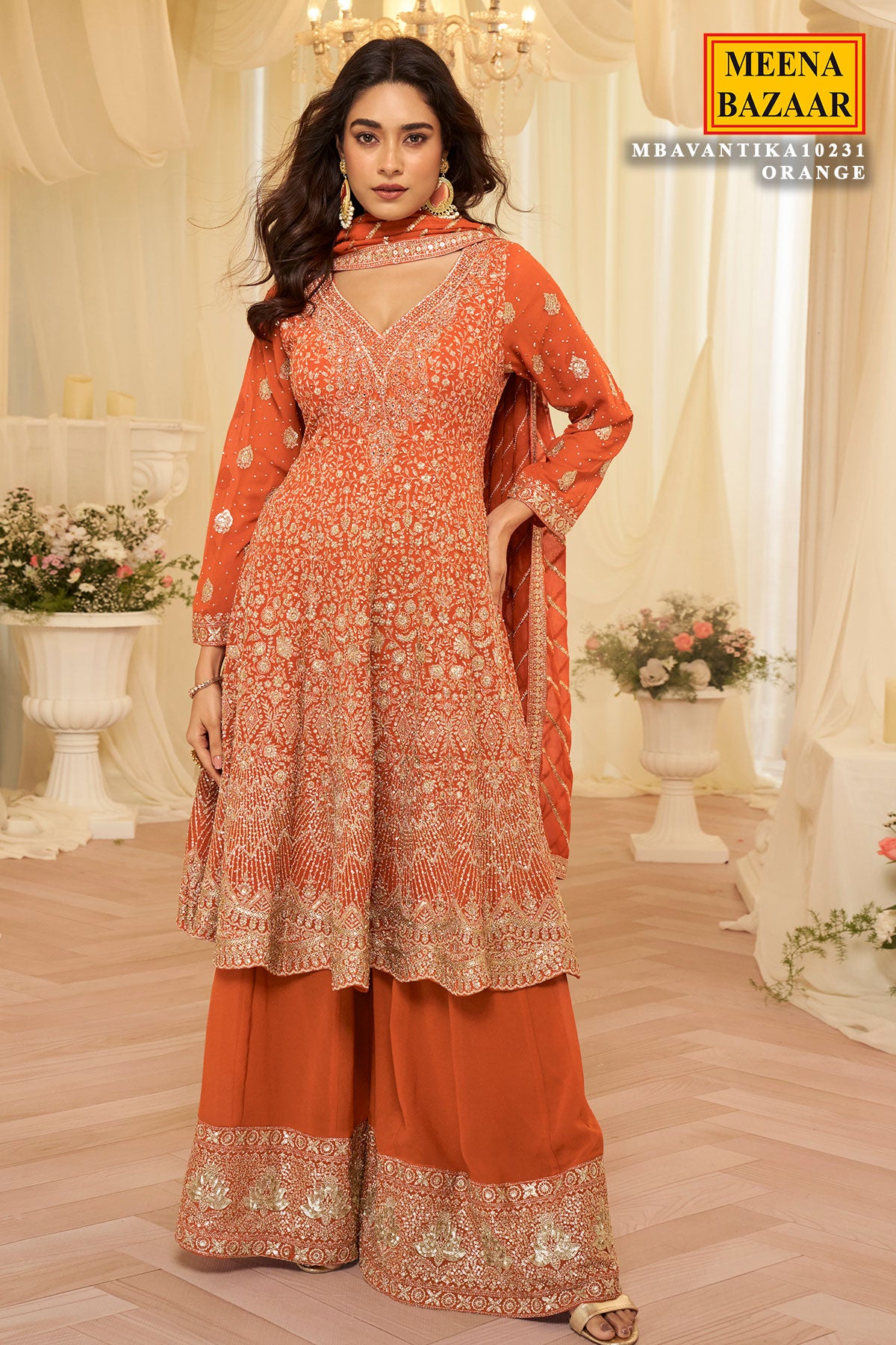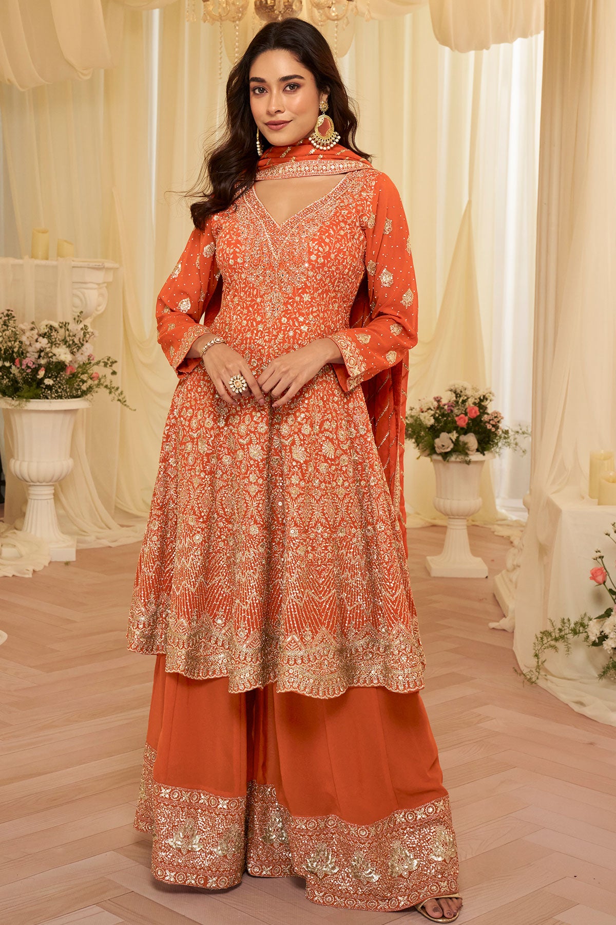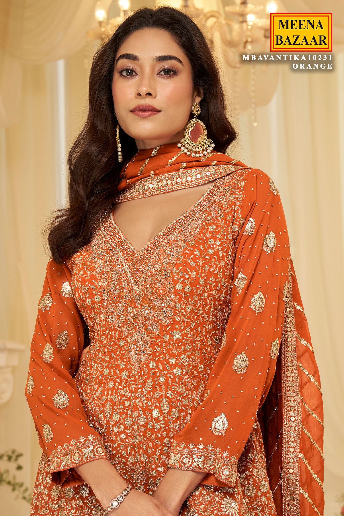 Designed in a vibrant orange shade, this outfit radiates warmth and festive charm. The suit is beautifully enhanced with intricate sequence work and zari embroidery, adding a subtle shimmer and a touch of traditional artistry. The detailed embellishments make it a perfect choice for weddings, festive occasions, and special celebrations.