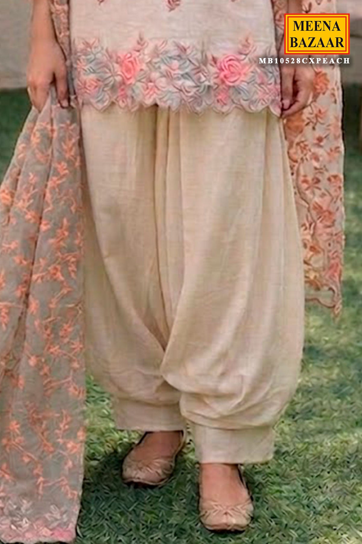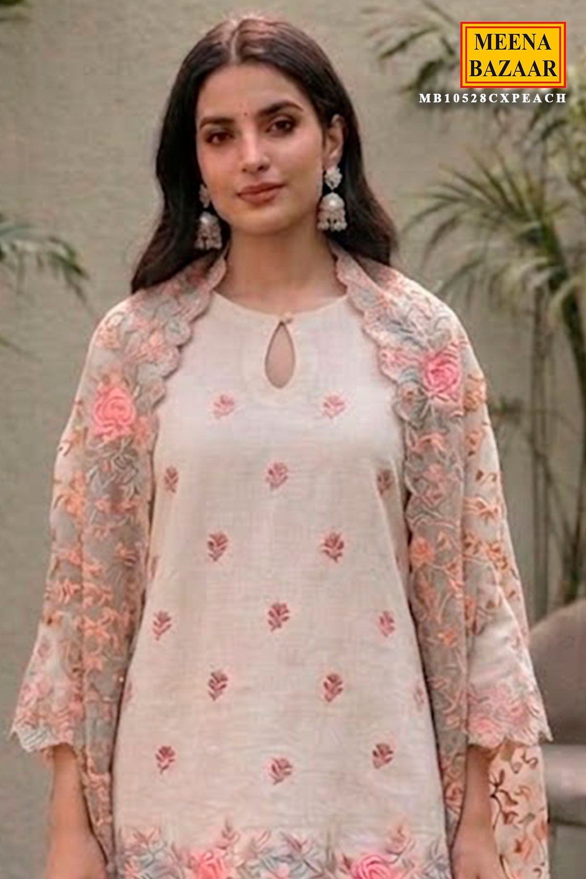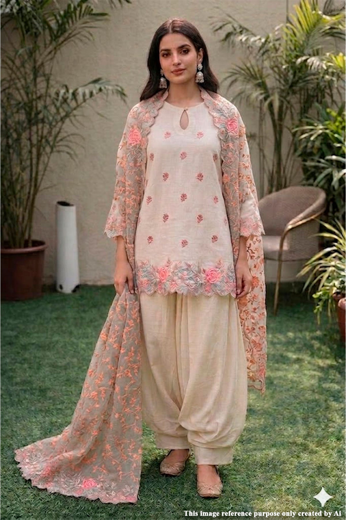 Paired with a matching solid cream coloured bottom fabric, the ensemble is completed with a lightweight dupatta featuring fine botanical embroidery and soft borders, lending an airy, ethereal feel. Perfect for daytime festivities, intimate gatherings, or effortless everyday elegance, this suit piece blends comfort with refined sophistication.