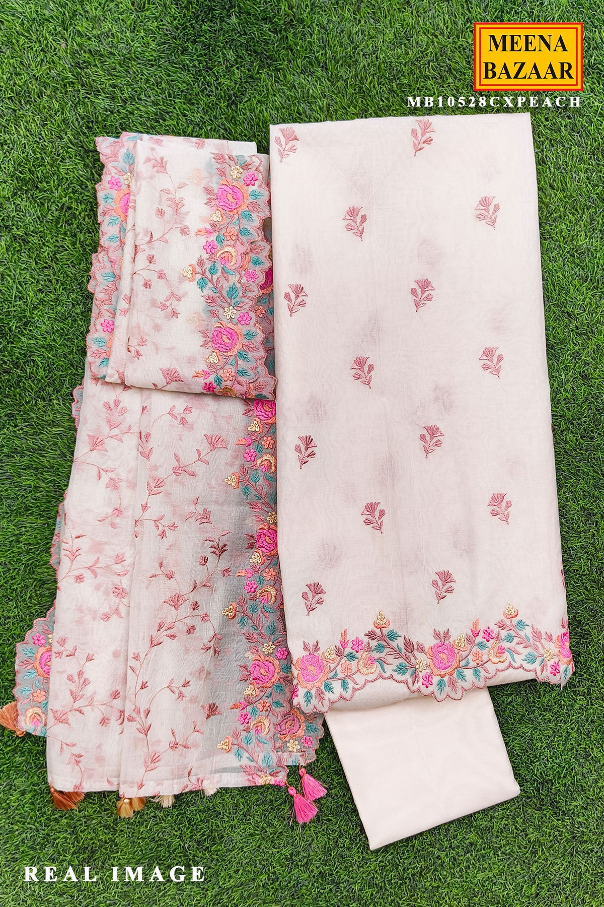 Peach Chanderi Unstitched Suit with Elegant Embroidery