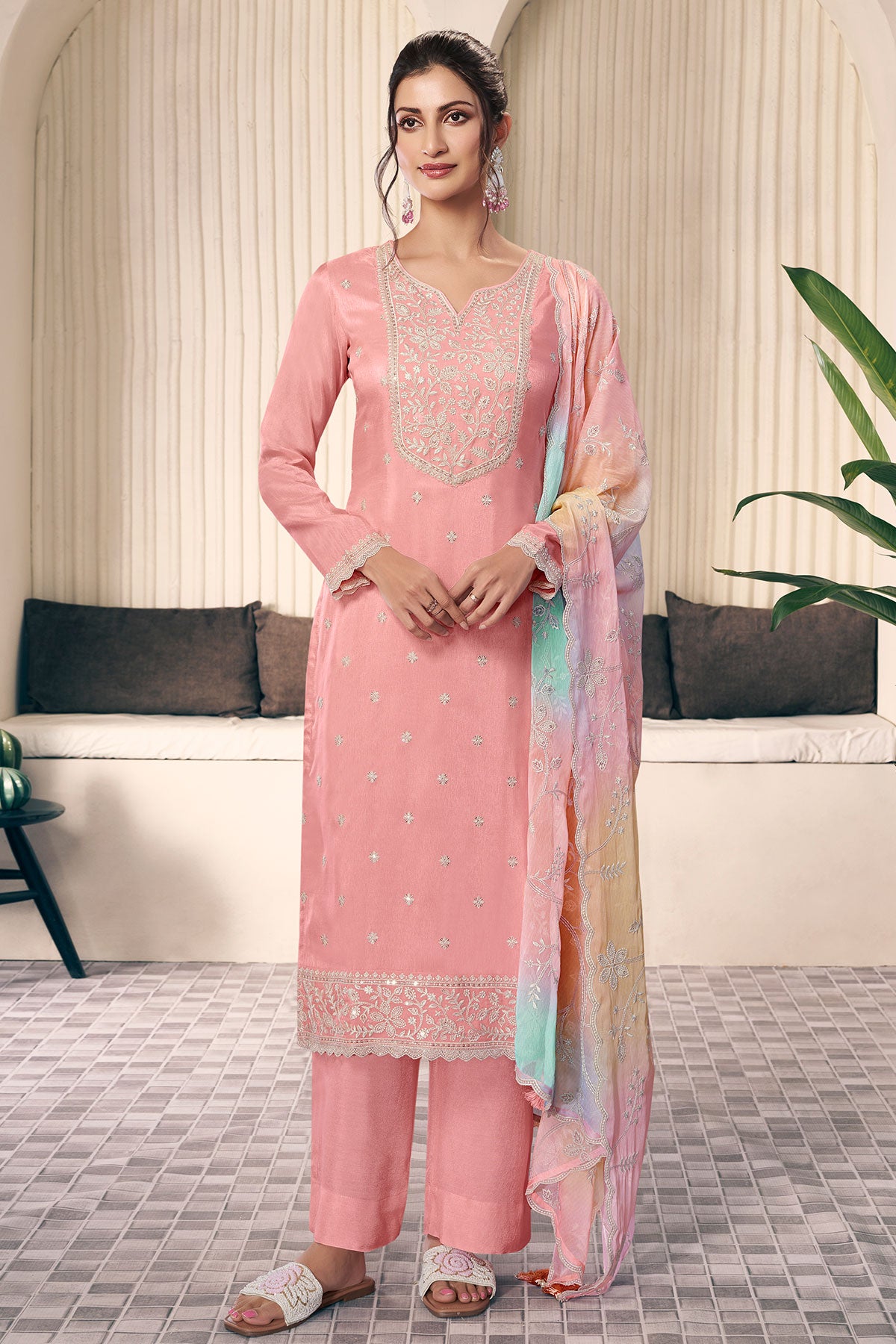 Enhance your ethnic wardrobe with this elegant unstitched suit set crafted from rich silk fabric. Featuring fine embroidery work, this suit comes in a charming pink shade that exudes femininity and timeless appeal. The unstitched design allows you to customize the fit and style as per your preference, making it perfect for festive occasions, celebrations, and traditional wear.