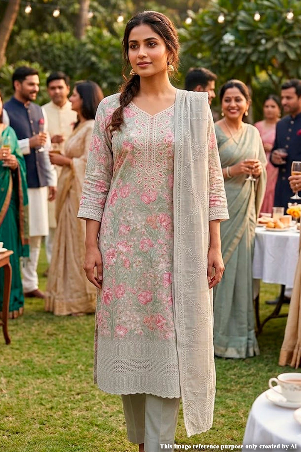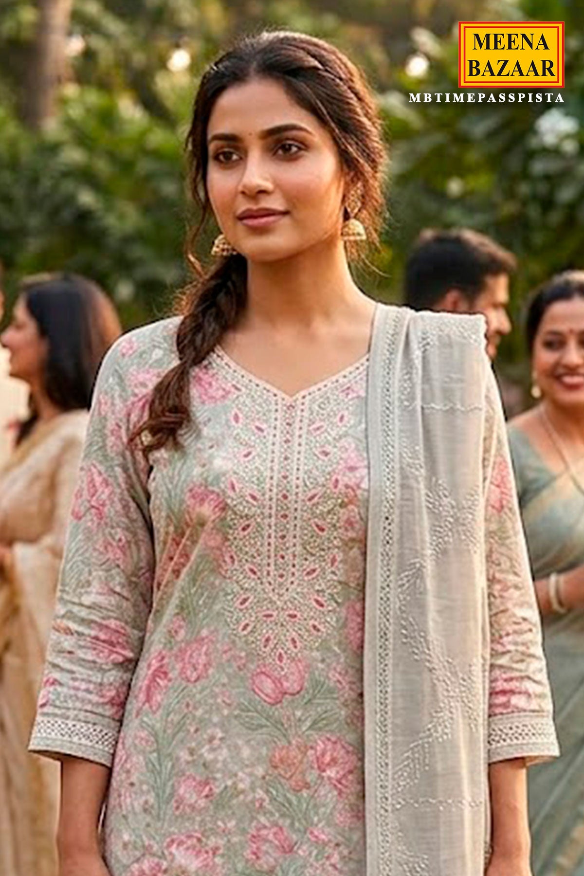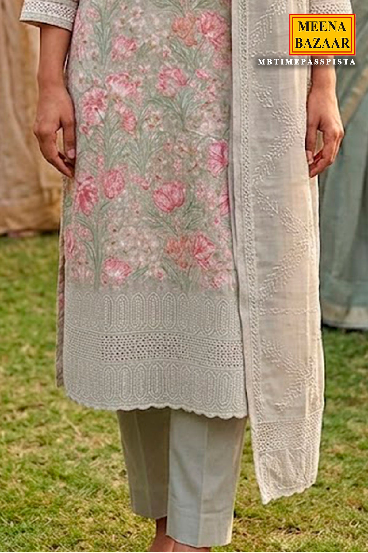 It is paired with solid pista trousers in a soothing mint tone, creating a subtle contrast that enhances the overall aesthetic. The ensemble is completed with a sheer embroidered dupatta in a complementary neutral shade, adorned with delicate patterns and refined border work that adds a touch of sophistication and fluidity. Perfect for daytime festivities, casual gatherings, or elegant everyday wear, this suit set blends soft femininity with timeless charm.