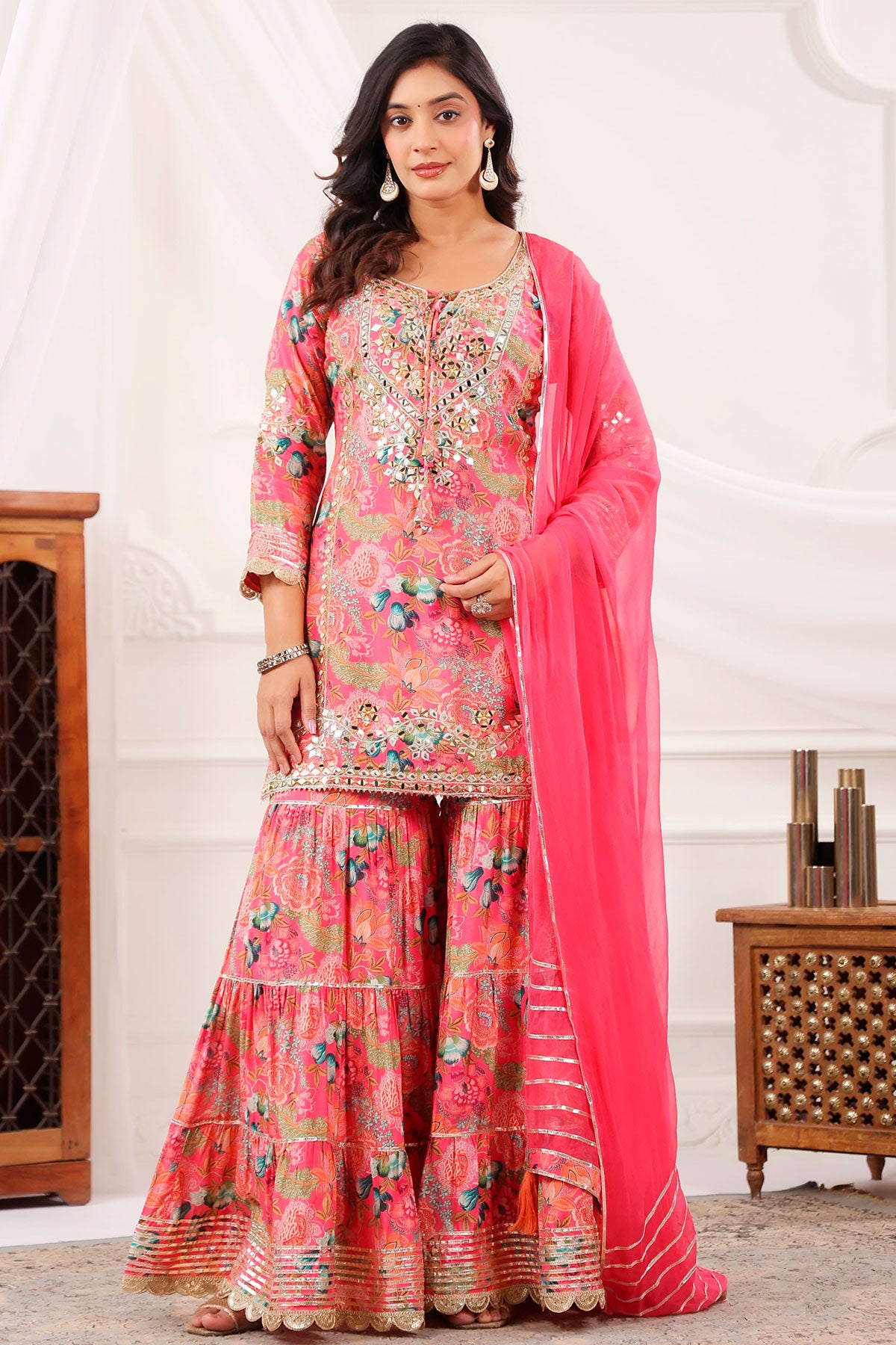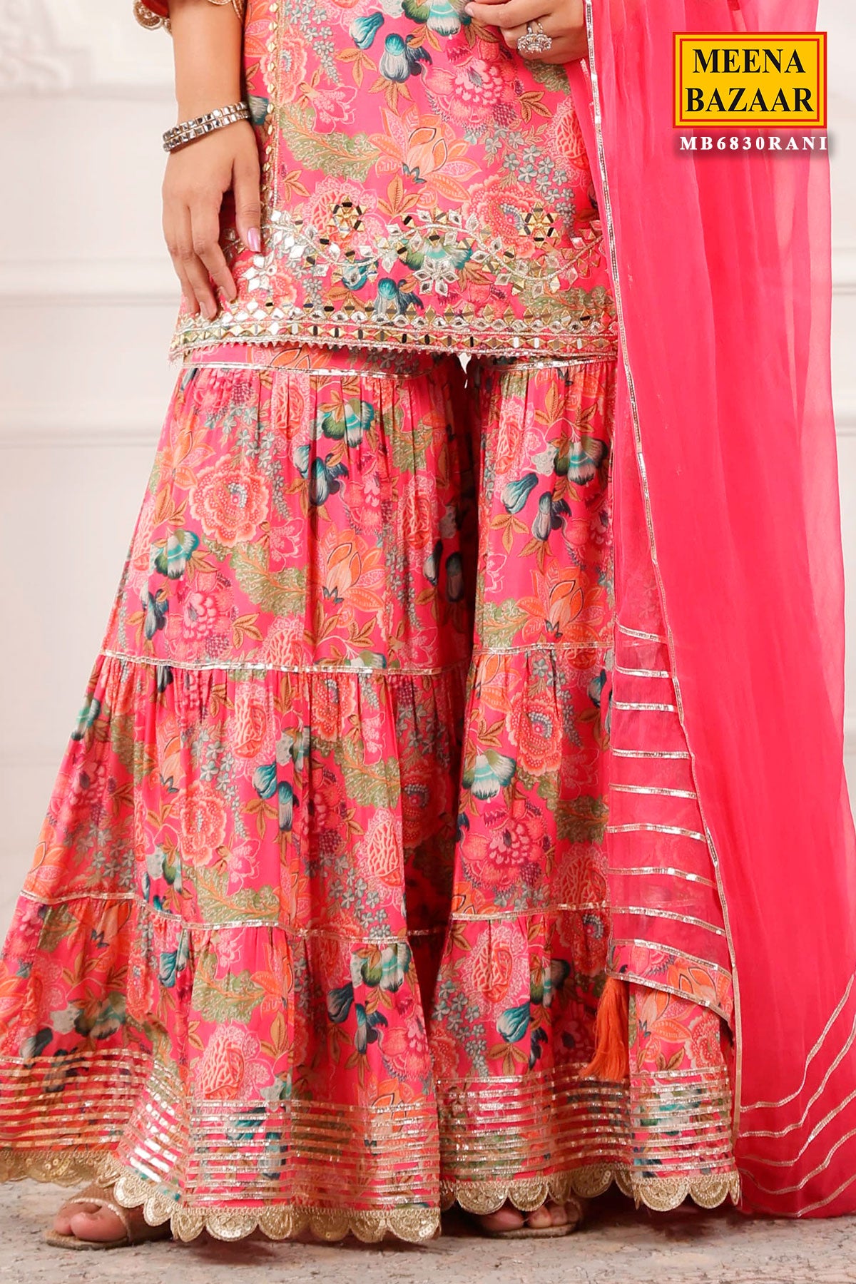 This beautiful Rani Pink Crepe Ready-Made Suit embellished with beautiful Gota Patti work. Crafted from premium crepe fabric, this suit offers a soft, lightweight feel and a comfortable fit, making it perfect for festive occasions, weddings, and special celebrations. The rich rani pink hue enhances its traditional appeal, while the intricate Gota Patti detailing adds a luxurious charm. Designed for convenience, this ready-made suit is easy to wear and style. Pair it with statement earrings, a matching dupatta, and traditional footwear to complete a graceful ethnic look. Ideal for women who love timeless fashion with a modern touch, this suit is a must-have for every festive wardrobe.. Please Note: There may be a slight difference in the product color due to lighting and screen reflections.