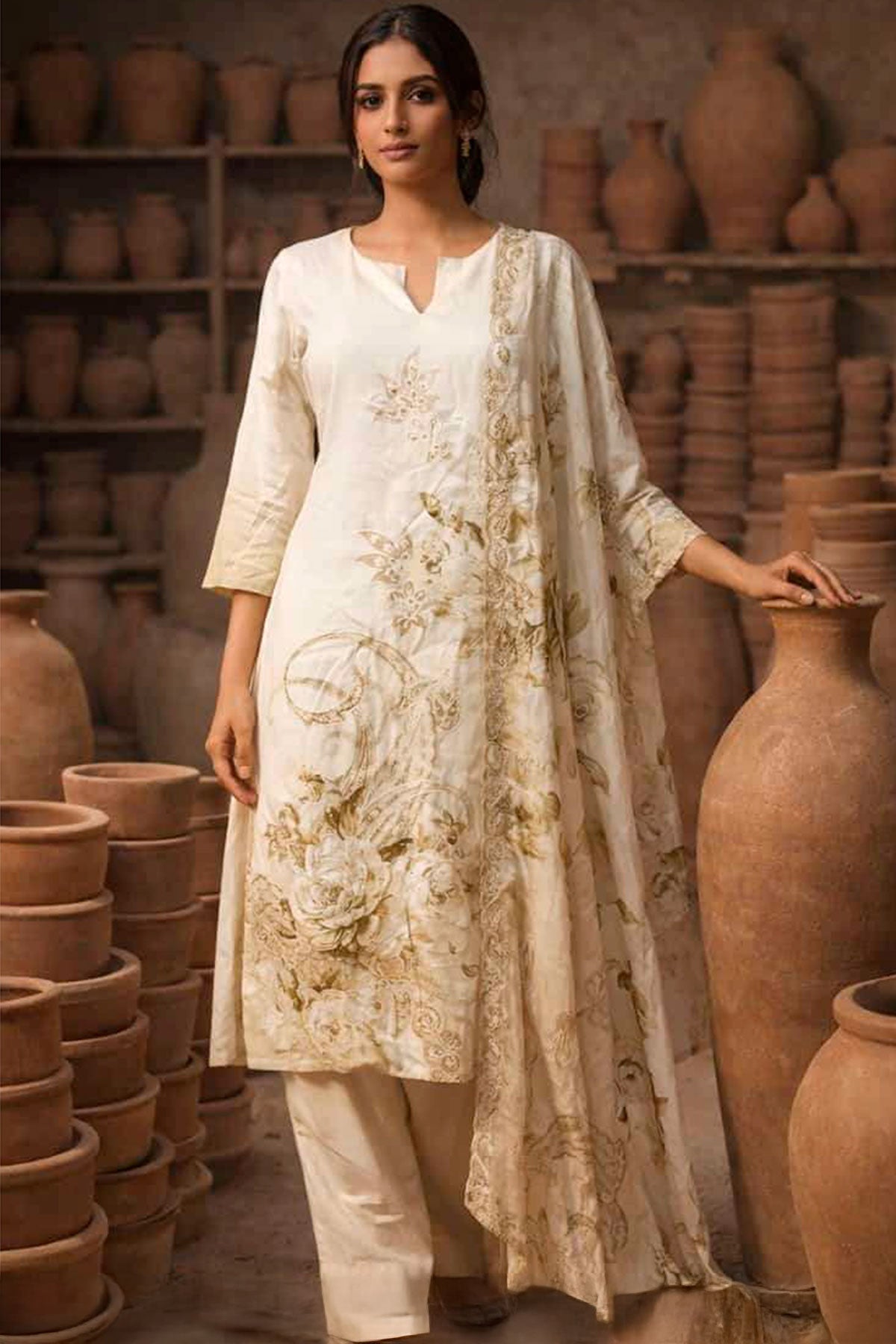 Enhance your ethnic collection with this sophisticated unstitched suit in a rich tussar shade. Crafted from soft and breathable maslin fabric, it offers a graceful fall and comfortable wear throughout the day. The detailed embroidery work adds a refined and stylish touch, making it perfect for festive occasions, celebrations, or elegant daily wear. Customize it to your preferred design and create a timeless outfit that reflects your personal style.