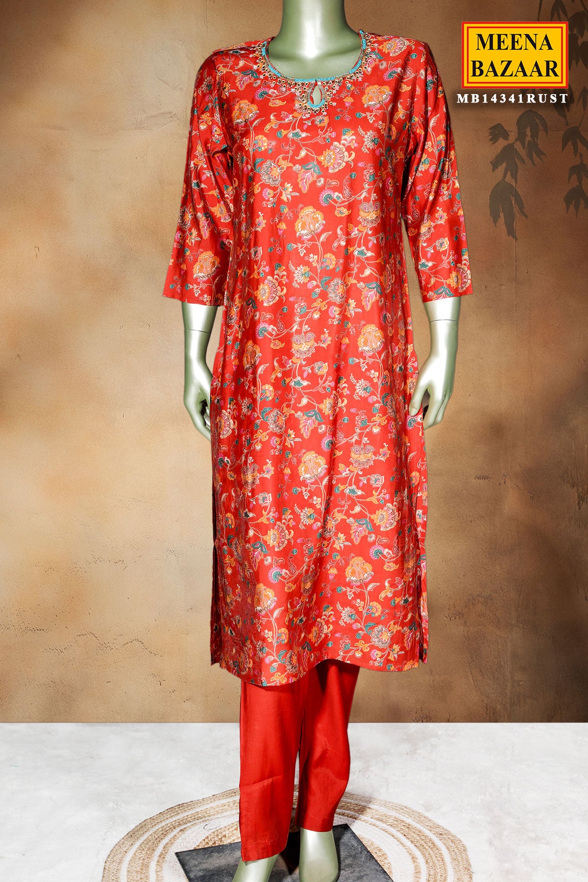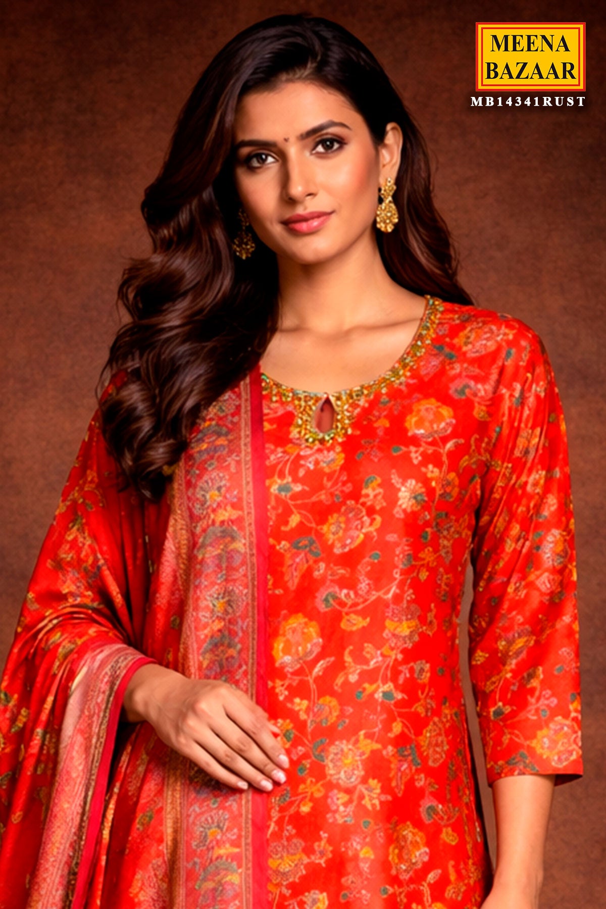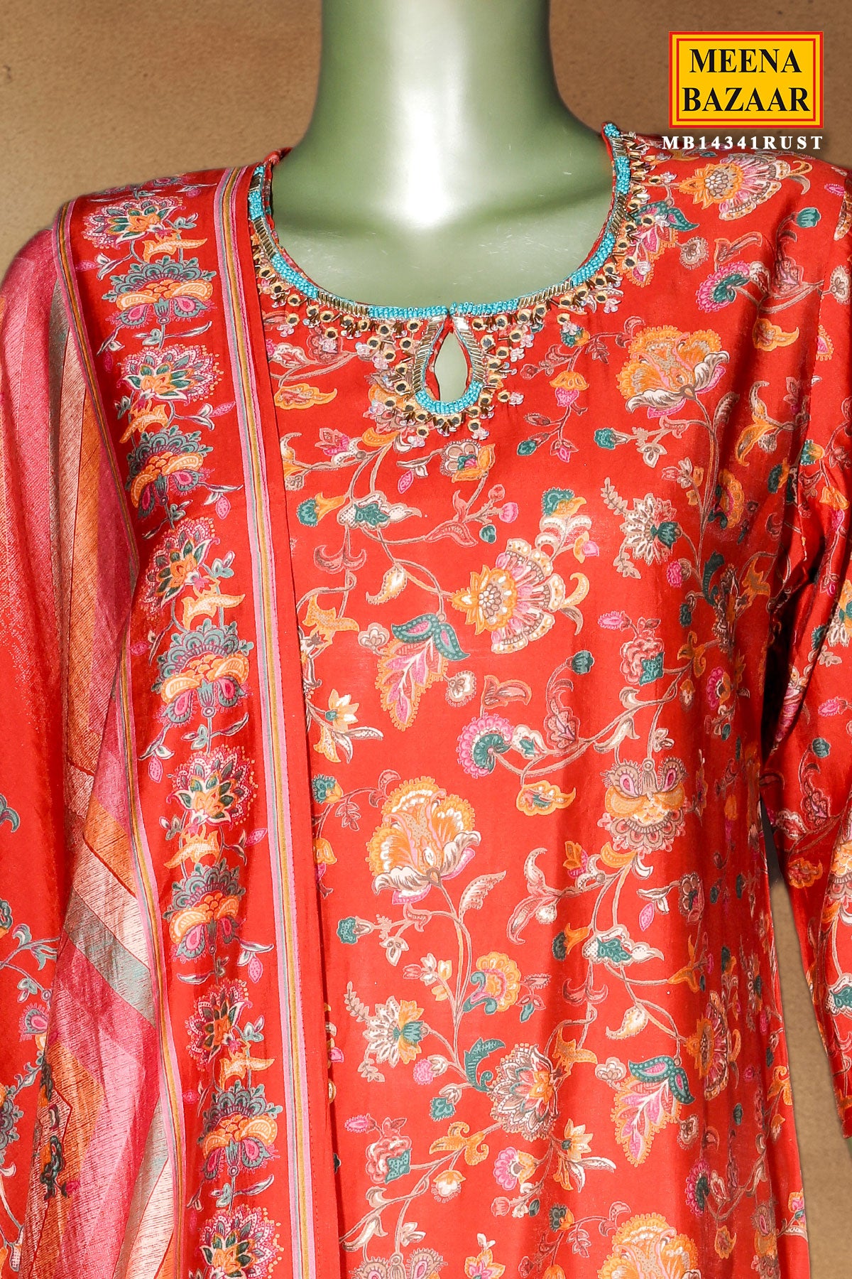 Elevate your ethnic wardrobe with this beautiful Rust Ready-Made Suit crafted in premium Maslin fabric. Designed for effortless elegance, this outfit features a delicately embroidered neckline that adds a refined and graceful touch. The soft and breathable fabric ensures all-day comfort, while the rich rust shade makes it perfect for festive occasions, office wear, and intimate gatherings.