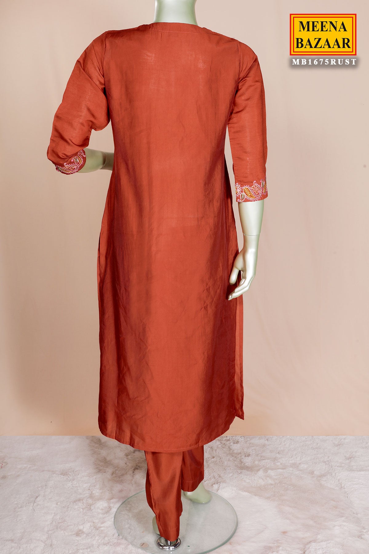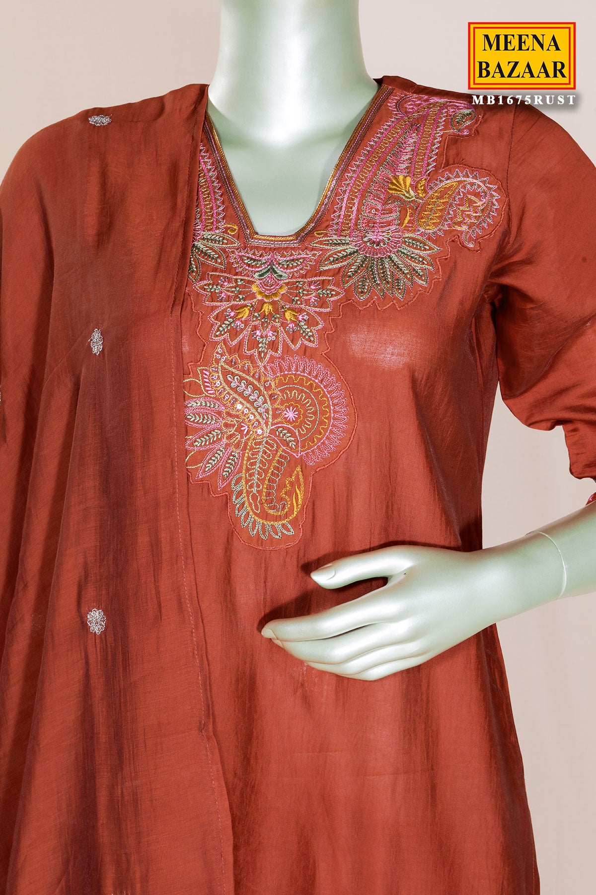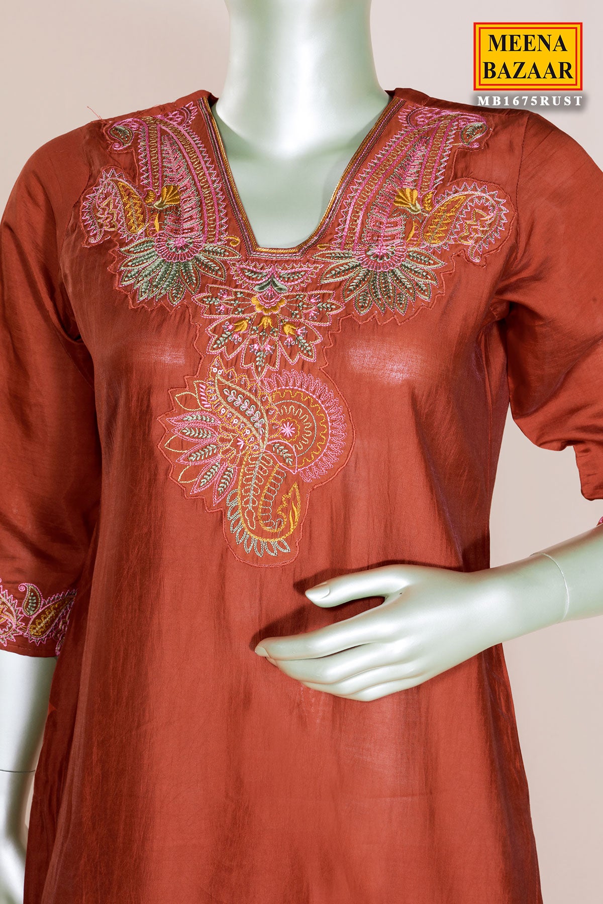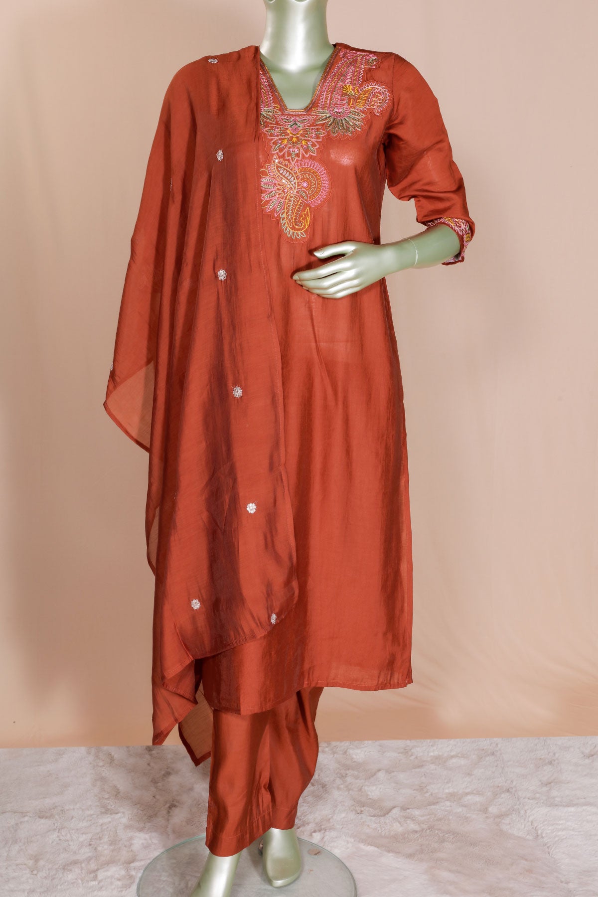 This beautiful Rust Maslin Readymade Suit. Crafted from soft and breathable maslin fabric, this suit features delicate embroidery on the neckline, enhancing its graceful and refined appeal. The vibrant rust shade brings a rich traditional charm, making it suitable for casual outings, office wear, festive gatherings, and daytime functions.Designed for comfort and ease, this readymade maslin suit offers a flattering fit and effortless styling. Pair it with minimal jewellery and matching footwear for a polished ethnic look. Please Note: There may be a slight difference in the product color due to lighting and screen reflections.