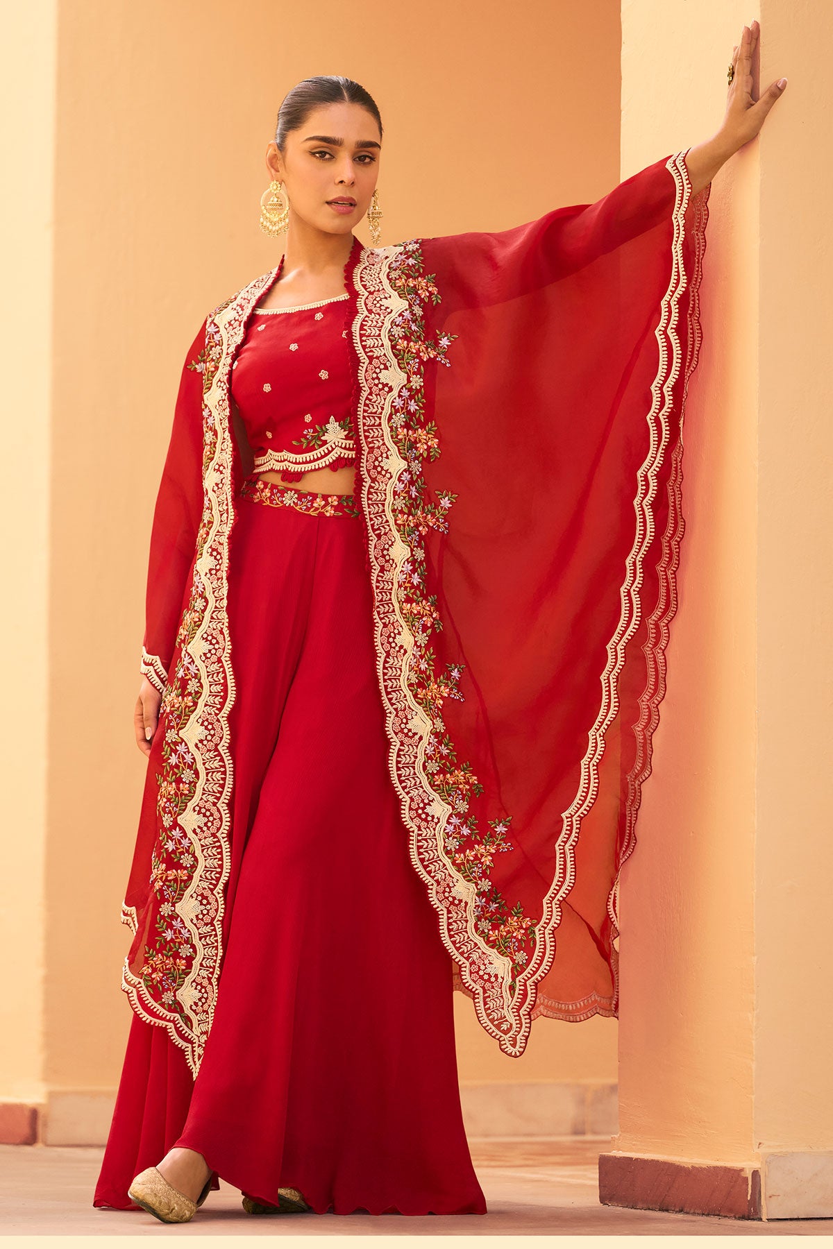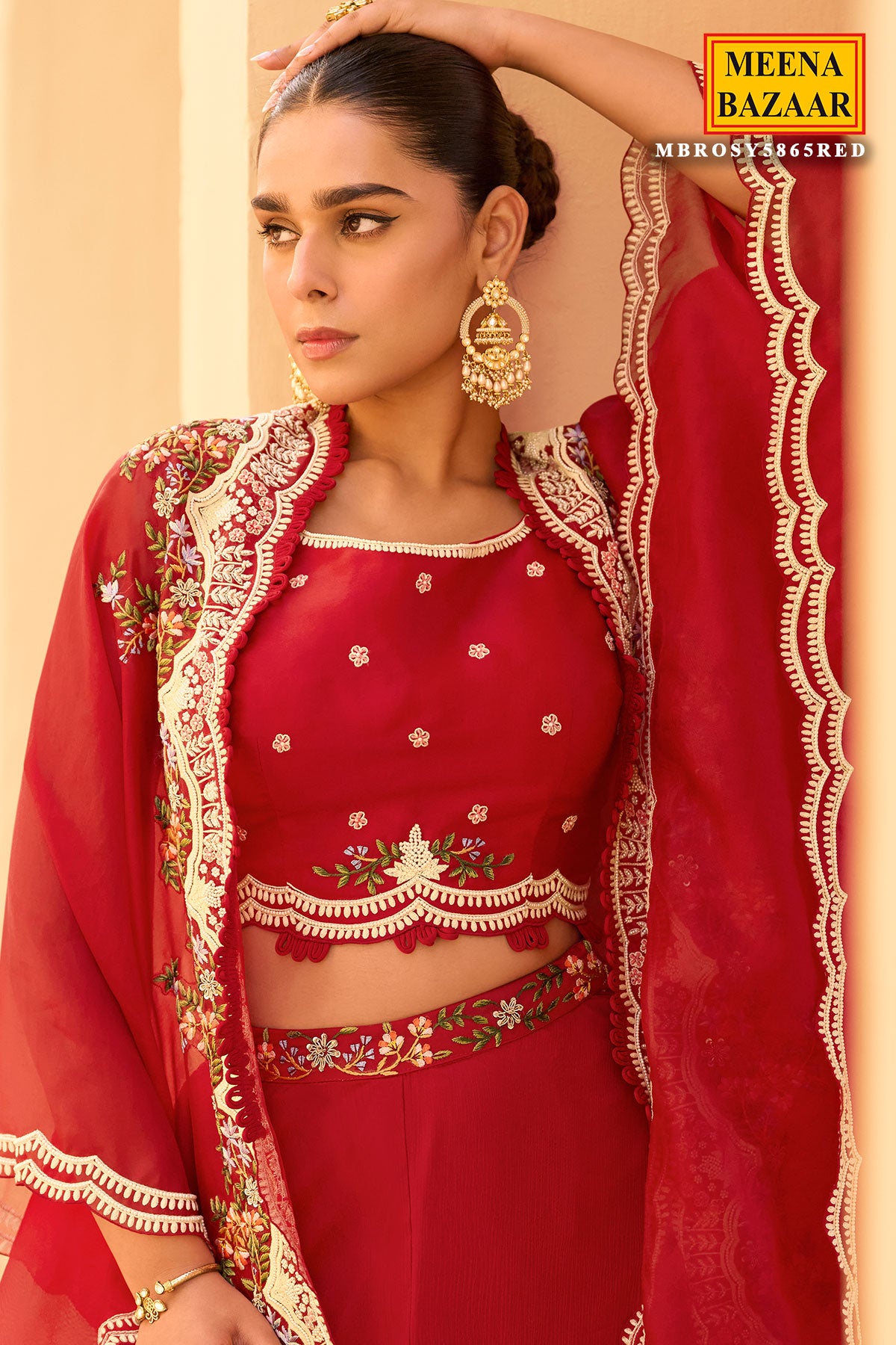This exquisite Red Pink Embroidered Cape Style Suit from Meena Bazaar. Designed for the modern woman who admires traditional artistry, this ensemble features a rich and vibrant Red pink shade that exudes elegance and festive charm. The highlight of this outfit is the beautifully crafted embroidered cape, adding a graceful and contemporary twist to a classic silhouette. The cape showcases intricate floral thread embroidery across the neckline, shoulders, and border, creating a stunning visual balance of refinement and festive detailing. Crafted with premium fabrics, the cape is made in Organza, offering a sheer luxurious look, while the suit is tailored in Georgette, providing comfort, movement, and an effortless drape. The flared bottom completes the look with flowy finesse perfect for sangeet nights, cocktail parties, festive gatherings, and wedding events.