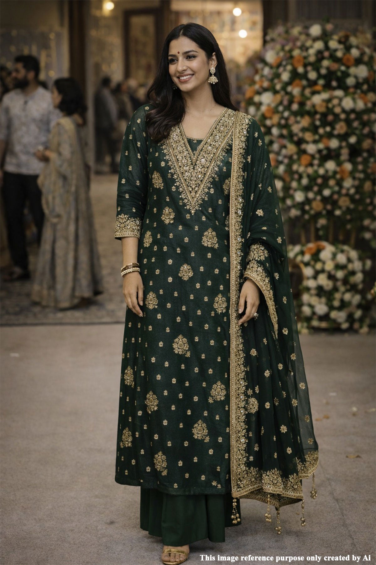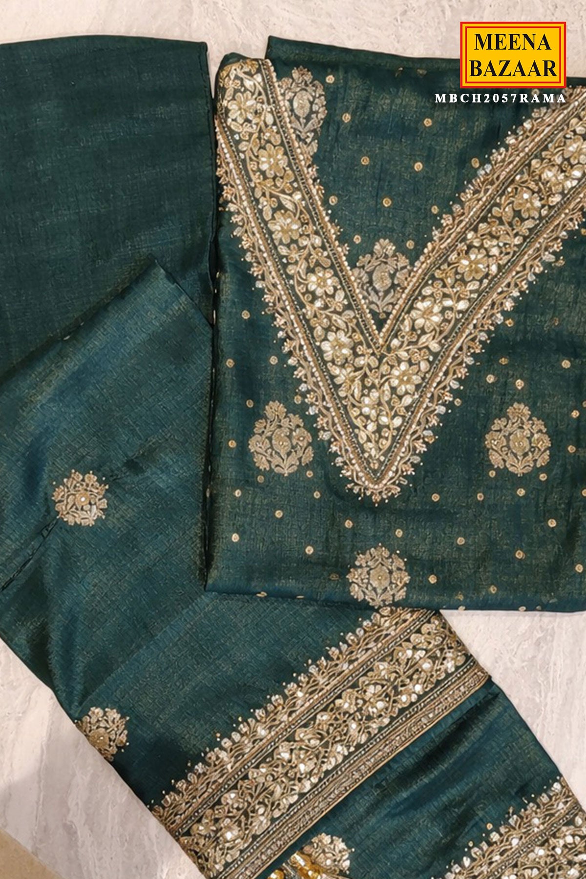 This exquisite deep rama emerald green embroidered suit piece set radiates timeless elegance and festive sophistication. Crafted from a rich, subtly lustrous fabric, the kurta showcases intricate gold floral motifs delicately scattered across the surface, creating a graceful and regal appeal. The highlight of the ensemble is its heavily embellished V-neckline, adorned with detailed zari embroidery, sequins, and fine bead accents that add depth, texture, and a refined shimmer. The straight-cut silhouette and three-quarter sleeves ensure a flattering structure while maintaining all-day comfort and effortless grace.