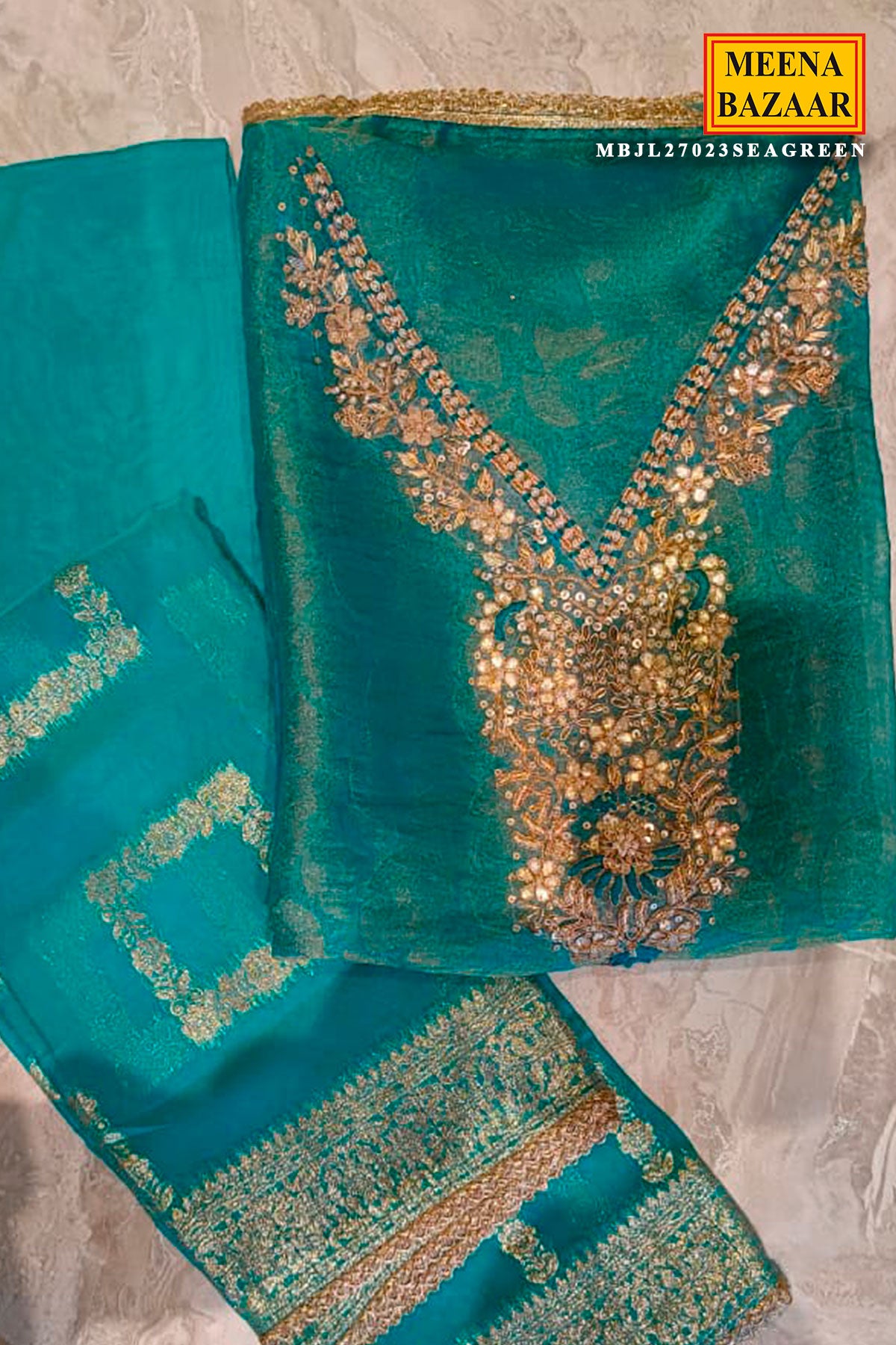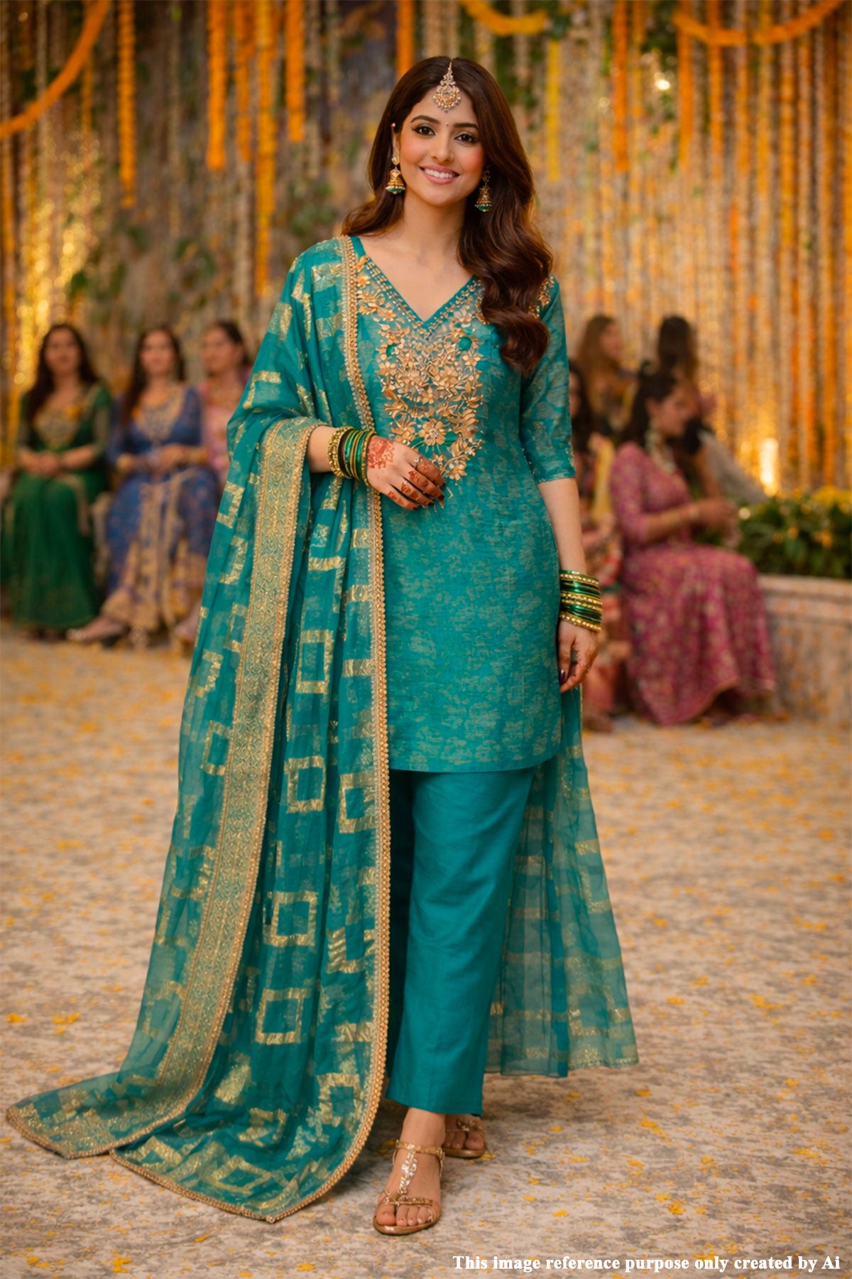 This elegant teal 3-piece suit piece set is perfect for festive and wedding occasions. The kurta fabric features intricate gold zari and sequin embroidery in a beautiful floral pattern along the neckline, adding a rich and regal touch, while the subtle woven texture enhances its overall appeal. It comes with matching teal bottom fabric to be stitched as per your preferred style and fit, along with a dupatta adorned with gold woven motifs and a detailed border that adds graceful movement and festive charm. This unstitched suit set allows you to customize the tailoring to your liking while maintaining a refined and traditional look.