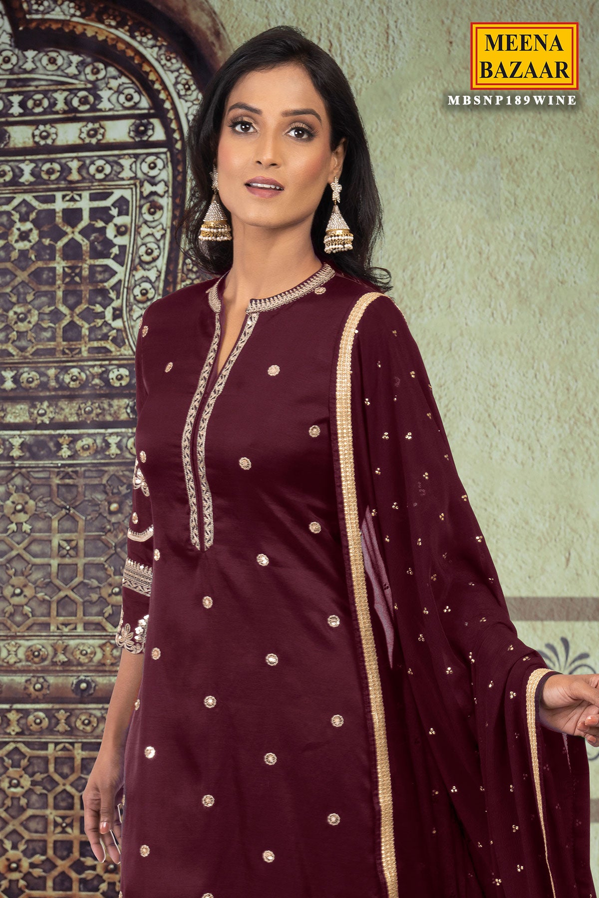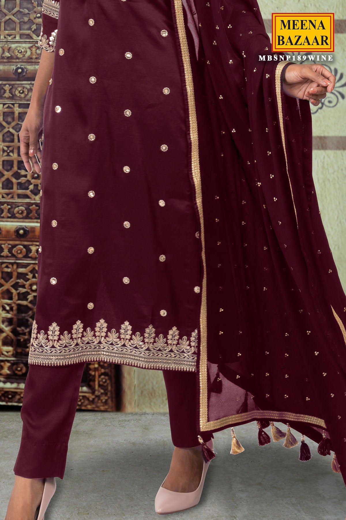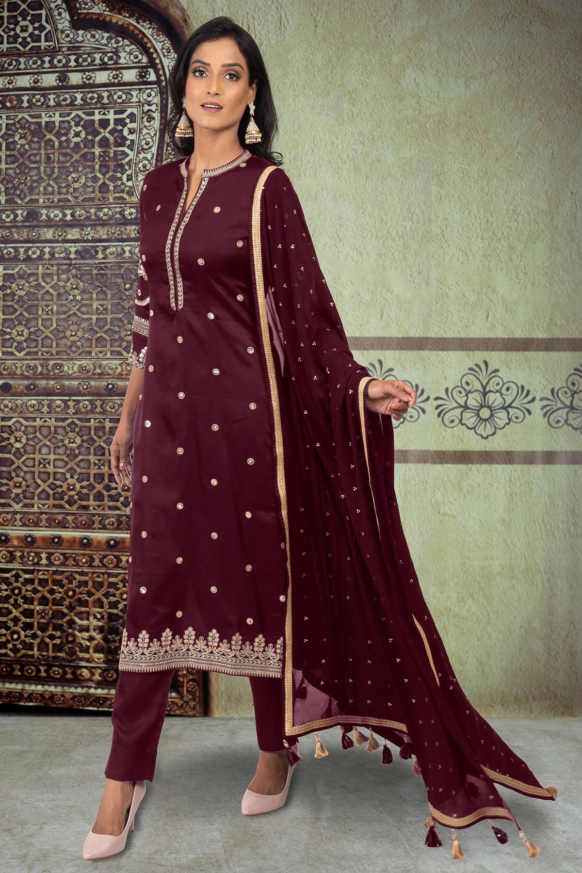 Step into timeless elegance with this Wine Silk Gotta Patti Embroidered Suit from Meena Bazaar, a masterpiece that blends rich tradition with contemporary grace. Crafted from luxurious silk fabric, this suit exudes sophistication with its smooth texture and elegant fall. The deep wine hue adds a regal touch, beautifully complemented by intricate Gotta Patti embroidery, making it perfect for festive and wedding occasions.