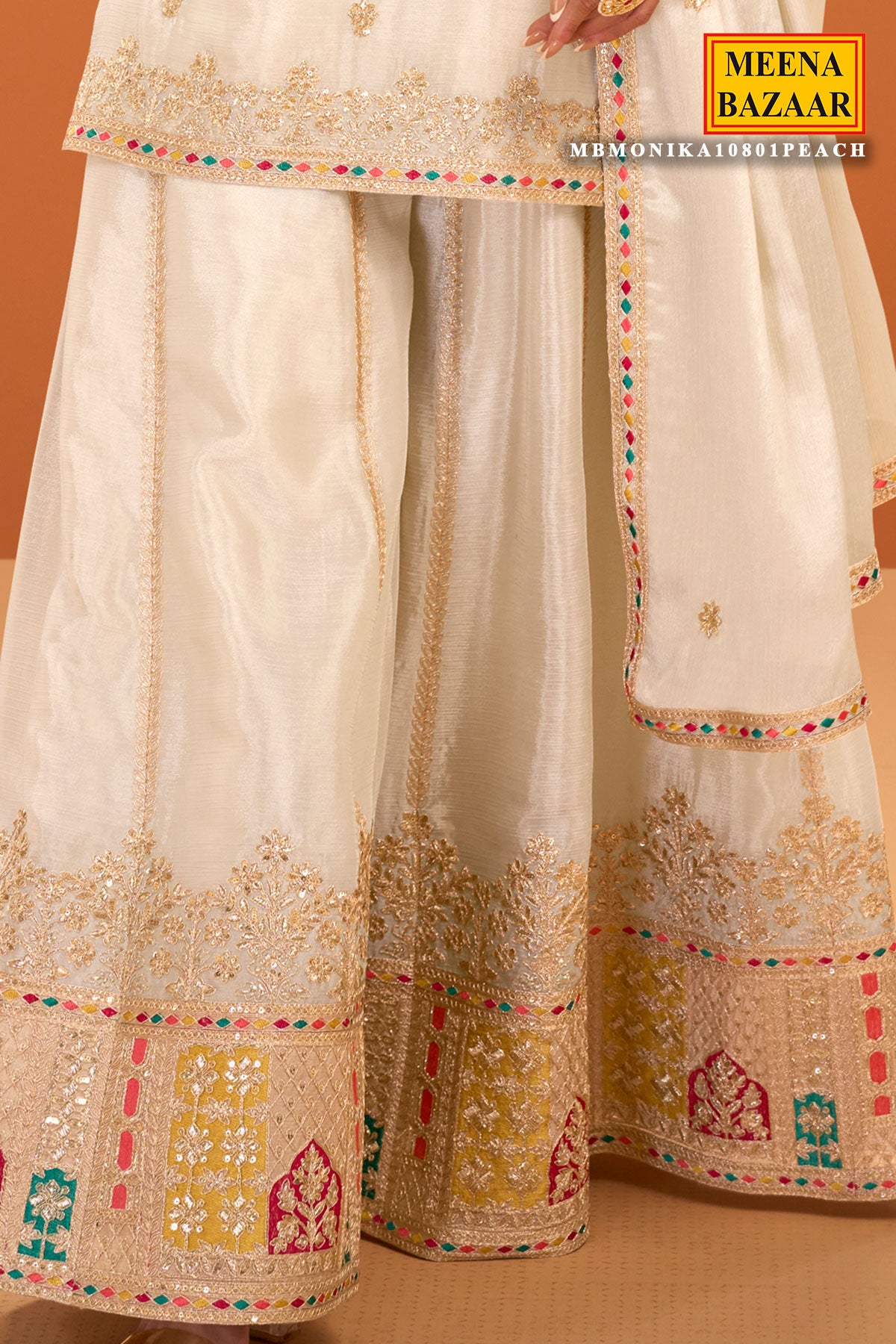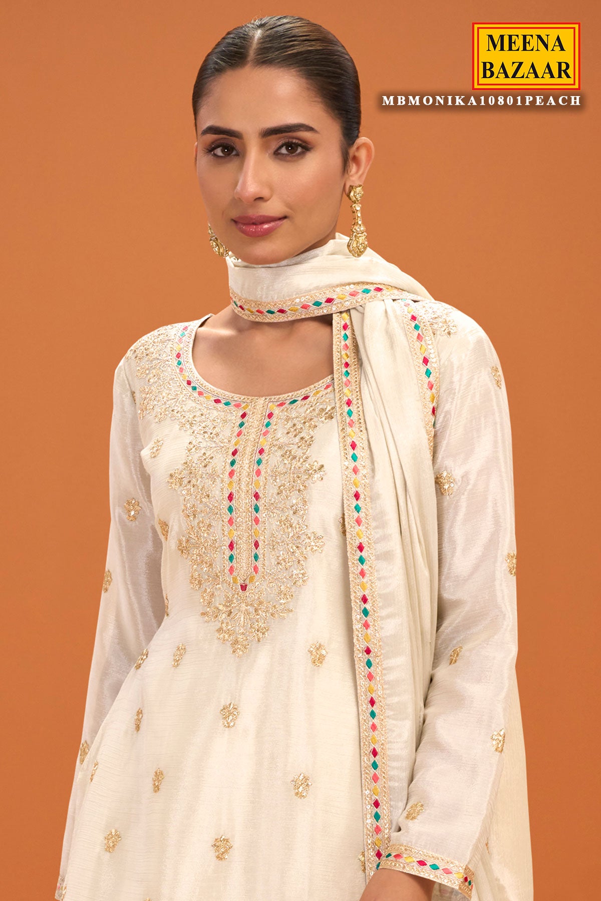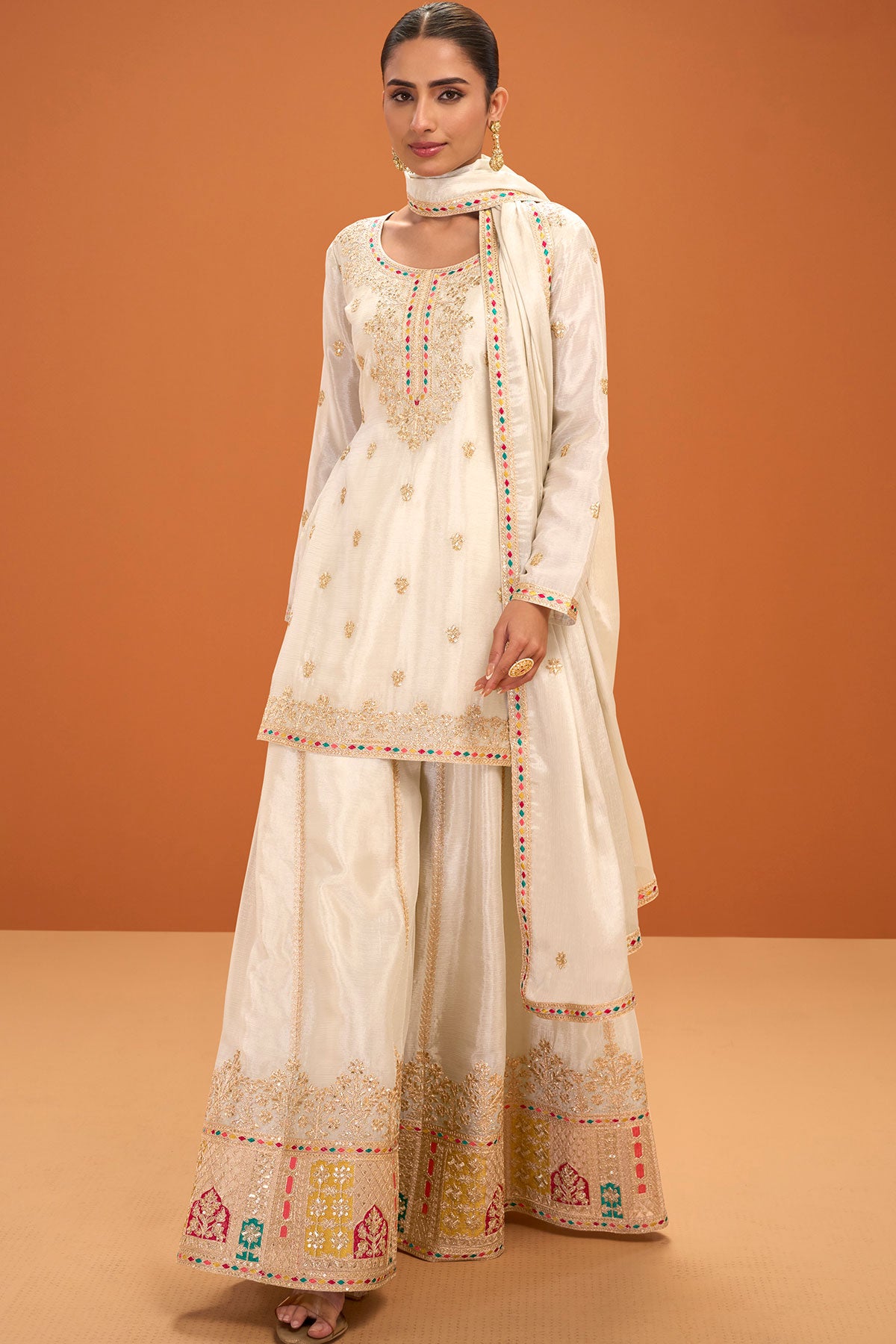 Cream Chinon Embroidered Ready Made Suit- Elegant Festive Wear