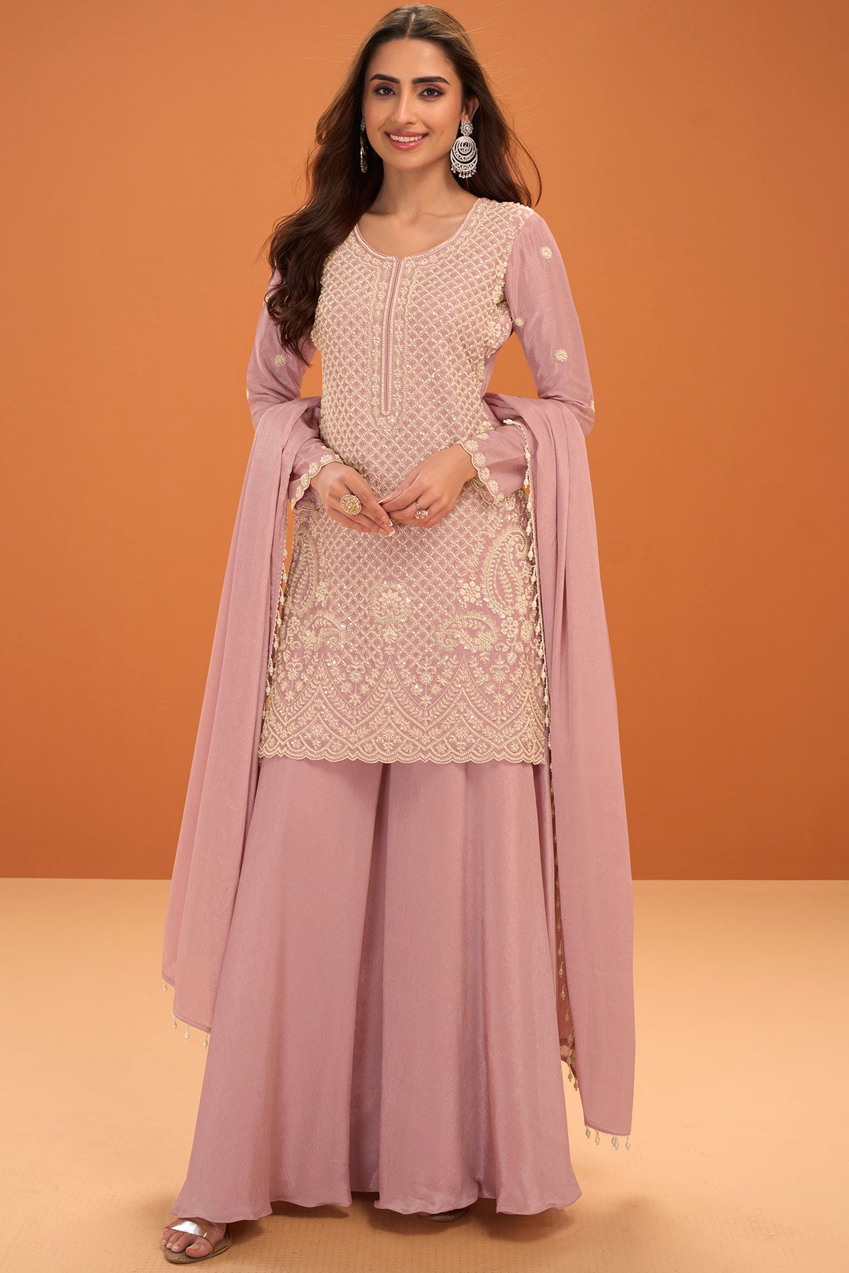 Step into refined elegance with this beautiful Mauve Ready Made Suit crafted in premium Chinon fabric. Designed to offer both comfort and sophistication, this outfit features delicate embroidery work that enhances its graceful appeal. The soft texture of Chinon ensures a flowy silhouette with a luxurious finish, making it ideal for festive gatherings, celebrations, and special occasions.