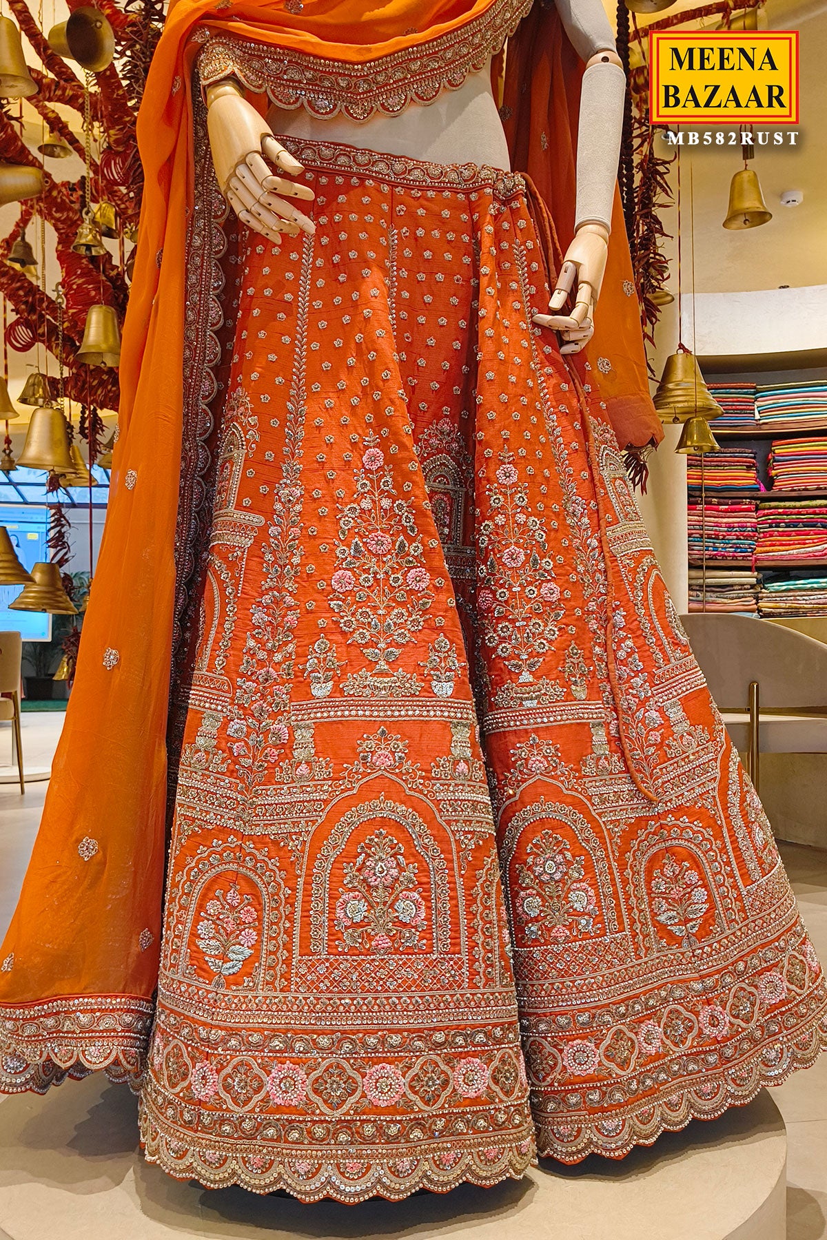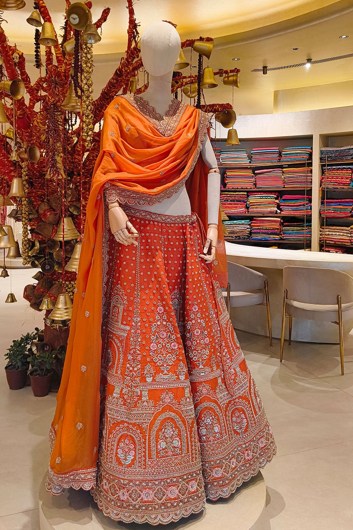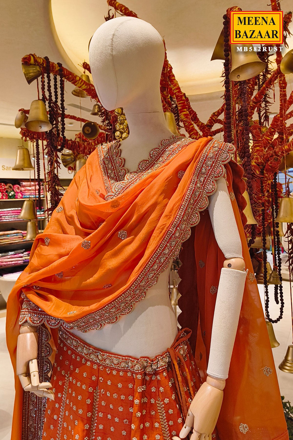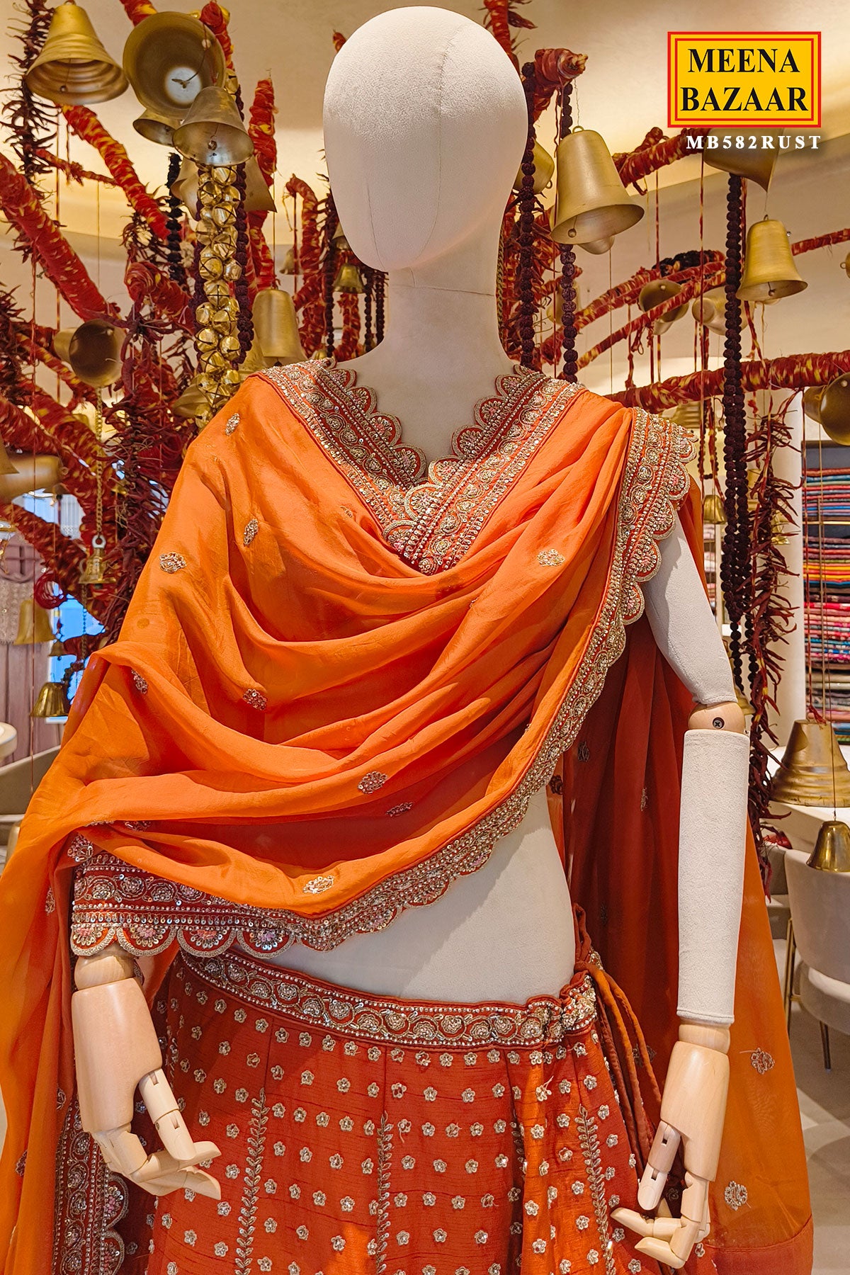 Turn heads with this stunning radiant rust lehenga, crafted to celebrate elegance and tradition. The ensemble features a beautifully flared lehenga adorned with intricate embroidery, forming detailed heritage-inspired motifs along the hemline and body.