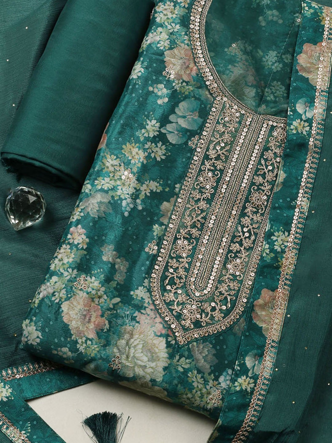 Elevate your ethnic collection with this elegant Rama unstitched suit set crafted in smooth Crepe fabric. Beautiful embroidery work adds a touch of sophistication, making it perfect for festive occasions, casual gatherings, or graceful everyday wear. The rich rama hue enhances its charm, while the unstitched format lets you customize the fit and style exactly to your preference.