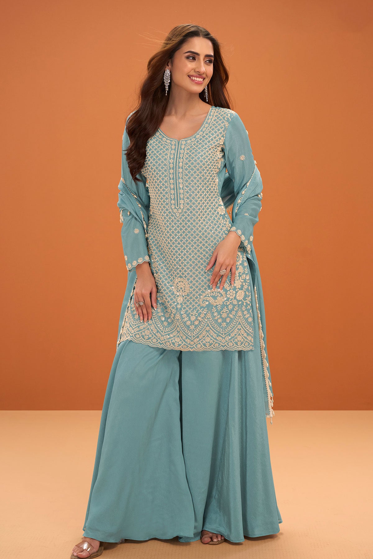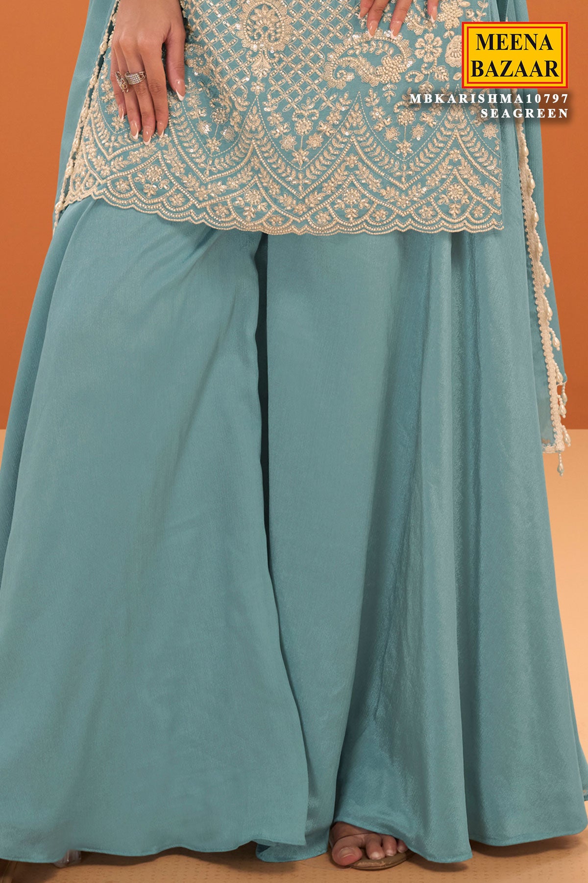 Step into refined elegance with this Sea Green Ready Made Suit, crafted in luxurious Chinon fabric that offers a soft flow and graceful drape. The outfit is beautifully enhanced with delicate embroidery work, adding a sophisticated charm perfect for festive occasions, family gatherings, and special celebrations.